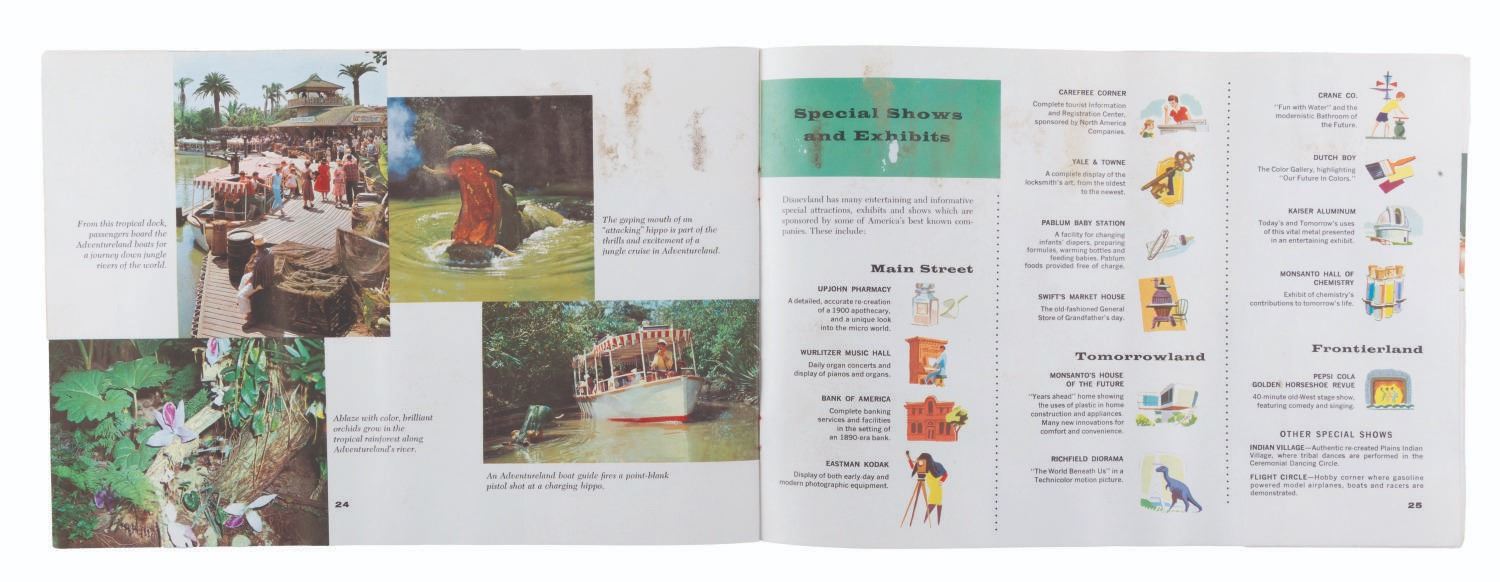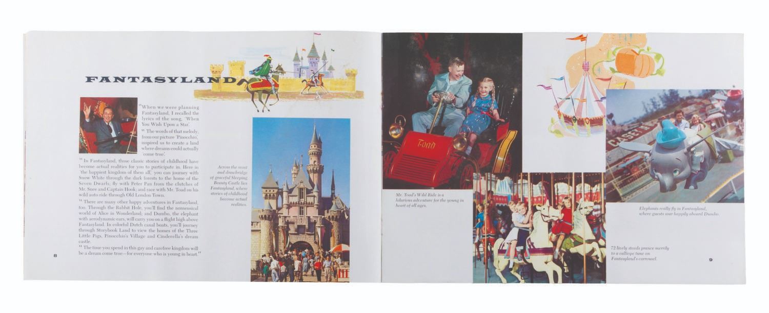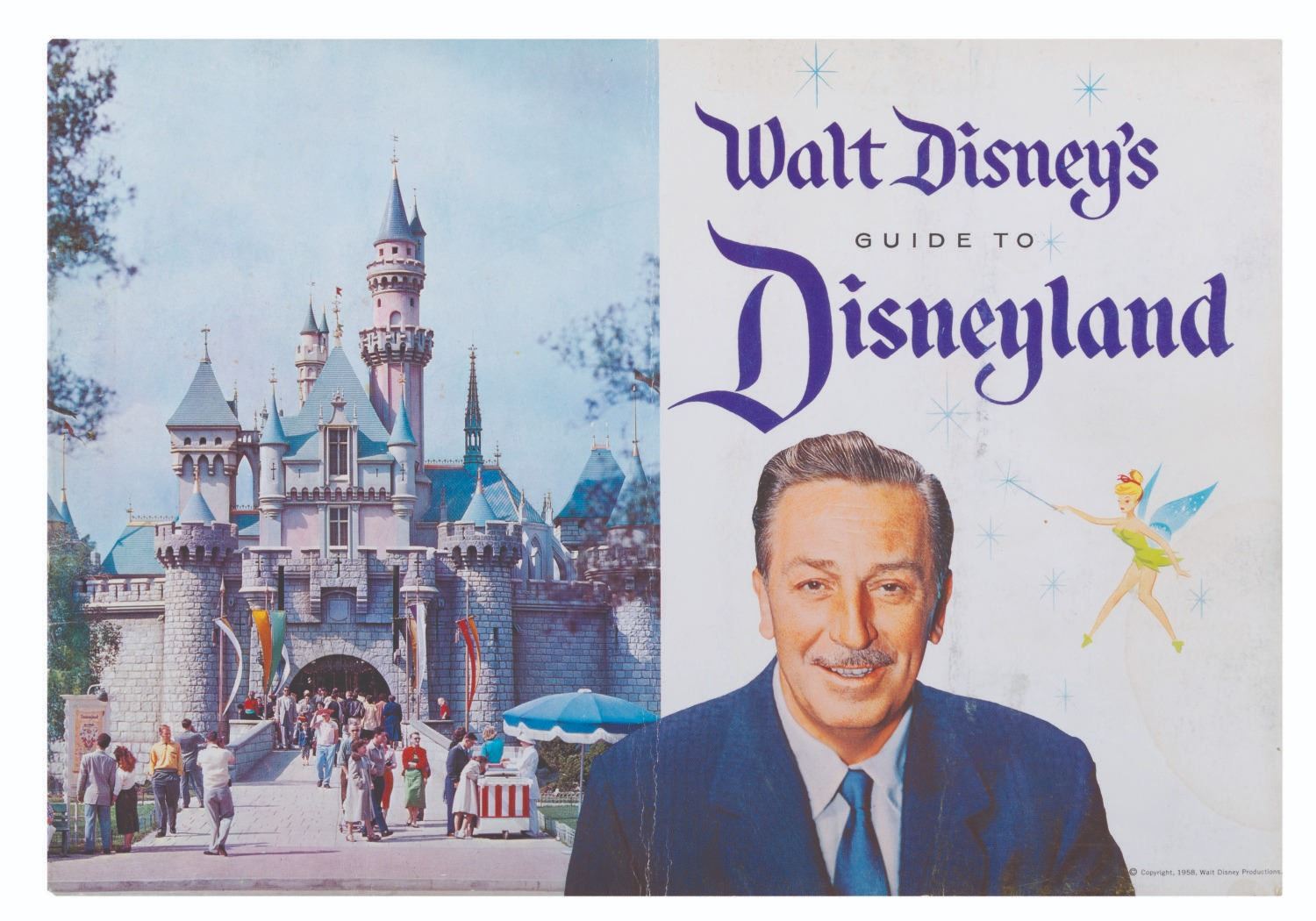 (Disneyland, 1959) An early guidebook from Disneyland titled, "Walt Disney's Guide to Disneyland." This softcover booklet features sections with colorful images of early attractions like the Viewliner Train, 20,000 Leagues Under the Sea, Frontierland's Marshall Lucky, the Horse-Drawn Fire Engine, Midget Autopia, and more. This edition includes illustrations of the soon-to-open Alice in Wonderland and Columbia, and two special pages dedicated to the Disneyland Hotel and attractions under development - "The Haunted House," "Undersea Voyage," "Liberty Street," and Adventures in Science." Measuring 11.5"x8", this 27-page book is in very good condition, exhibiting moisture stains to the cover, spots of discoloration, fading, creases, scuffs, oxidation to staples, a loose page, and wear.