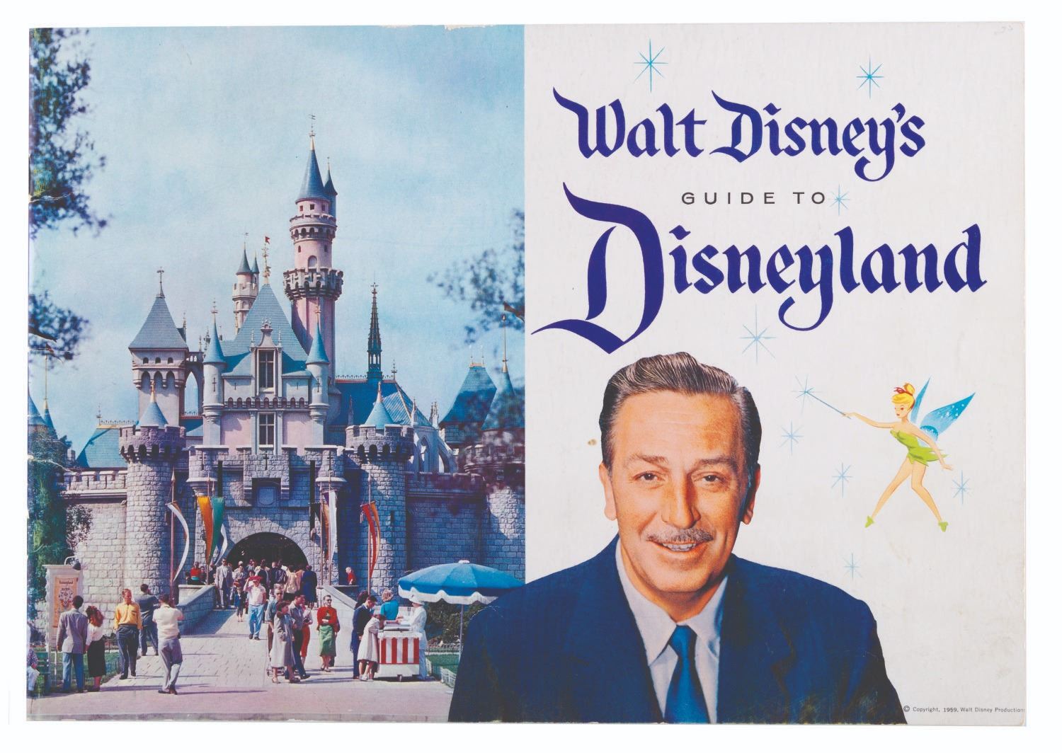 (Disneyland, 1959) An early Walt Disney's Guide to Disneyland. This softcover booklet features sections with colorful images of early attractions like the Viewliner Train, 20,000 Leagues Under the Sea, Frontierland's Marshall Lucky, the Horse-Drawn Fire Engine, Midget Autopia, and more. This edition includes illustrations of the soon-to-open Alice in Wonderland and Columbia, and two special pages dedicated to the Disneyland Hotel and attractions under development: "The Haunted House," "Undersea Voyage," "Liberty Street," and “Adventures in Science." Measuring 8" x 11.5", the guidebook is in good condition with edge wear including light scuffing to the cover.