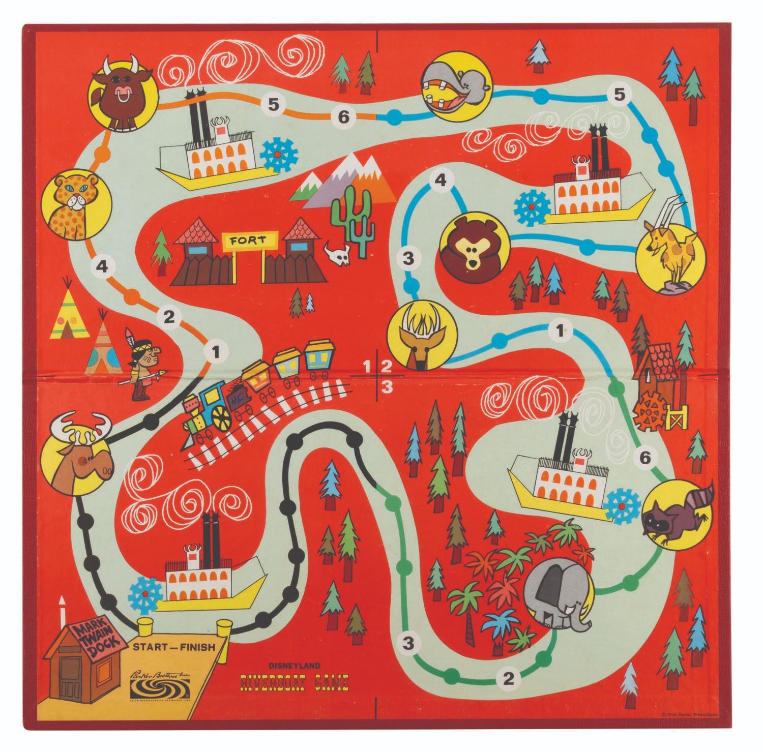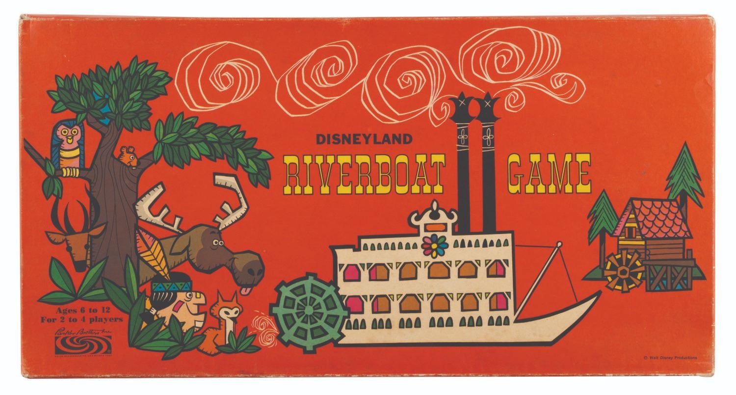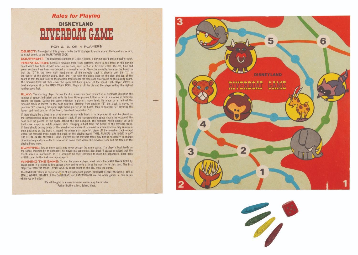 (Parker Brothers, 1960) A Disneyland Riverboat Game manufactured in 1960 by Parker Brothers. The game is complete in the box with board, movable track piece, wooden die, four metal river boat tokens, and instructions. The game is overall in very good condition with typical wear to the box lid and an indentation to the bottom of the box.