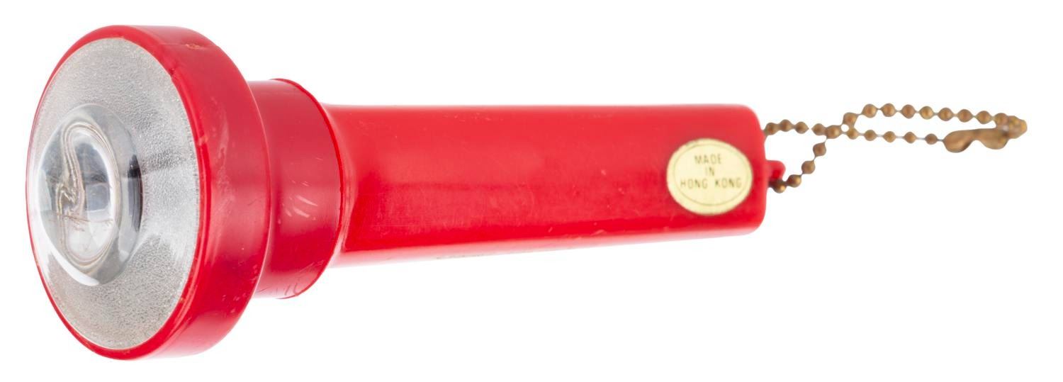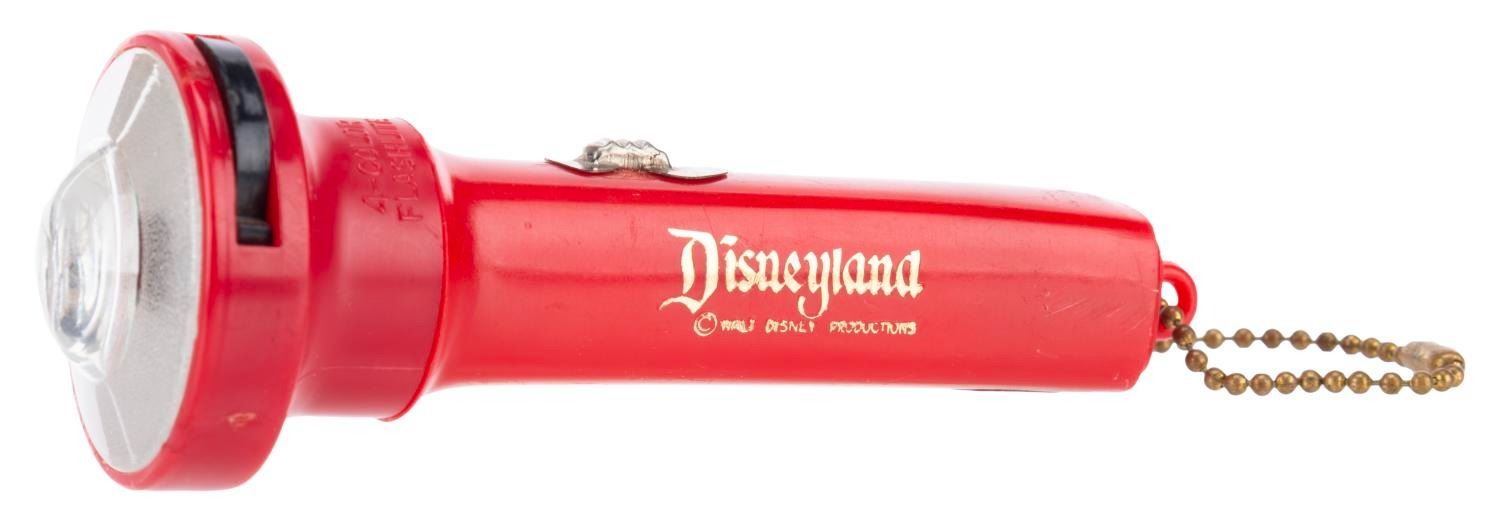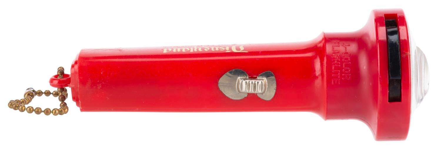 (Disneyland, 1960s) A rare 4-color keychain flashlight from Disneyland with a rotating dial to toggle between colors. Measuring 4" long, the flashlight did not work when tested and displays in good condition with scratches, scuffs, and wear.