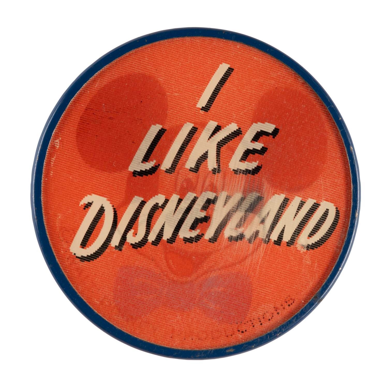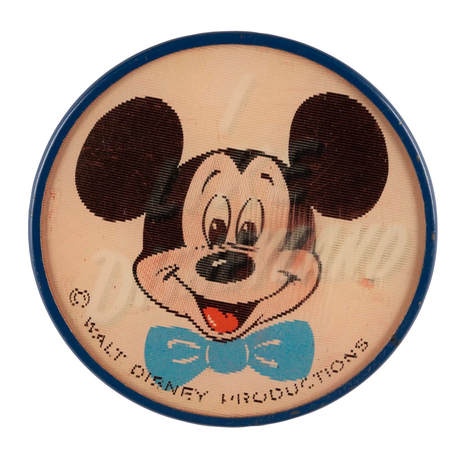(Vari-Vue, 1960s) A Mickey Mouse lenticular pinback button from The Art Corner at Disneyland. Measuring 2.5" in diameter, this piece is in very good condition, exhibiting wear to the printed Art Corner logo on the back.