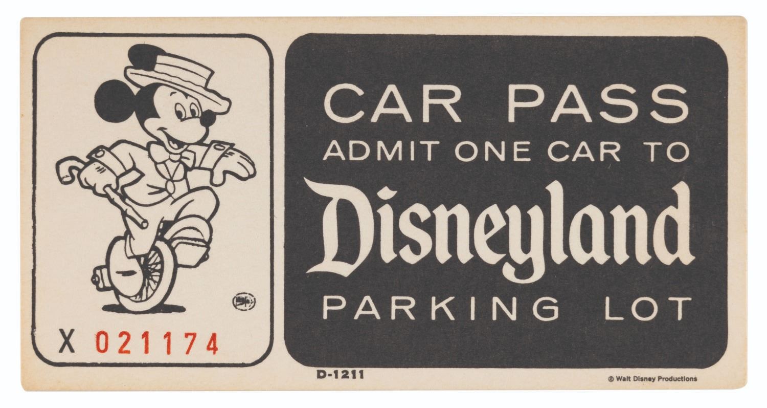 (Disneyland, 1960s) A black and white Disneyland Car Pass, numbered X021174, admitting one car to the Disneyland parking lot. Measuring 2" x 4", the pass is in very good condition with very light discoloration around the edges from age.