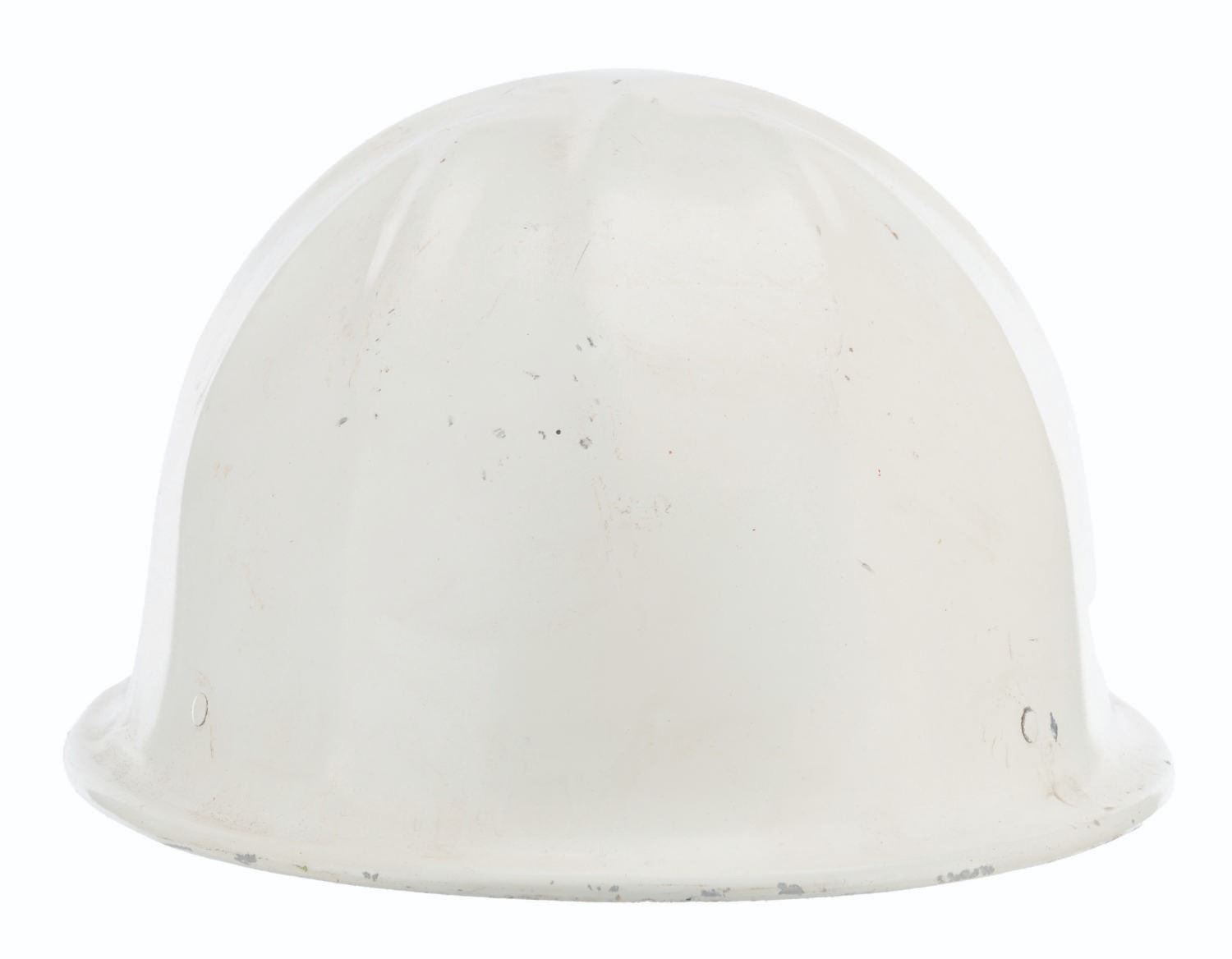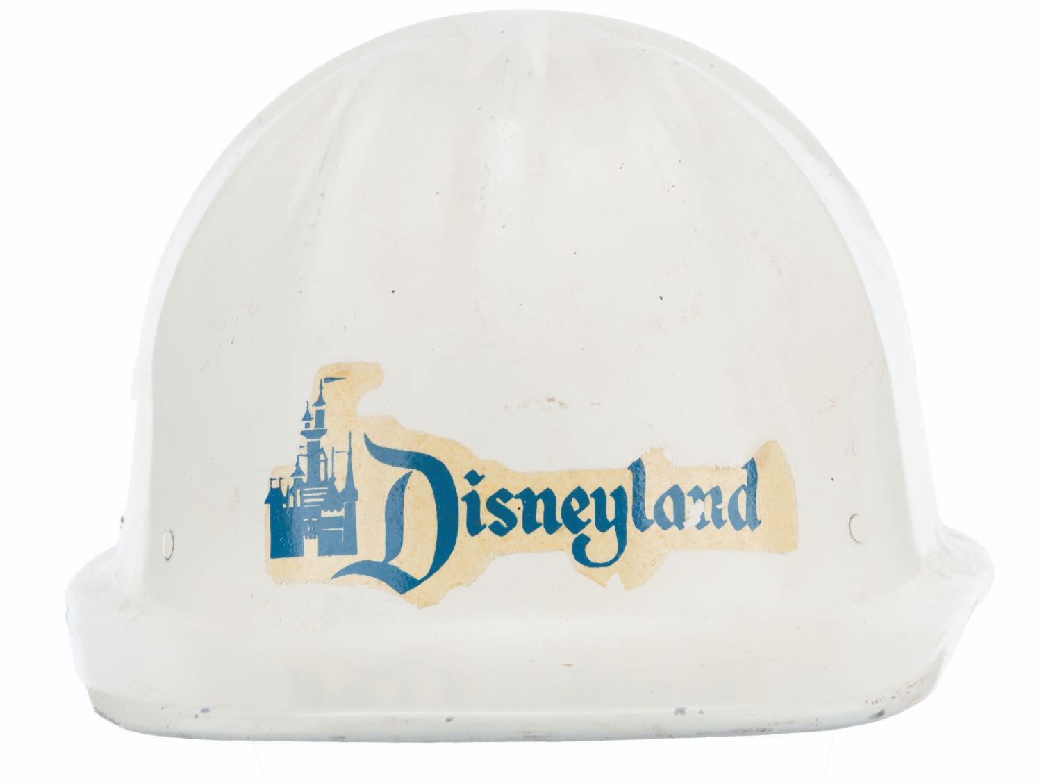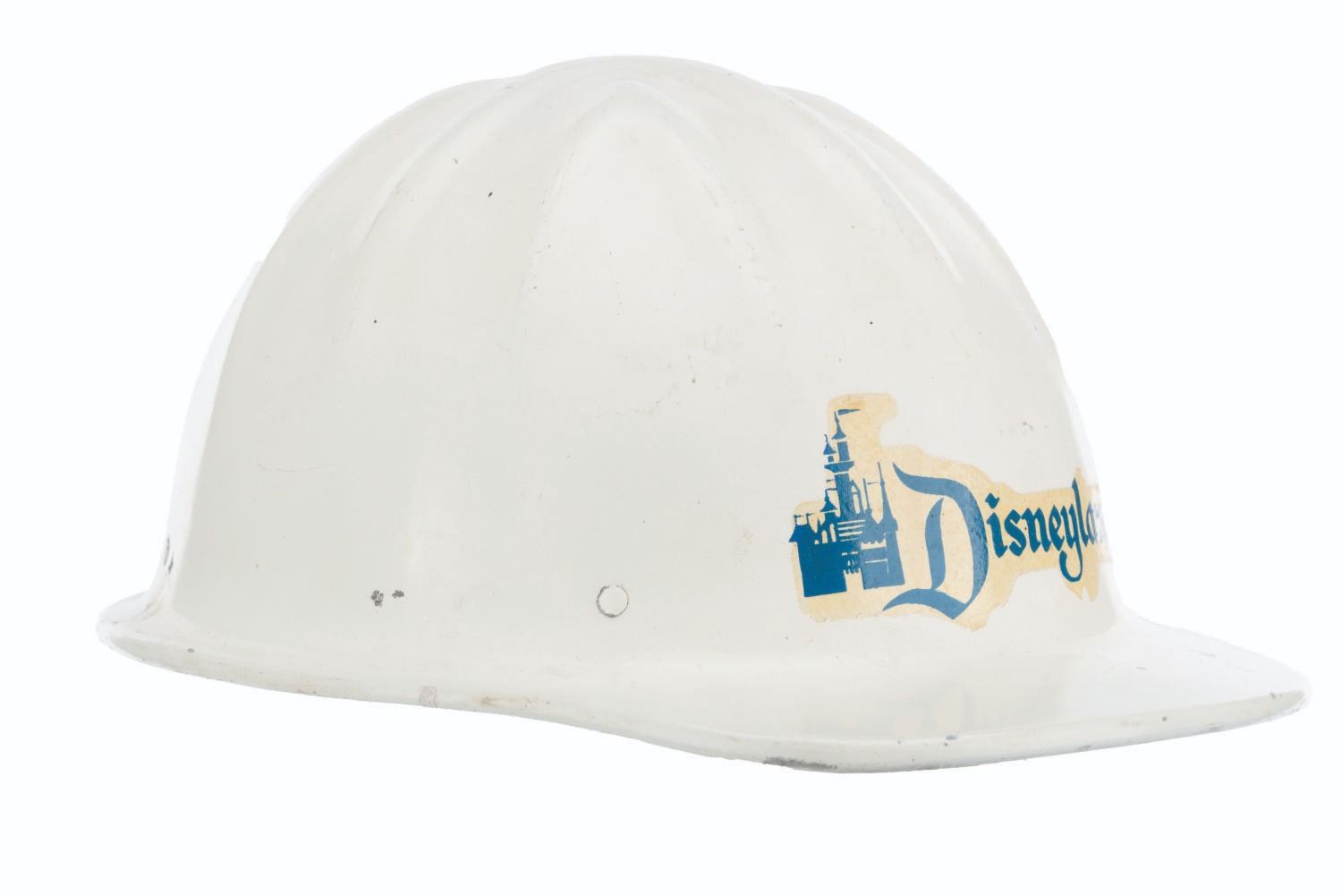 (Disneyland, 1960s) A construction hard hat from the early days of Disneyland. Unlabeled, the hard hat is in good condition with typical scuffs, discoloration from age, sticker loss, and wear from use.