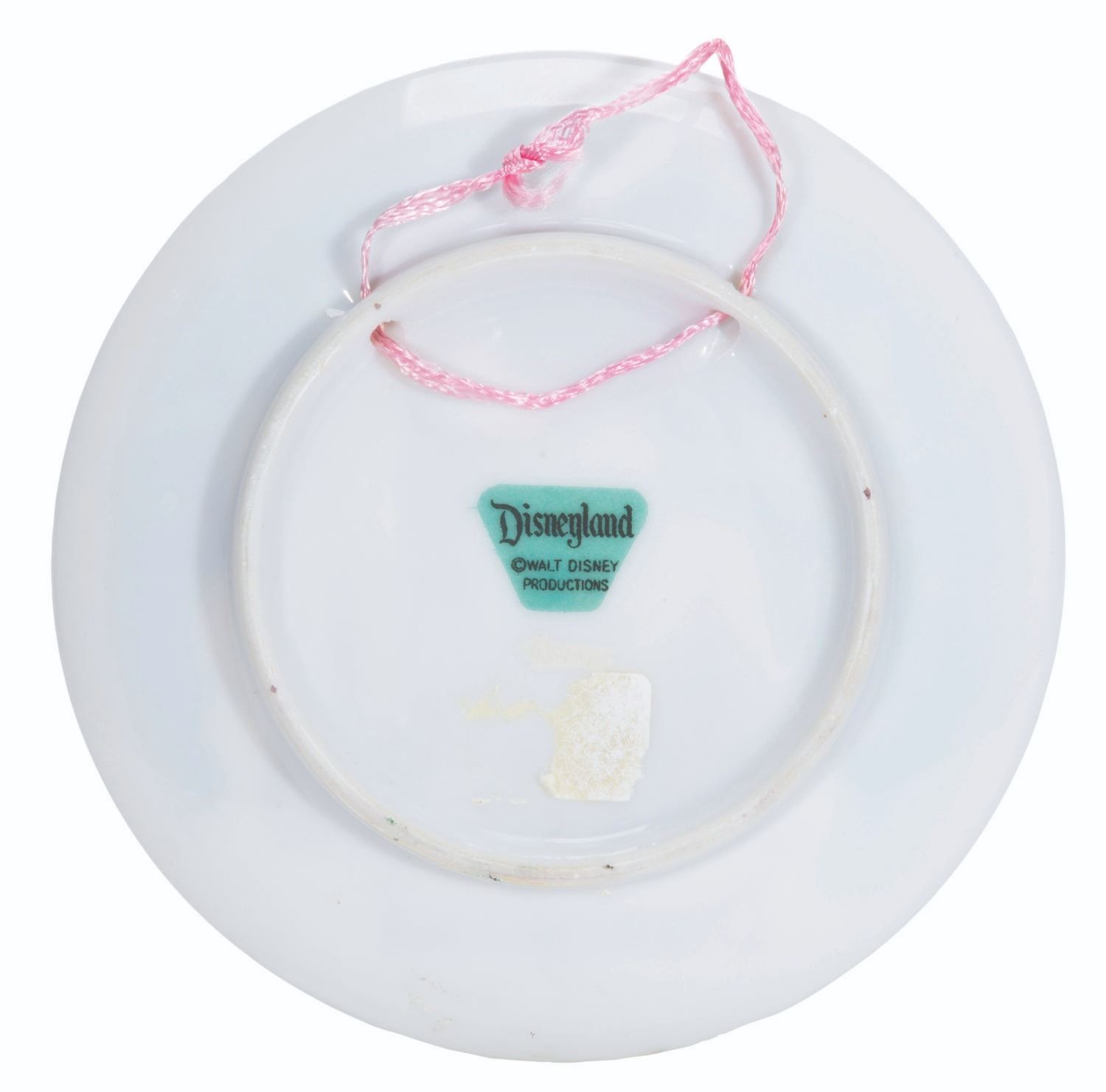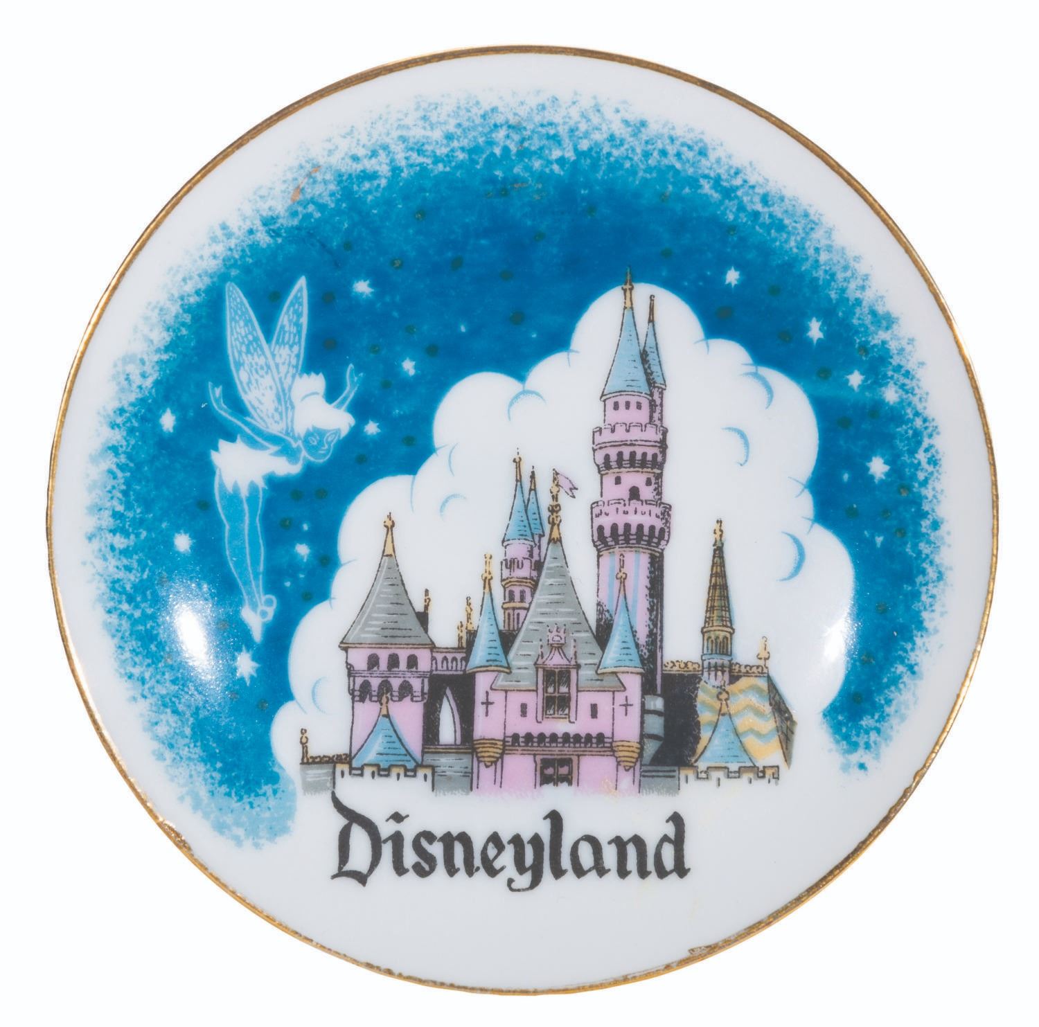 (Disneyland, 1960s) A ceramic souvenir mini plate from Disneyland featuring Tinker Bell and Sleeping Beauty Castle with delicate gold detailing. Measuring 4" in diameter, the plate displays in very good condition with light wear from age.