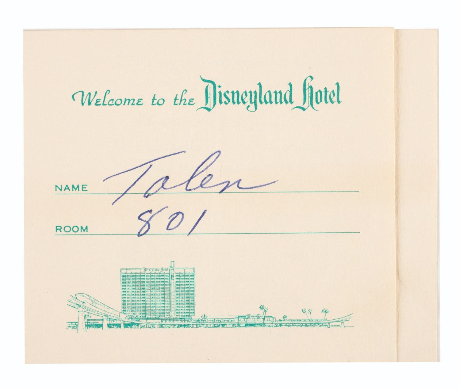 (Disneyland Hotel, 1960s) A Disneyland Hotel Welcome Card with a “complimentary round on the miniature golf course.” Measuring 4.5" x 3.75", the card is in very good condition with the Guest name and room number written in, faint creases, and paper residue on the back likely from scrapbook mounting.