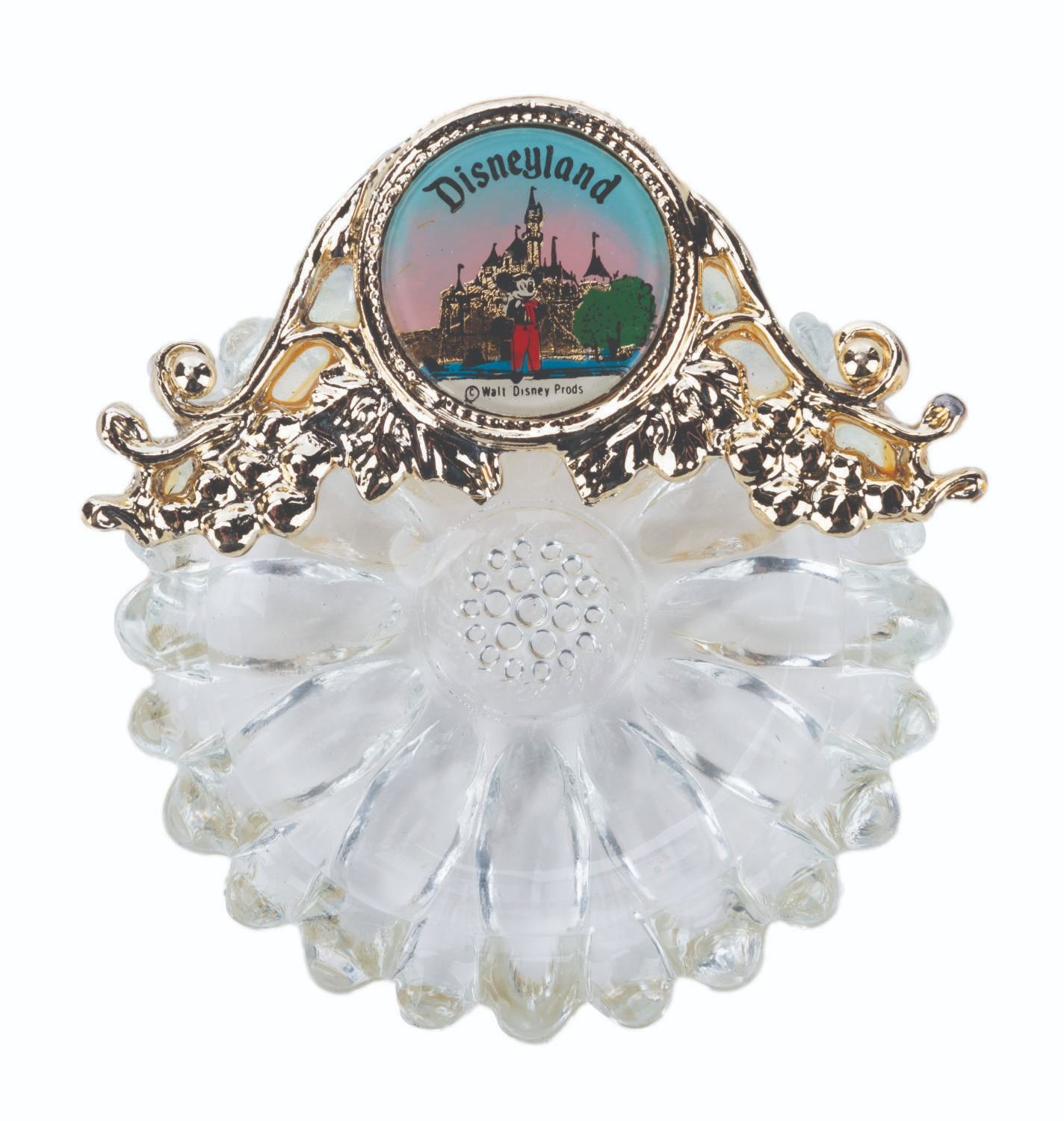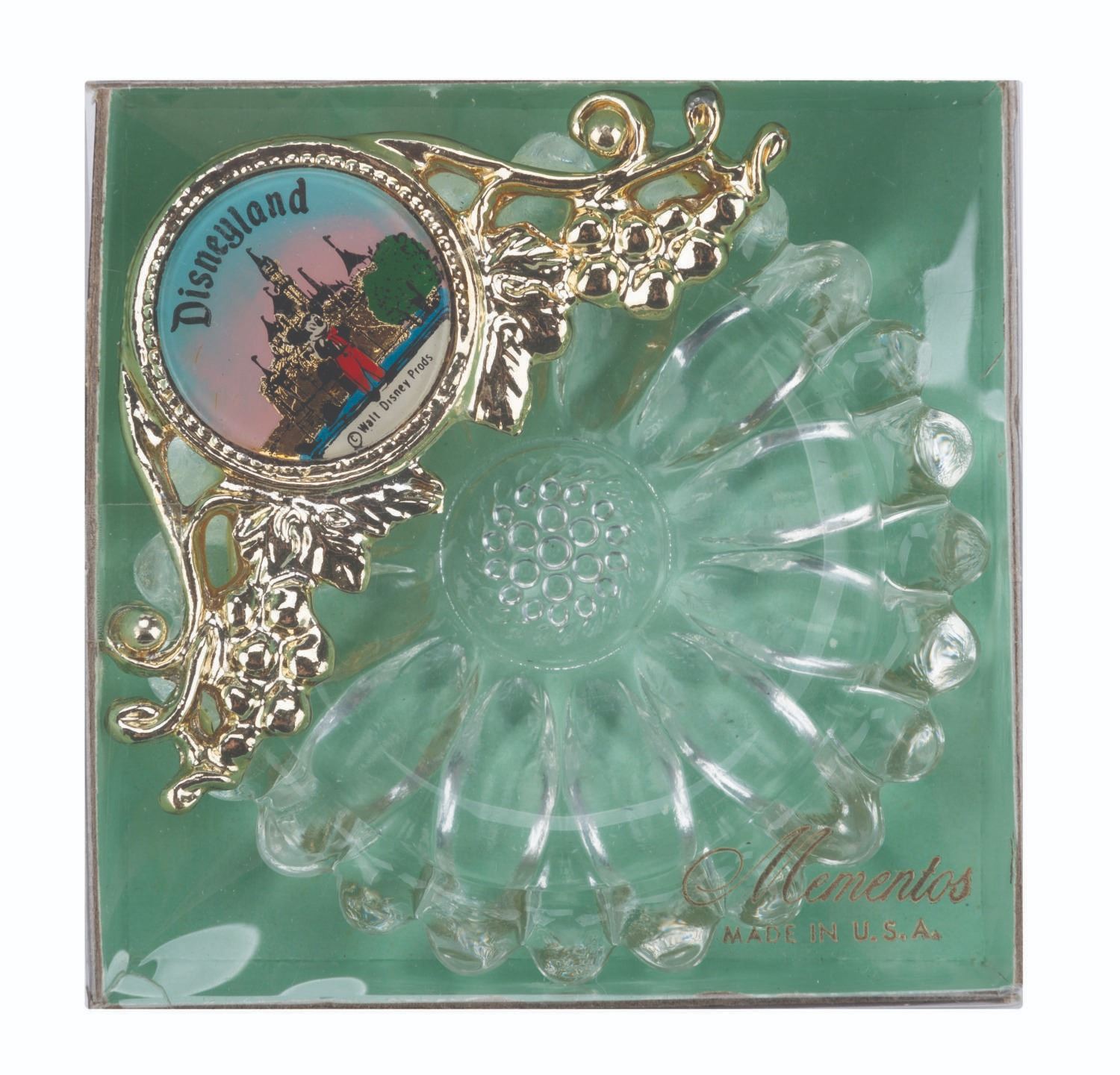 (Mementos, 1960s) A crystal jewelry and trinket dish souvenir of Disneyland. The dish features a gold finish metal garland with a medallion featuring Mickey Mouse and Sleeping Beauty Castle. Measuring 3.5” in diameter, the piece is in fine condition. The souvenir is packaged within its original 3.5” x 3.5” and 1.5” deep good condition box.
