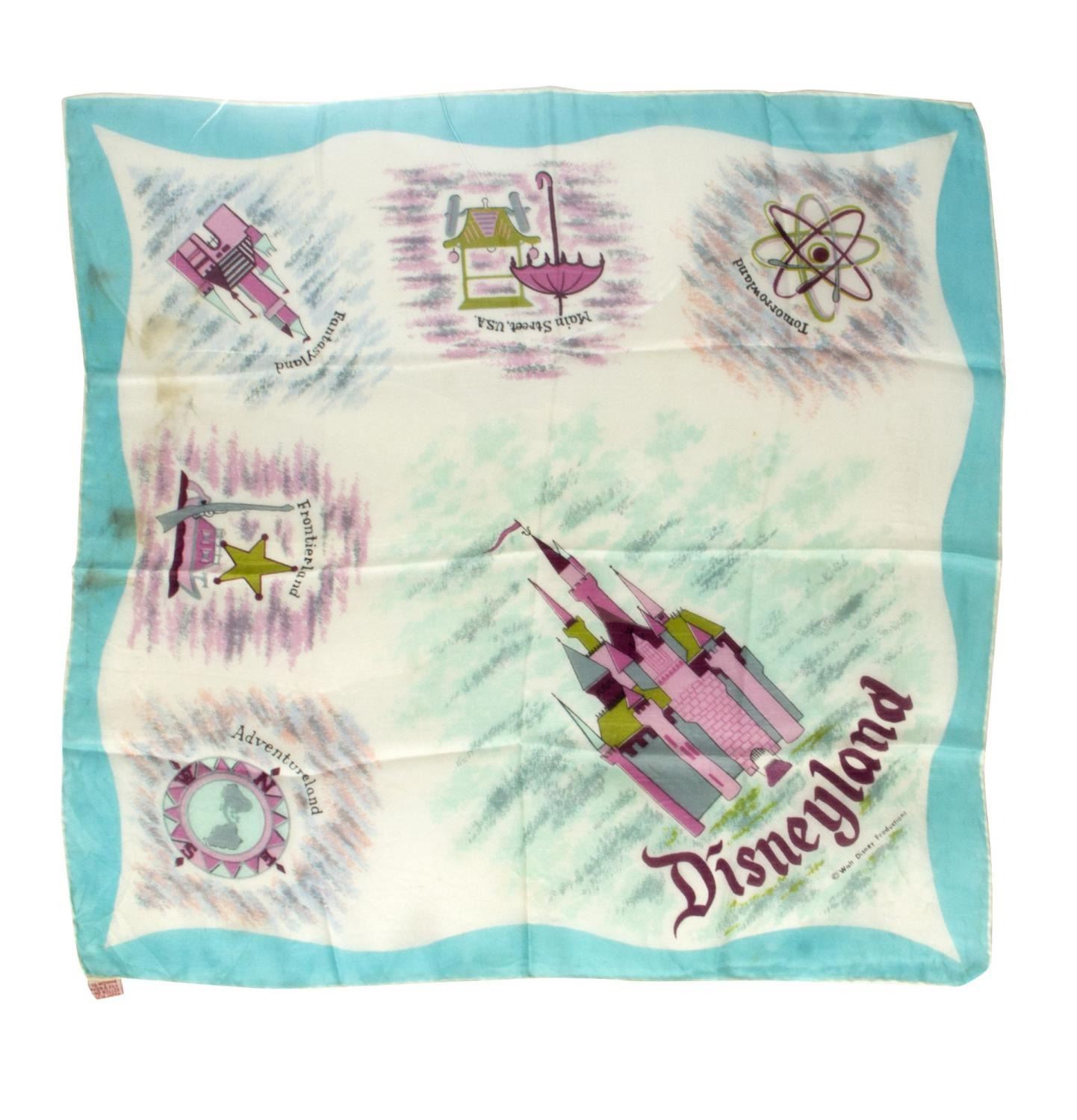 (Disneyland, 1960s) A silk-rayon blend Disneyland scarf featuring Sleeping Beauty Castle with images representing each of the original five lands of the Park. Measuring approximately 17" x 17", the scarf is in good condition with stains, pinholes, and light snags.