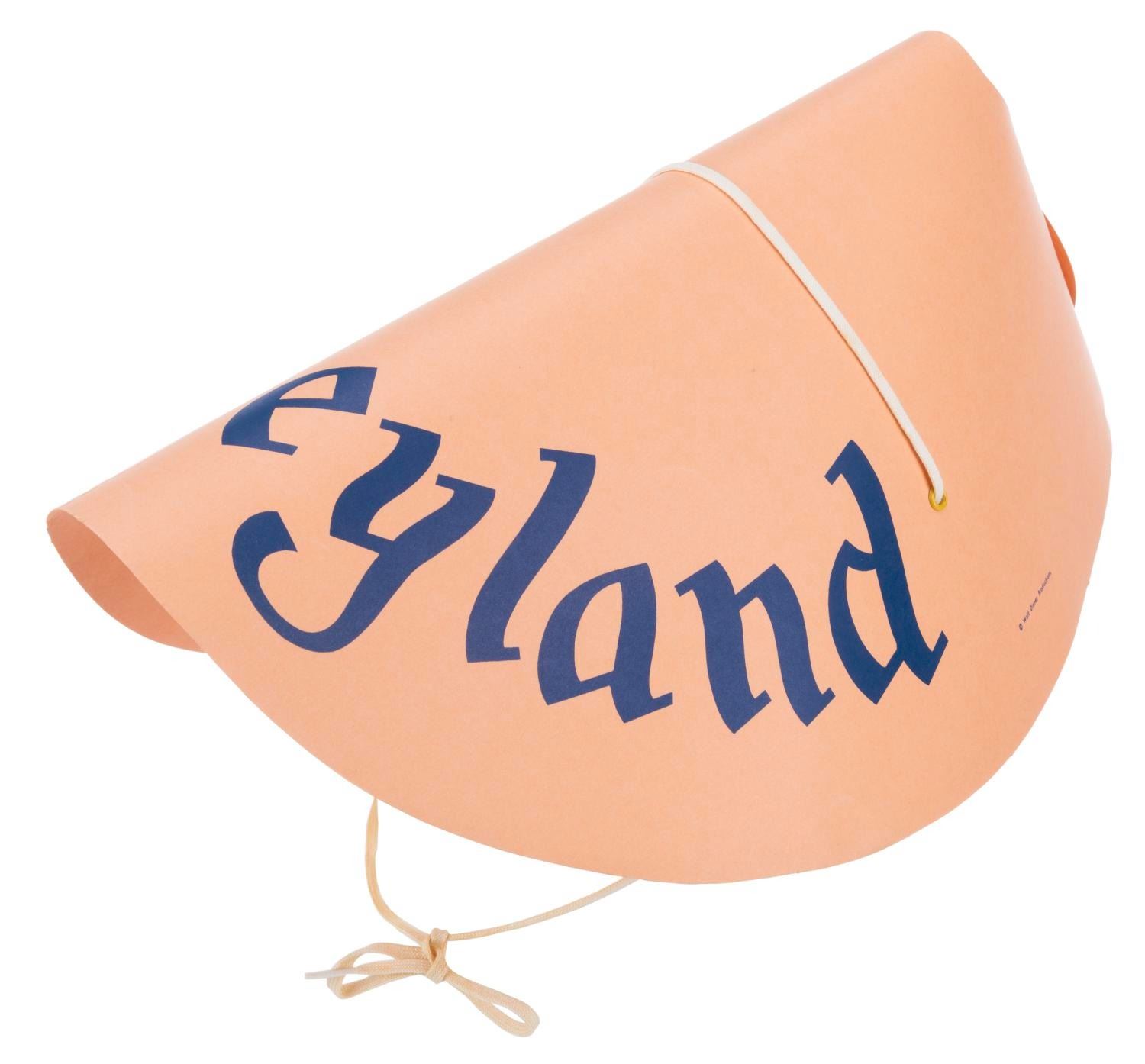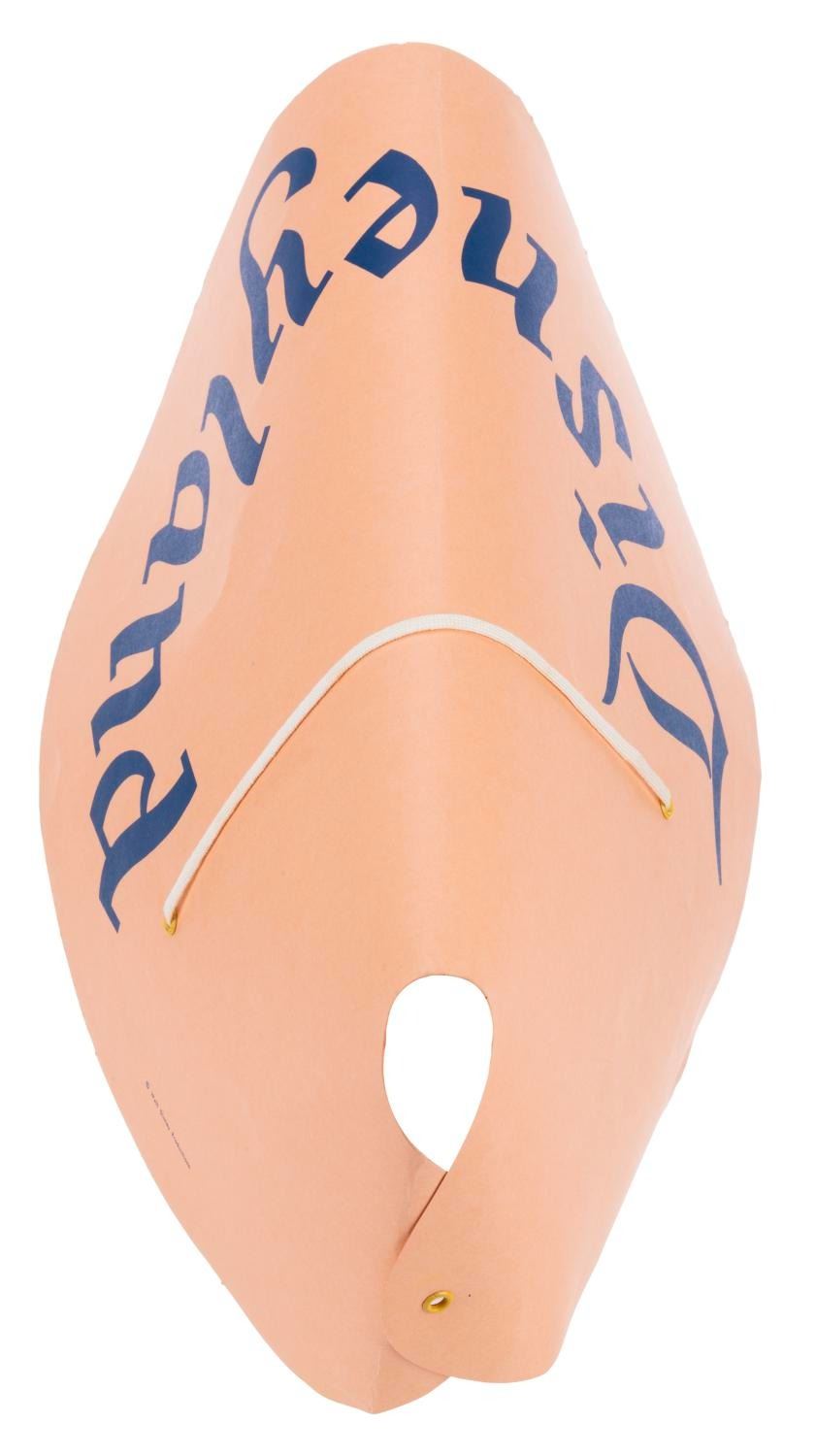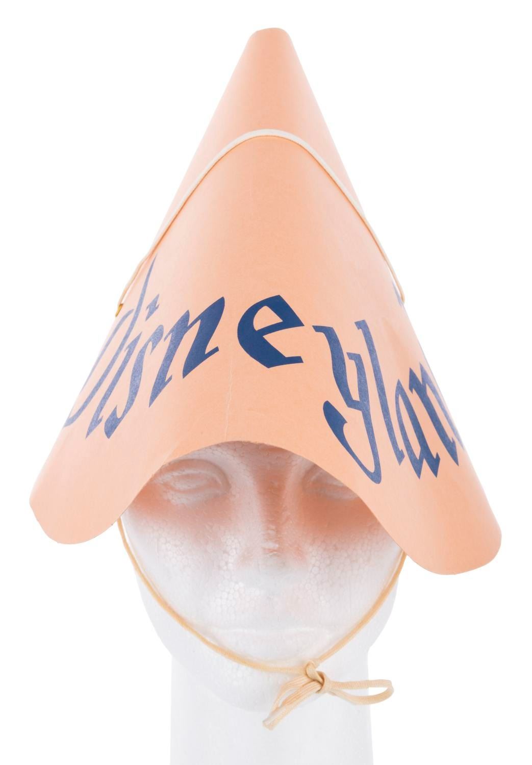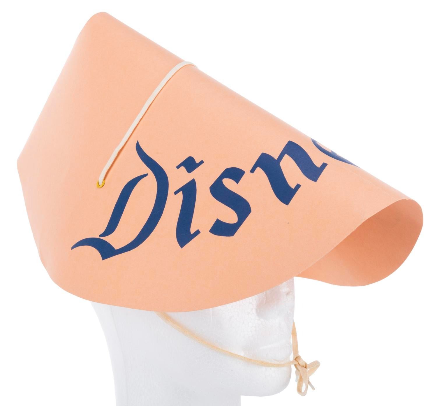 (Disneyland, 1960s) A rare pink paper sun hat from Disneyland, with the Park’s name along the brim. Measuring 13.75” in diameter, the hat is in very good condition with light wear.