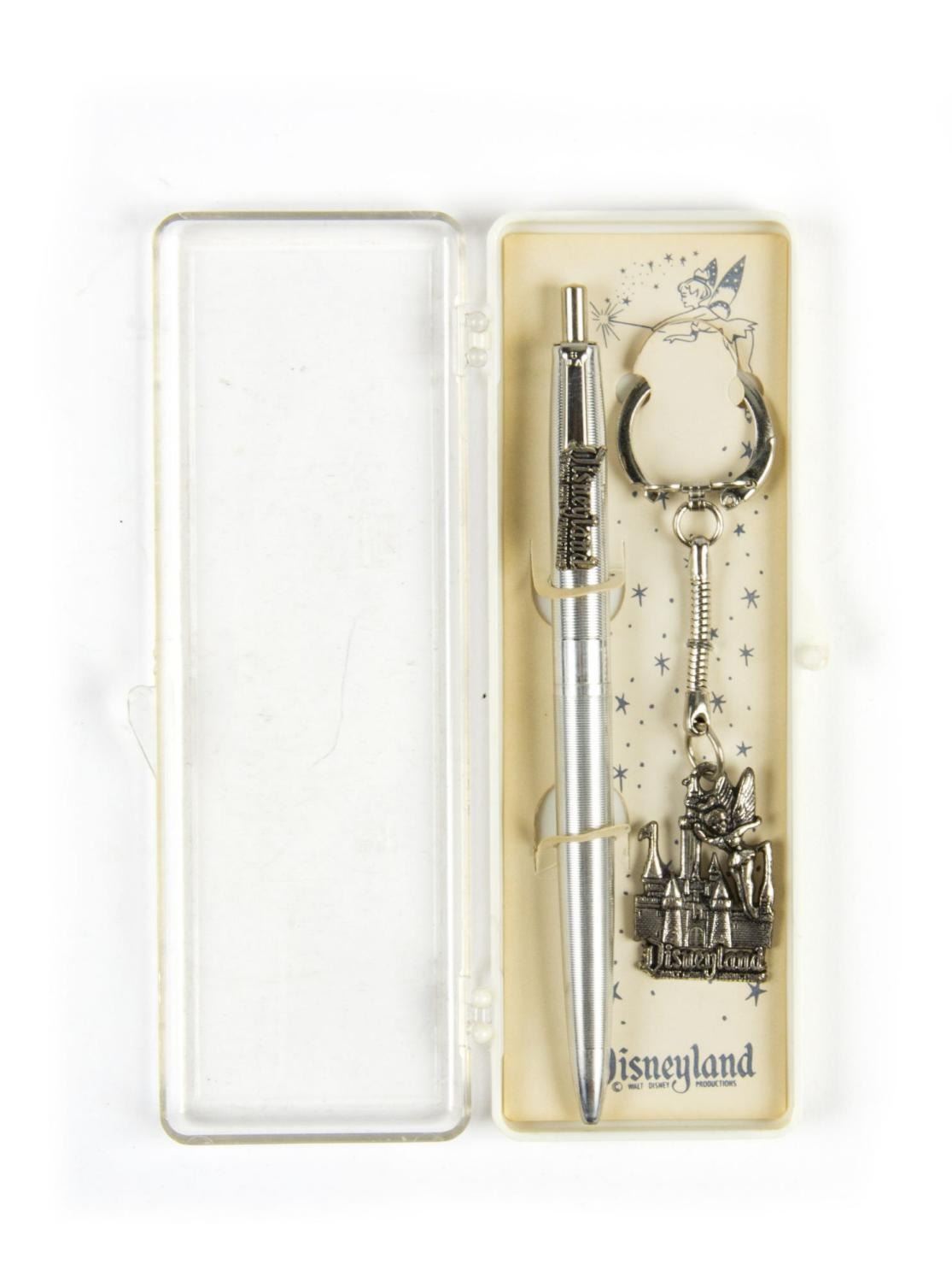 (Disneyland, 1960s) A souvenir pen and keychain set from Disneyland in its original plastic case. The case measures 5.5” x 2” and the set displays in fine condition. The pen has not been tested and likely requires a new ink cartridge.