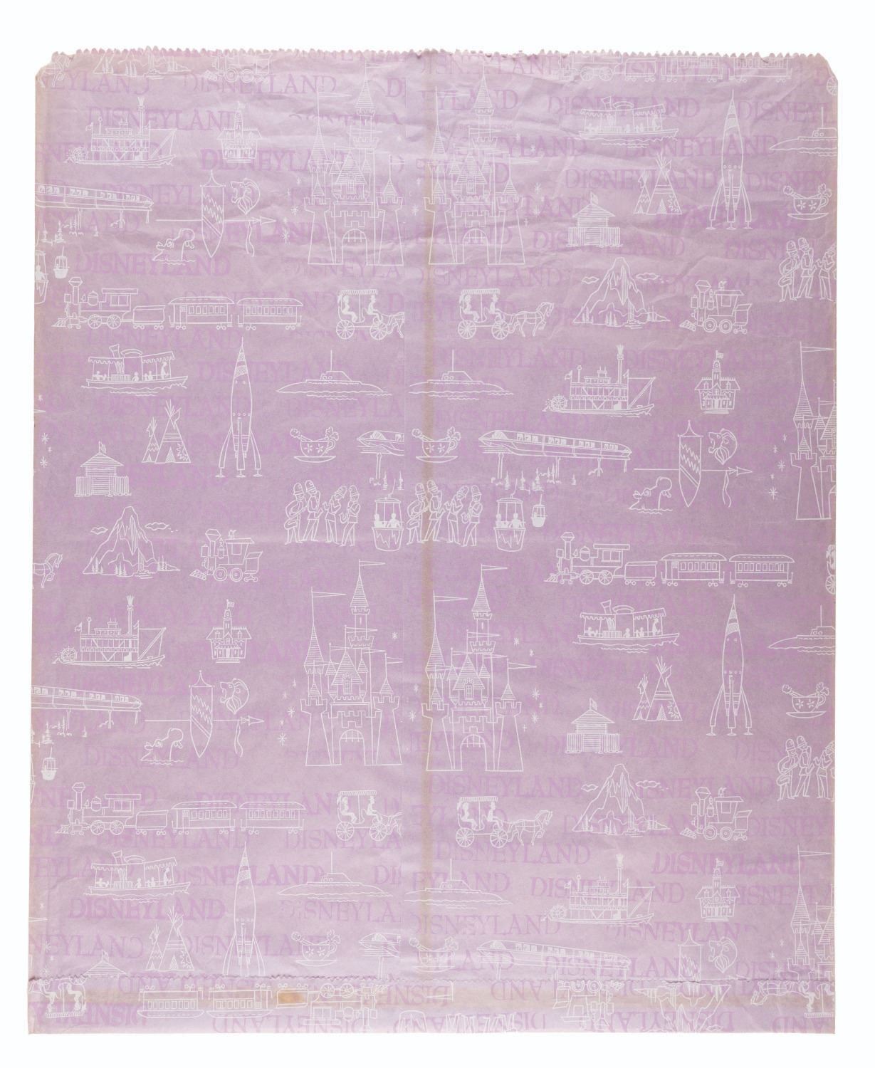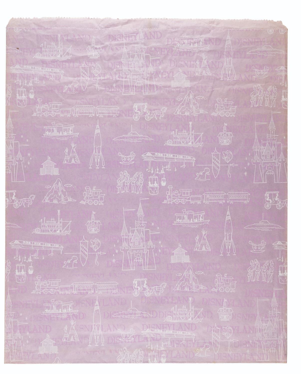 (Disneyland, 1960s) A large purple paper Disneyland shopping bag from the 1960s decorated with terrific mid-century line art of classic attractions such as the Sky Buckets, Indian Village, and many more. Measuring 17.5" x 21.5", the bag is in very good condition, with light wear and light discoloration to the edges from age.