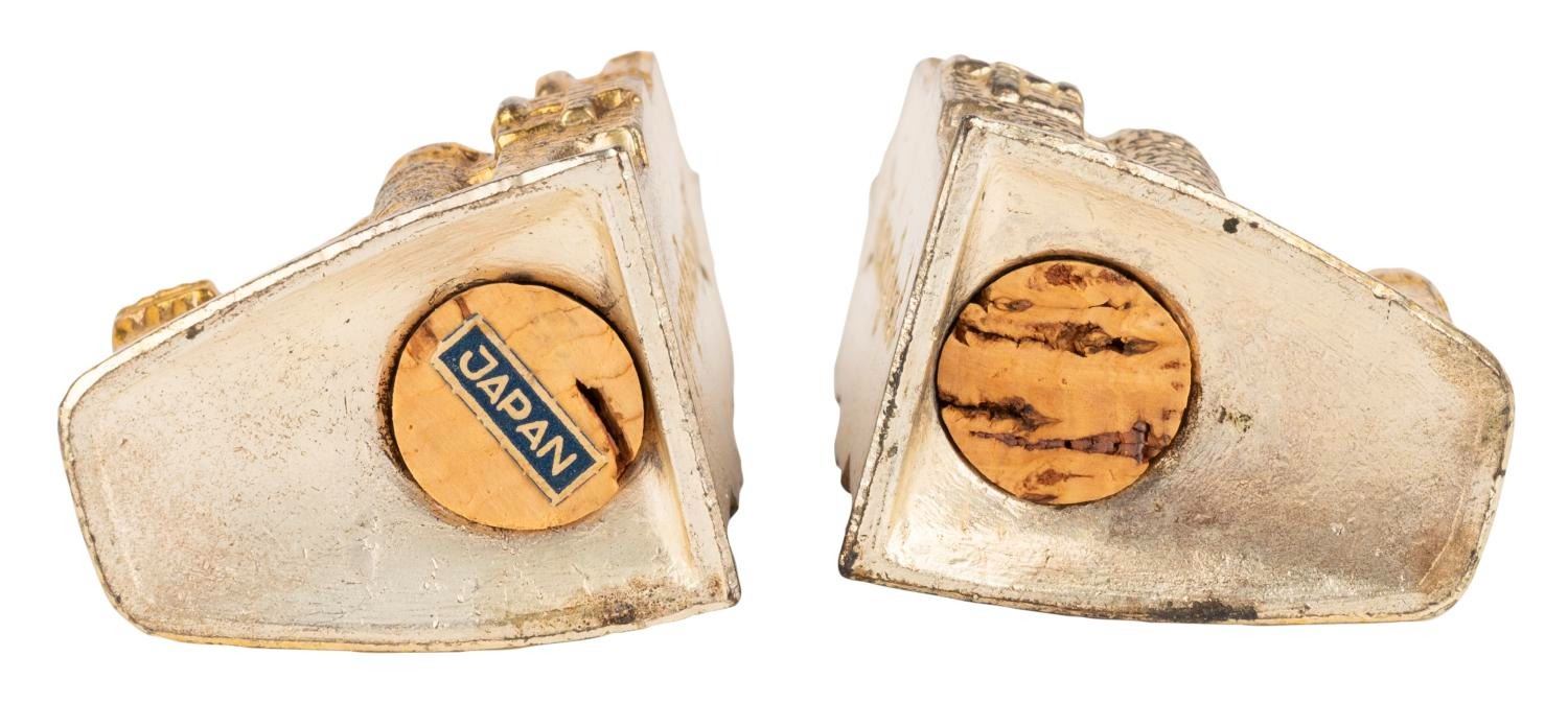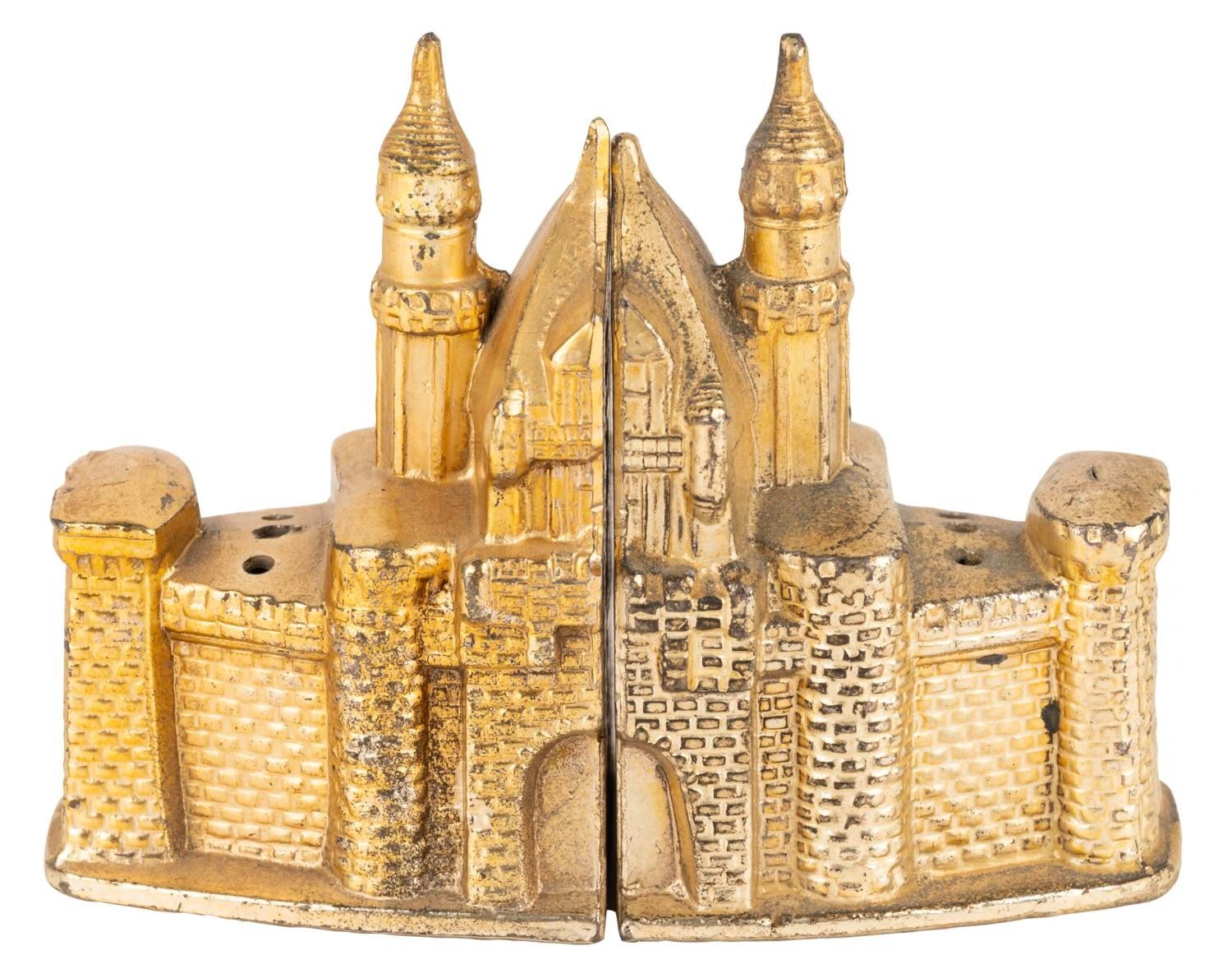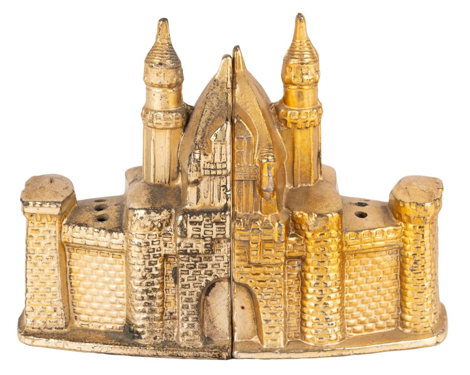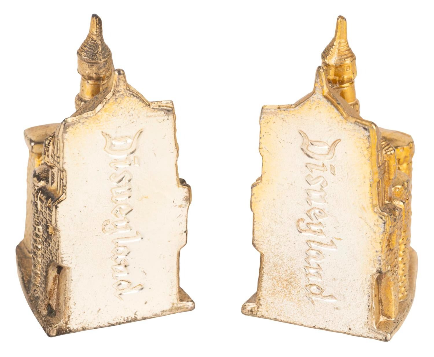 (Disneyland, 1958-60s) A gold-plated salt and pepper shaker set modeled after Sleeping Beauty Castle in Fantasyland. Each shaker forms one-half of the castle and retains its original stopper. This set is two identical pepper halves, as the salt half is missing. Measuring 3.25" wide and 2" tall, the shakers are in good to very good condition with light oxidation, scratches, and wear.