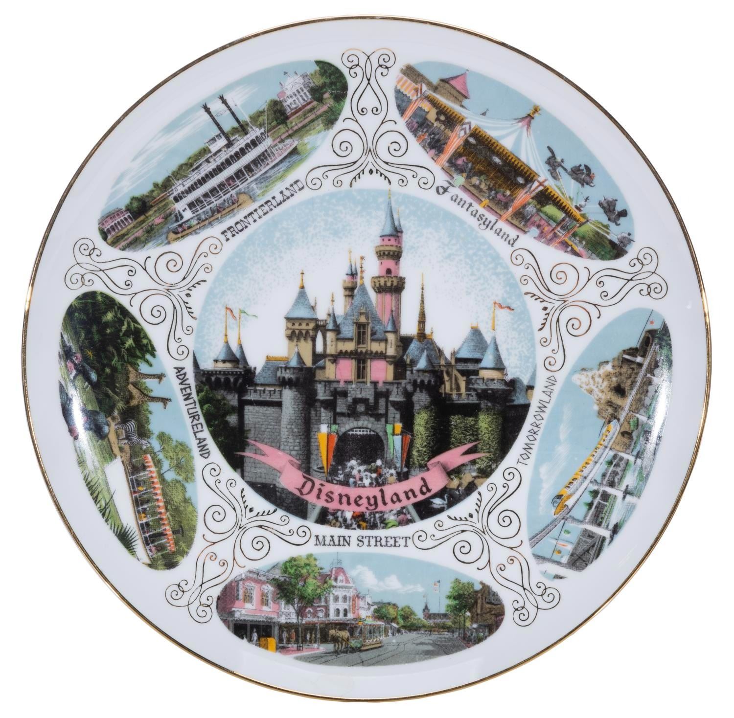 (Disneyland, 1960s) A Disneyland collector's plate richly decorated with scenes from Main Street, Adventureland, Frontierland, Fantasyland, and the New Tomorrowland. Measuring 9.25" in diameter, this plate is in fine condition with minor wear to its gold edging.