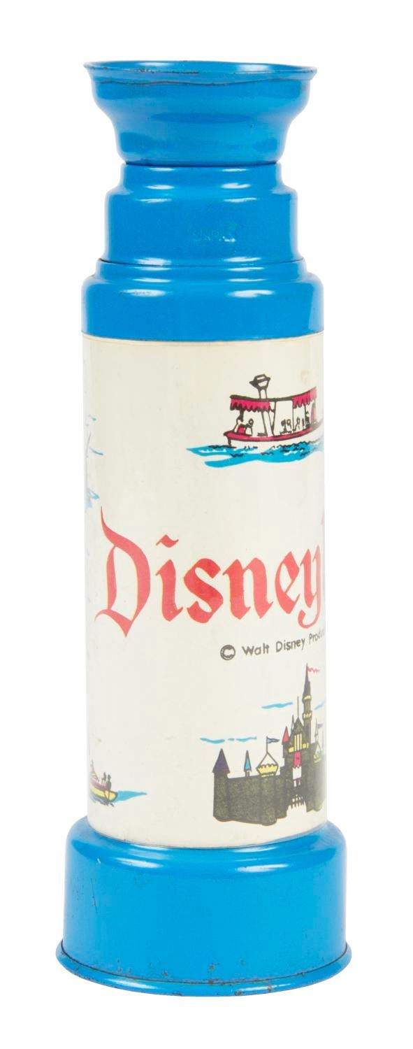 (Disneyland, 1960s) A souvenir spyglass featuring art of attractions around the outside. The spyglass extends measuring 2.25" in diameter and 12.75" long when fully extended. The toy is in good condition, with a small piece of paper loose inside which occasionally obstructs the view.