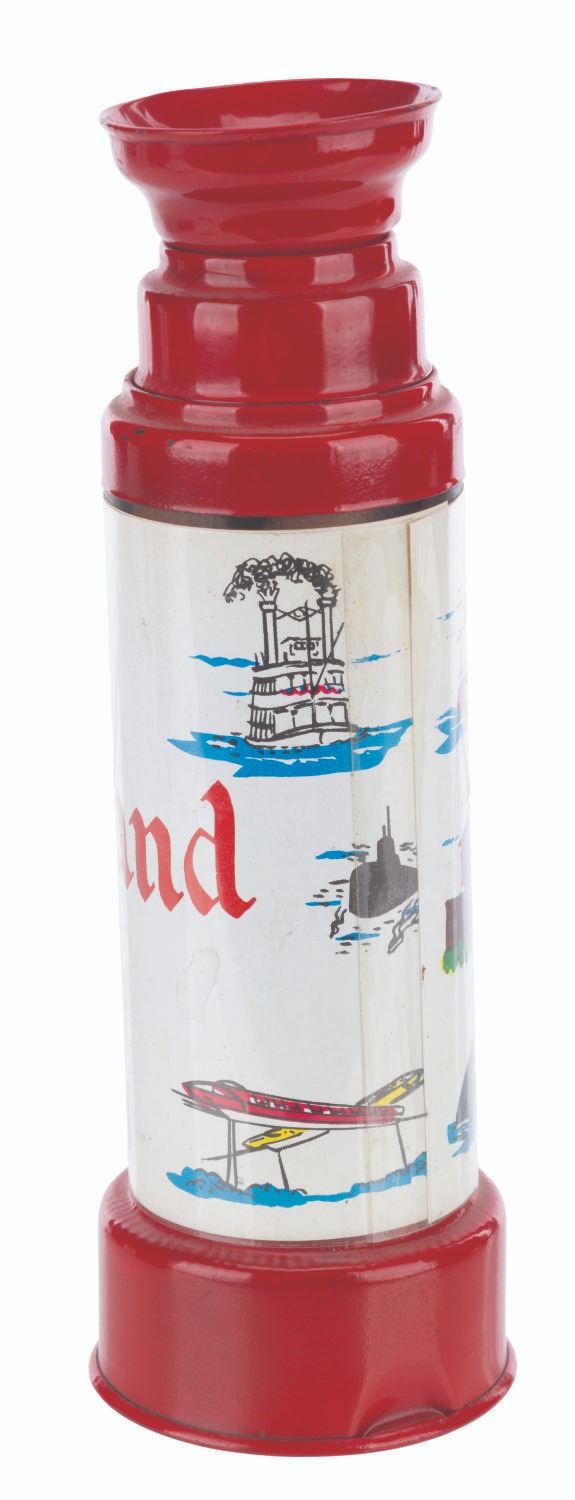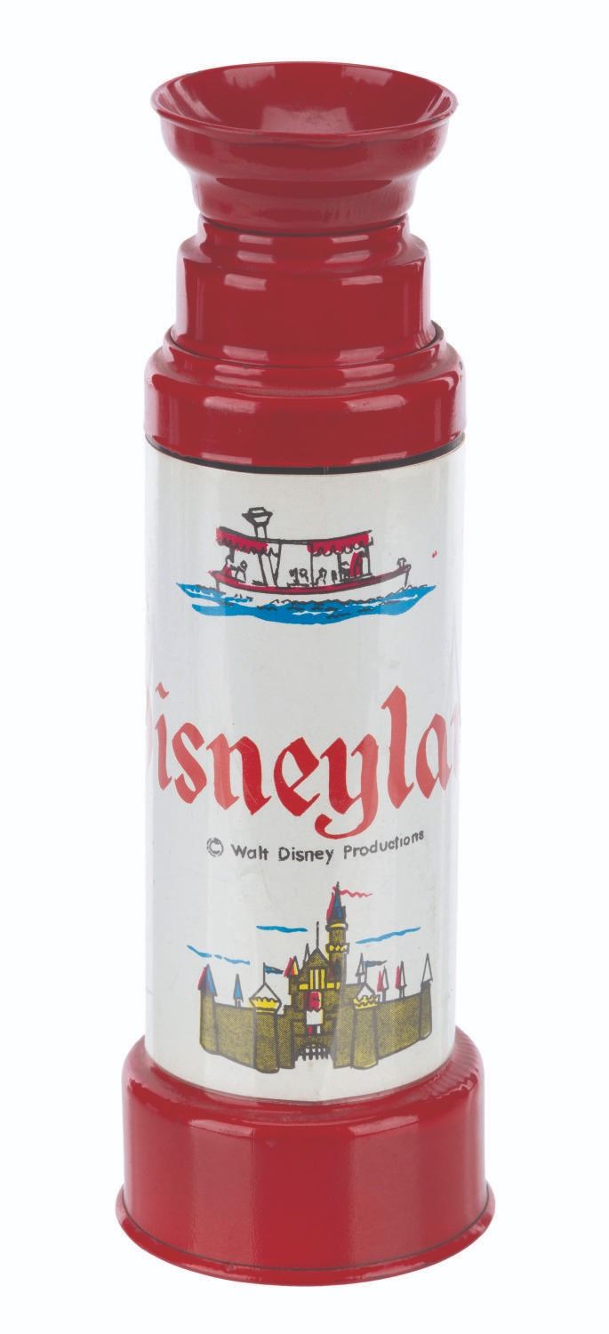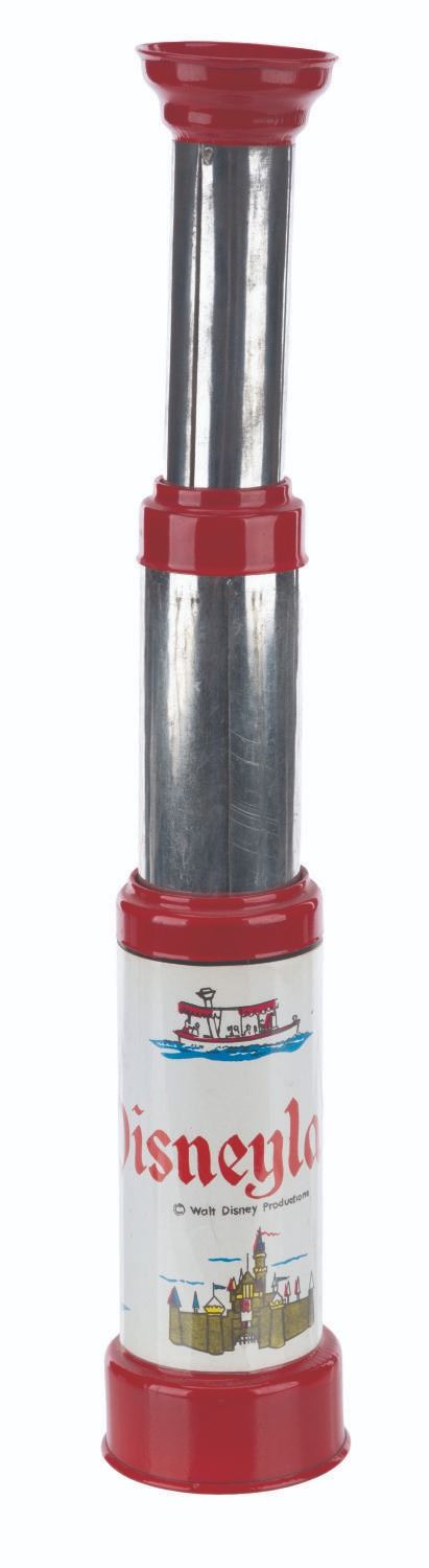 (Disneyland, 1960s) A Disneyland souvenir spyglass telescope. The collapsible metal and plastic spyglass features illustrations of Disneyland iconography on the sides, including Sleeping Beauty Castle, the Jungle Cruise, Submarine Voyage, and more. Measuring 7” tall collapsed, 12.75” opened, and 2.25” in diameter, the spyglass is in very good condition with light oxidation, stains, scratches, scuffs, discoloration from age, and a dent on the base.