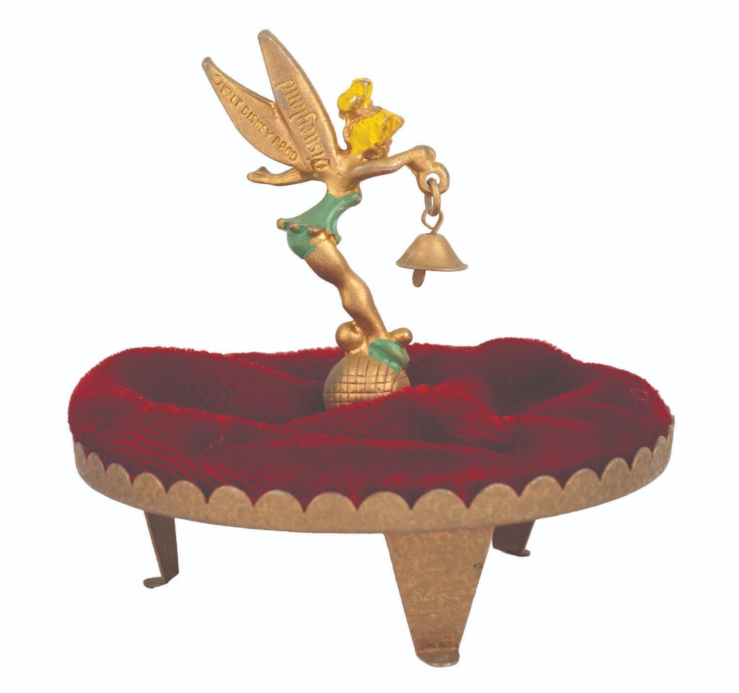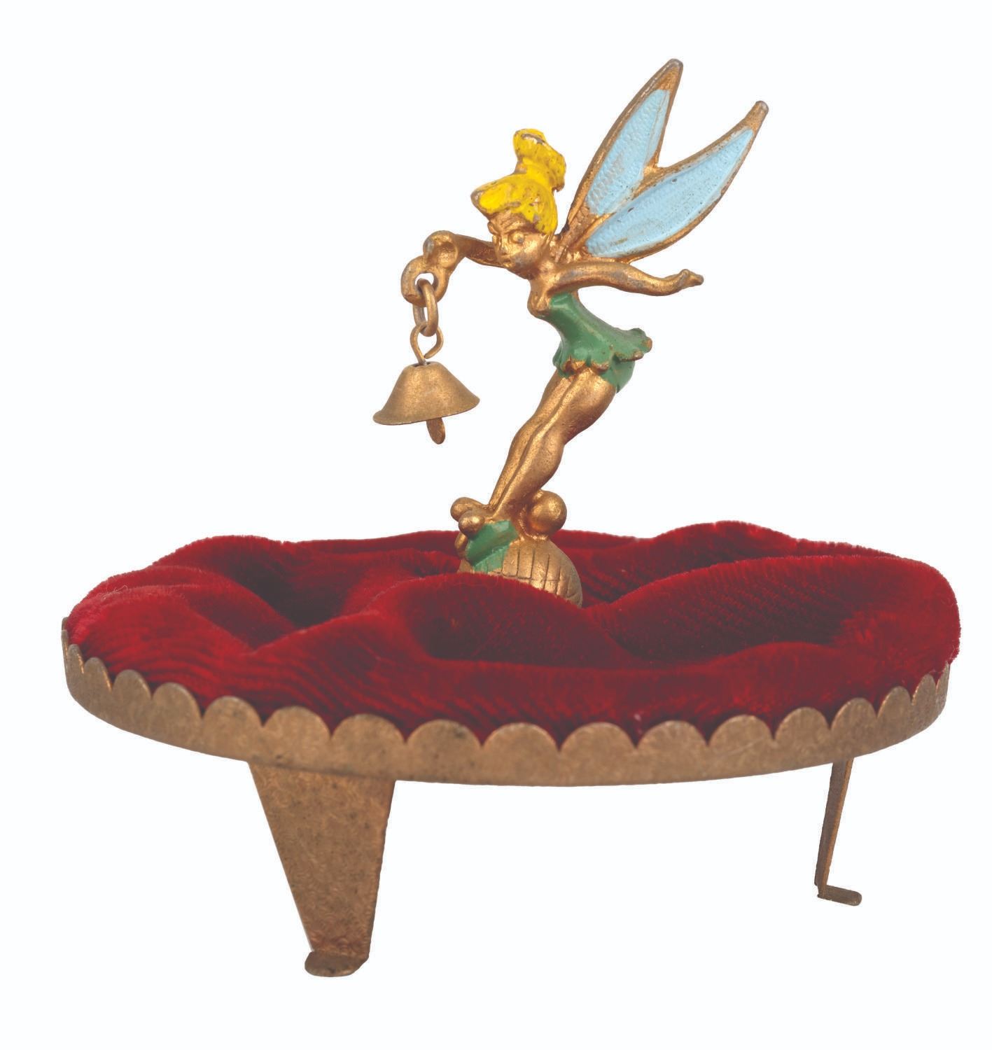(Disneyland, 1960s) A pin cushion featuring a figurine of Tinker Bell holding a bell. Measuring 2.5" tall and 3" in diameter, the pin cushion is in very good condition with some paint fading from age and light wear.