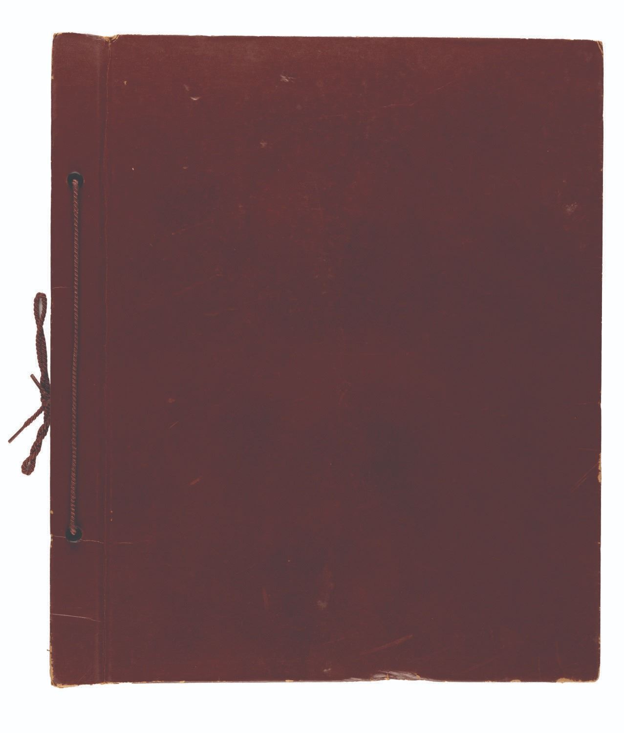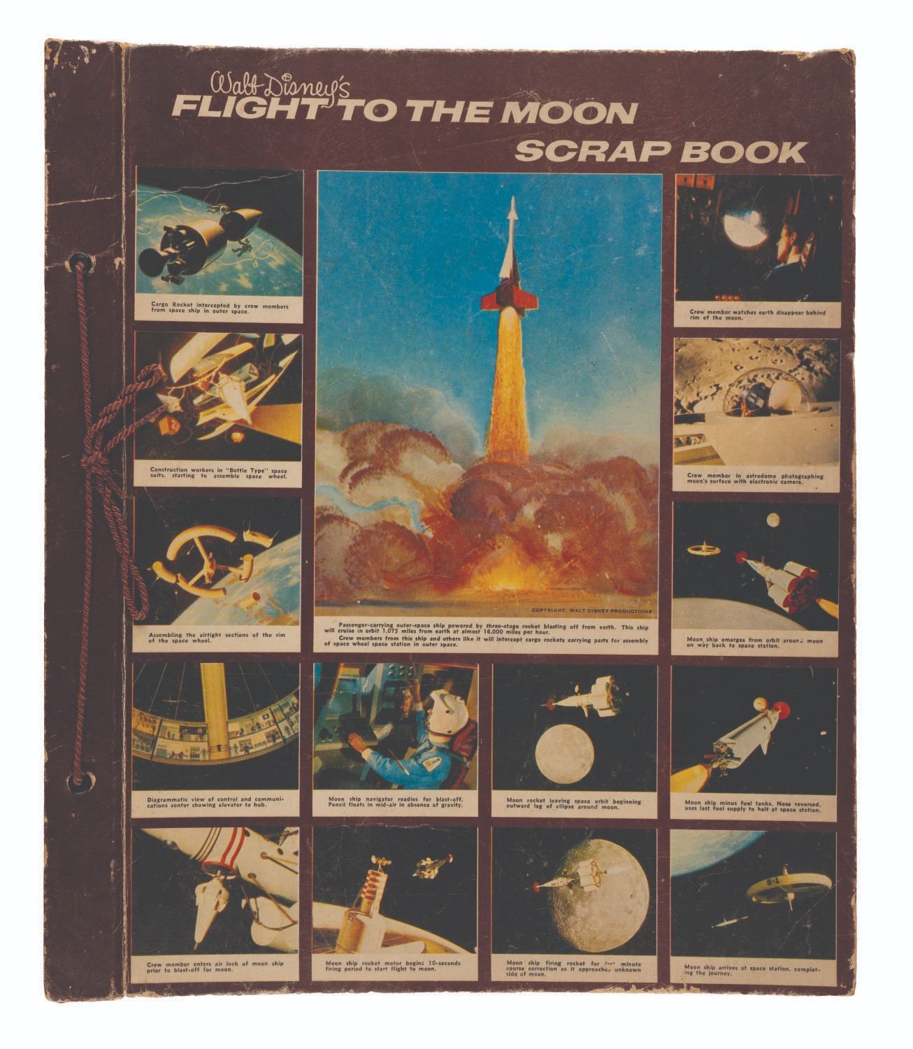 (Disneyland, 1960s) A rare unused Flight to the Moon souvenir scrapbook. The string-bound, board and leatherette book contains 22-leaves of blank construction paper. Measuring 14.5” x 12.25”, the scrapbook is in good condition with spine wear, scuffs to the cover, tiny tears to a few pages, and color shift to the pages from age.