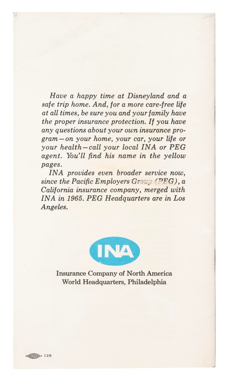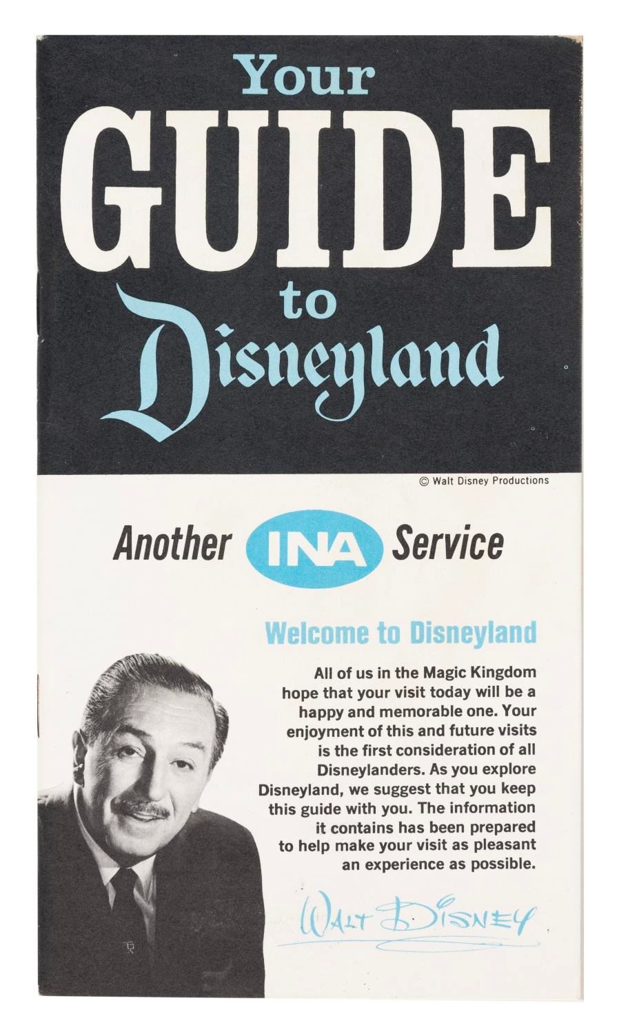 (Disneyland, 1966-67) A “Your Guide to Disneyland” 33-page booklet by INA. From 1955 thru 1974, INA sponsored the Carefree Corner on Main Street U.S.A. at Disneyland, issuing complimentary copies of the informational Disneyland Guide to Guests. This booklet includes It’s a Small World which opened in 1966, but lists Pirates of the Caribbean as “Coming Soon” before it opened in 1967. Measuring 7" x 4", the booklet is in very good condition with scuffs and small creases to the back.