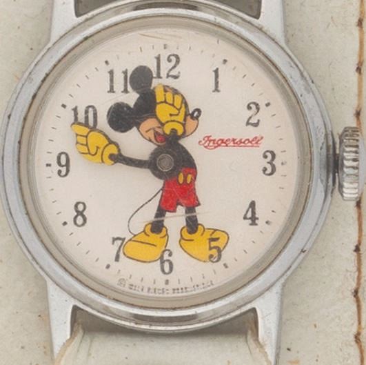 (Ingersoll, 1968) A 1968 Ingersoll wristwatch featuring Mickey Mouse’s arms as the watch’s hands and a white band patterned with Mickeys. Measuring 1’ in diameter in a 1.15” x 9.25” band, the watch is in very good condition with light surface scratches, wear, oxidation on the clasp, discoloration from age, and peeling and stains on the band.