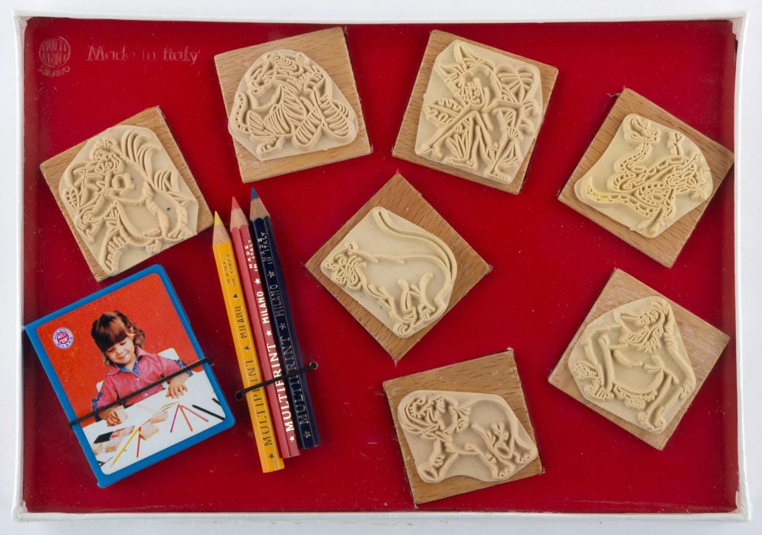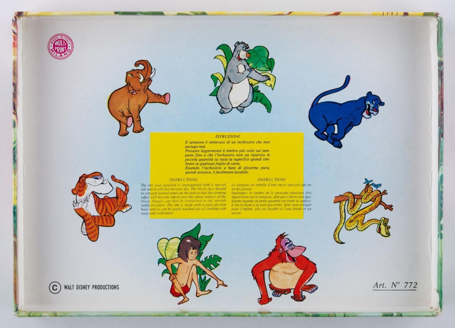 (Multi Print, 1960s) An Italian stamp and pencil set of "The Jungle Book." The set features seven stamps of characters from the film, three pencils, and a stamp pad. Measuring 9.5" x 0.75" x 6.75", the set is in very good condition, sealed in the original cellophane, with light edge wear and discoloration to the box.