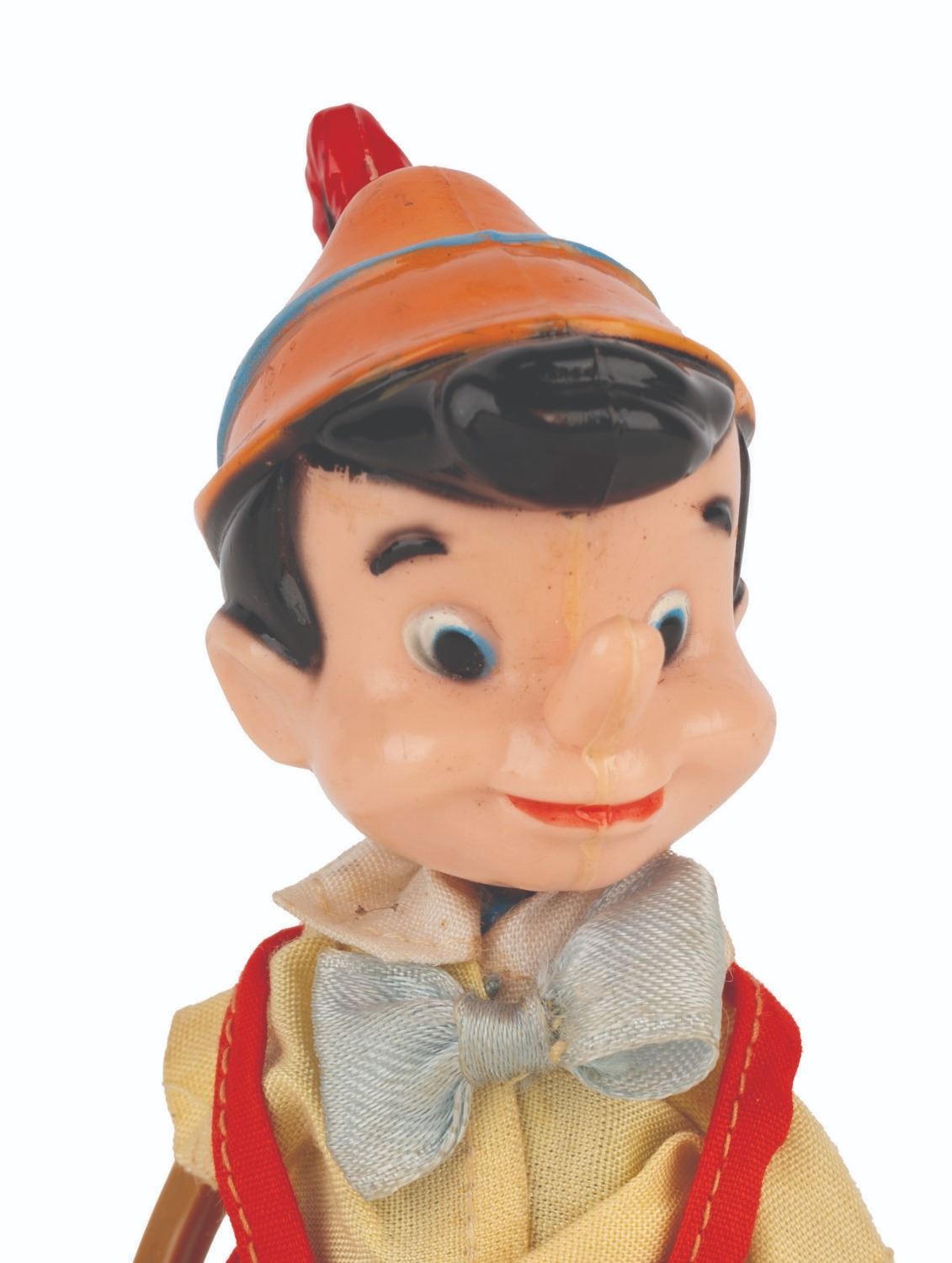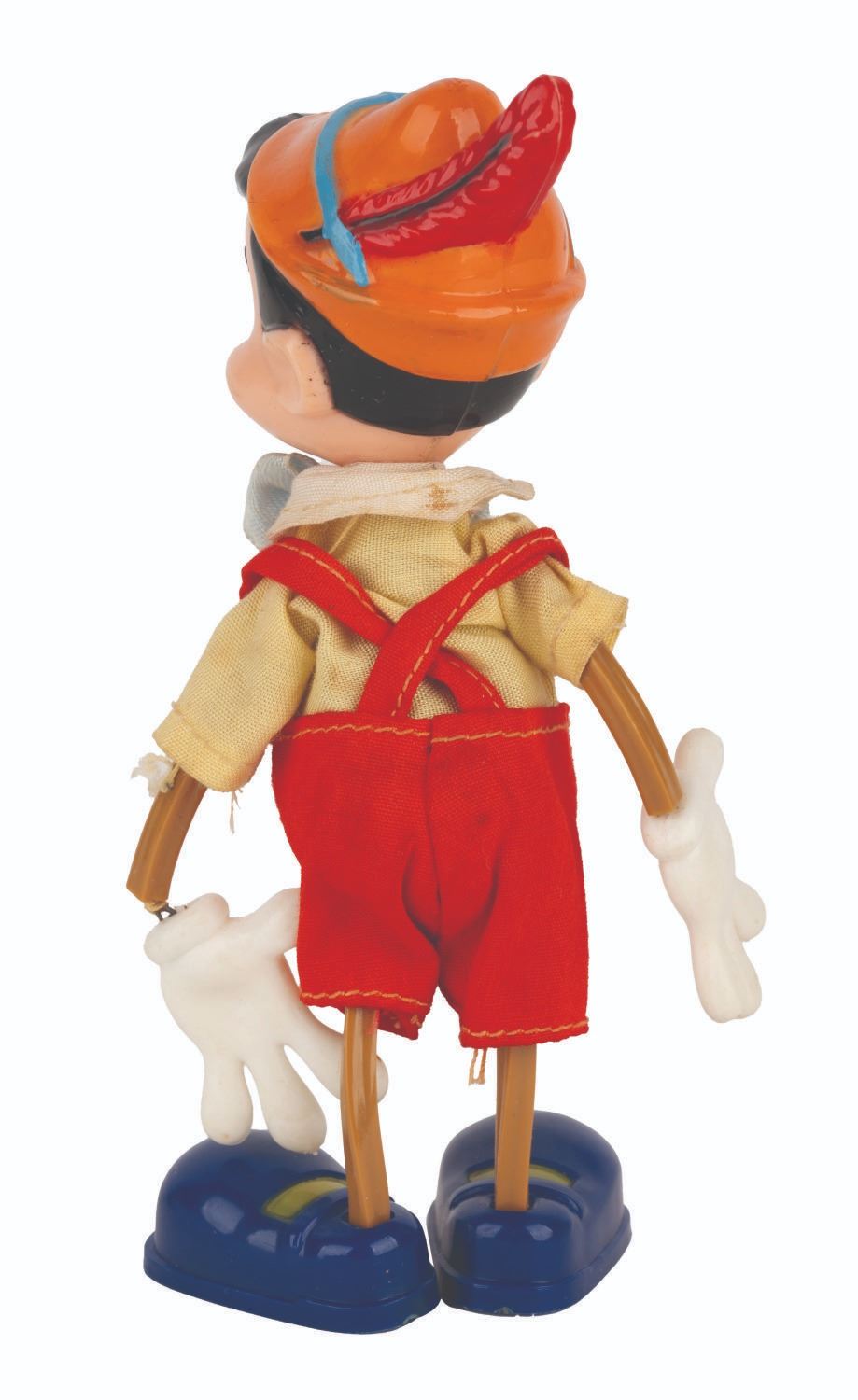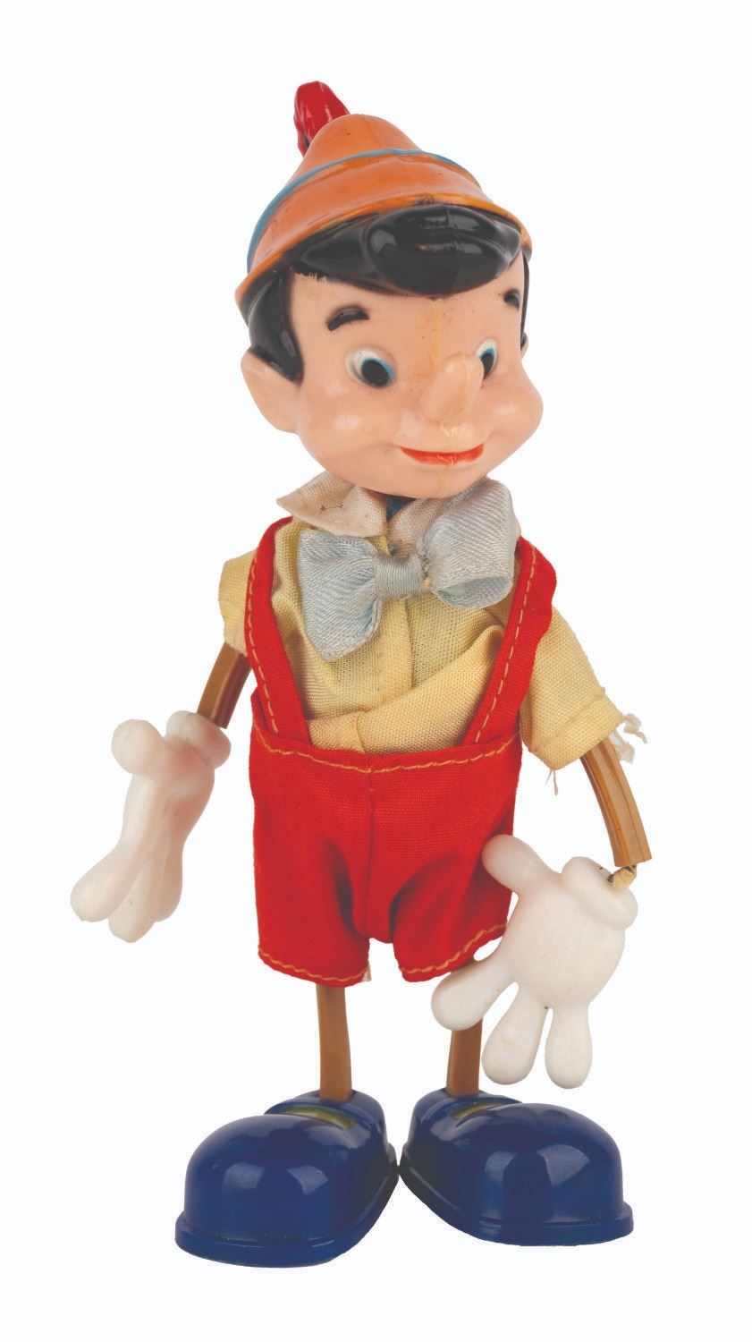 (Marx, 1961) A Twistable Toy of Walt Disney’s Pinocchio from Marx Toys. Measuring 6” tall, the toy is in good condition with light handling wear and the wire in the left arm broken and unable to be posed.