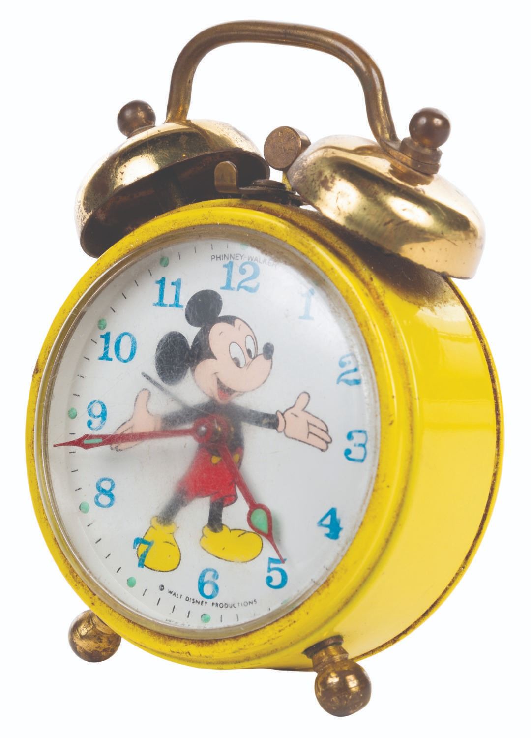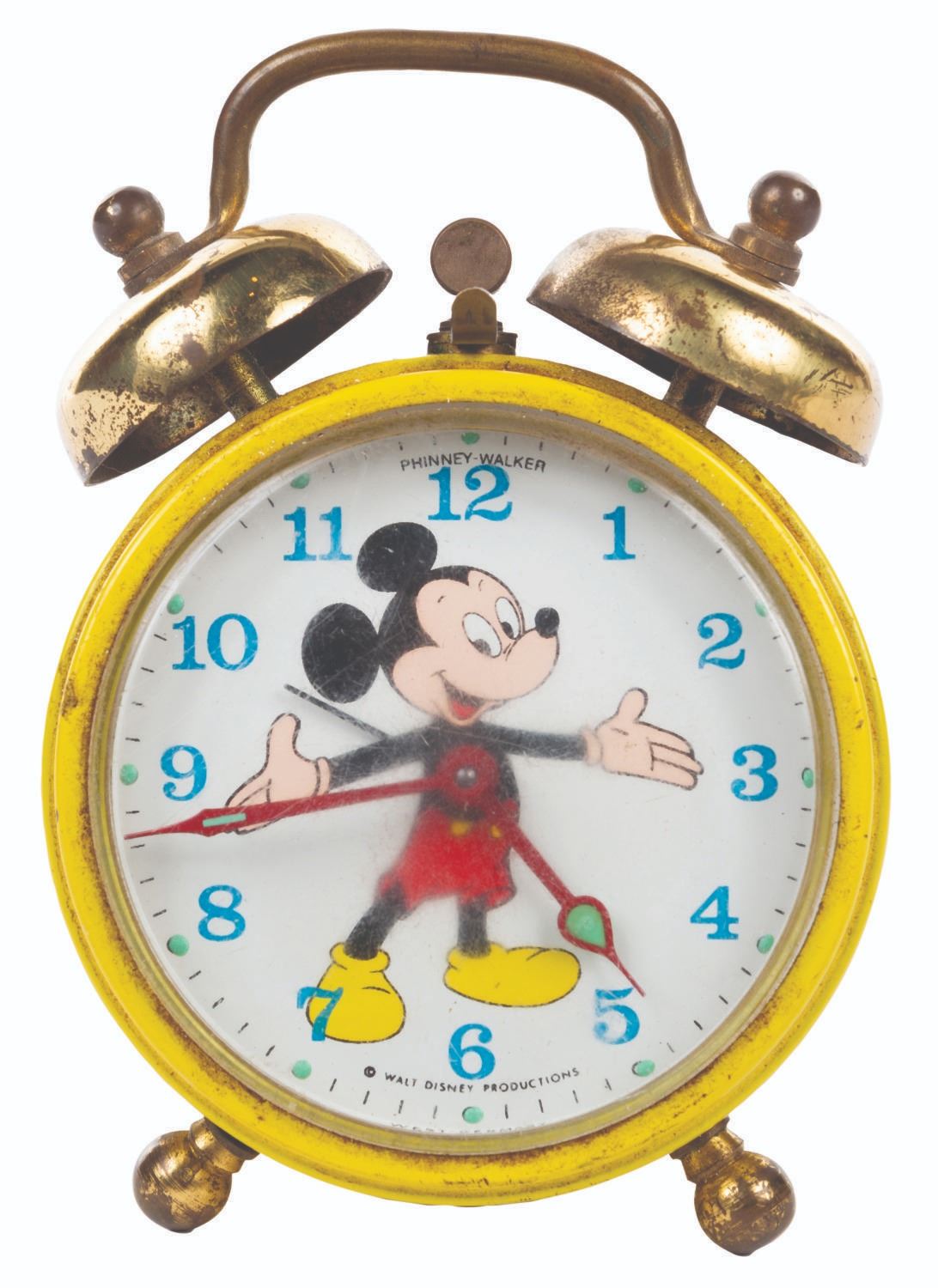 (Disney/Phinney-Walker, 1960s) A Mini Mickey Mouse alarm clock manufactured by Phinney-Walker of West Germany. Measuring 3.75" tall x 2.75" the timepiece is in good working condition, with slight scuffs and wear overall.