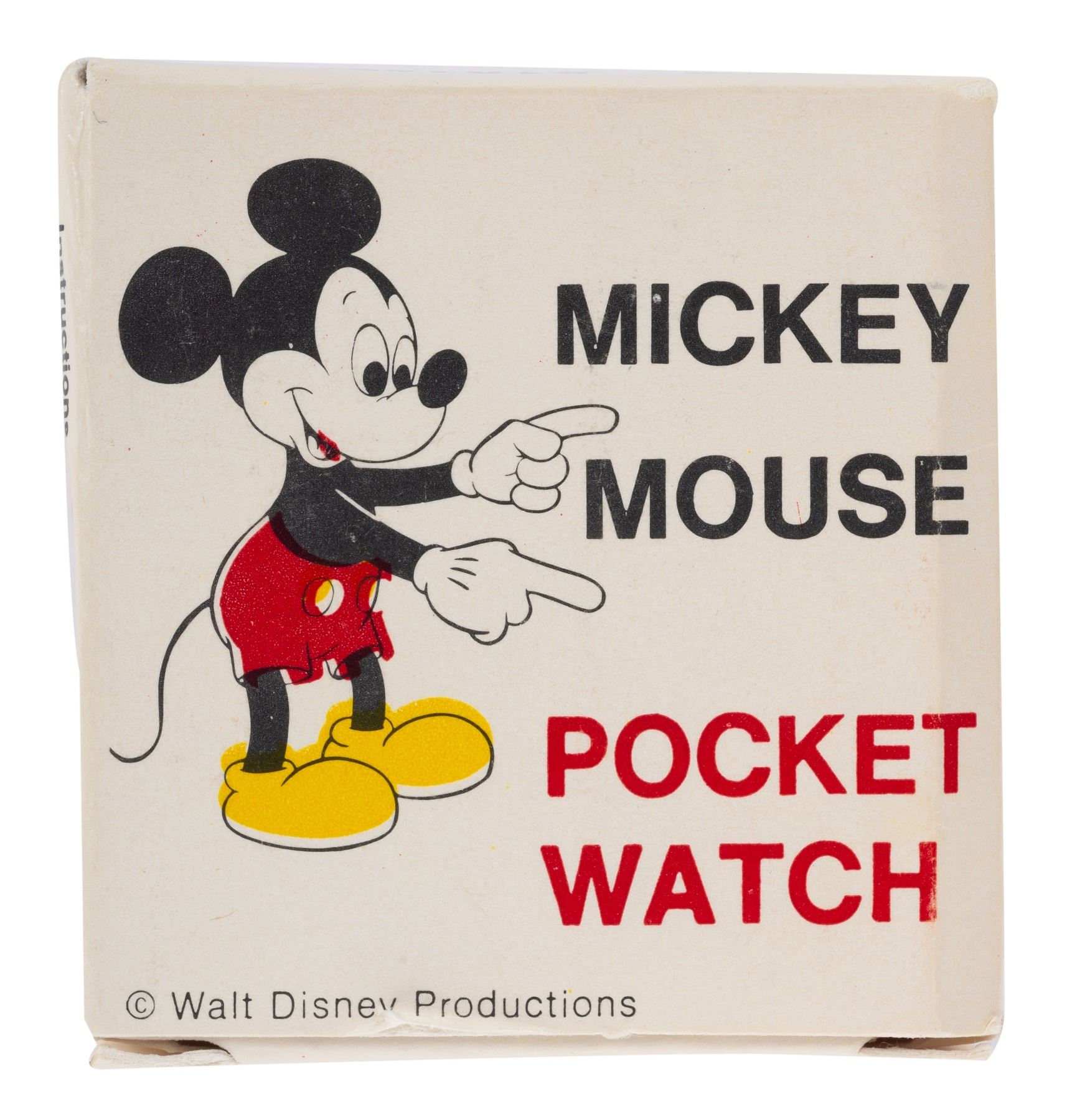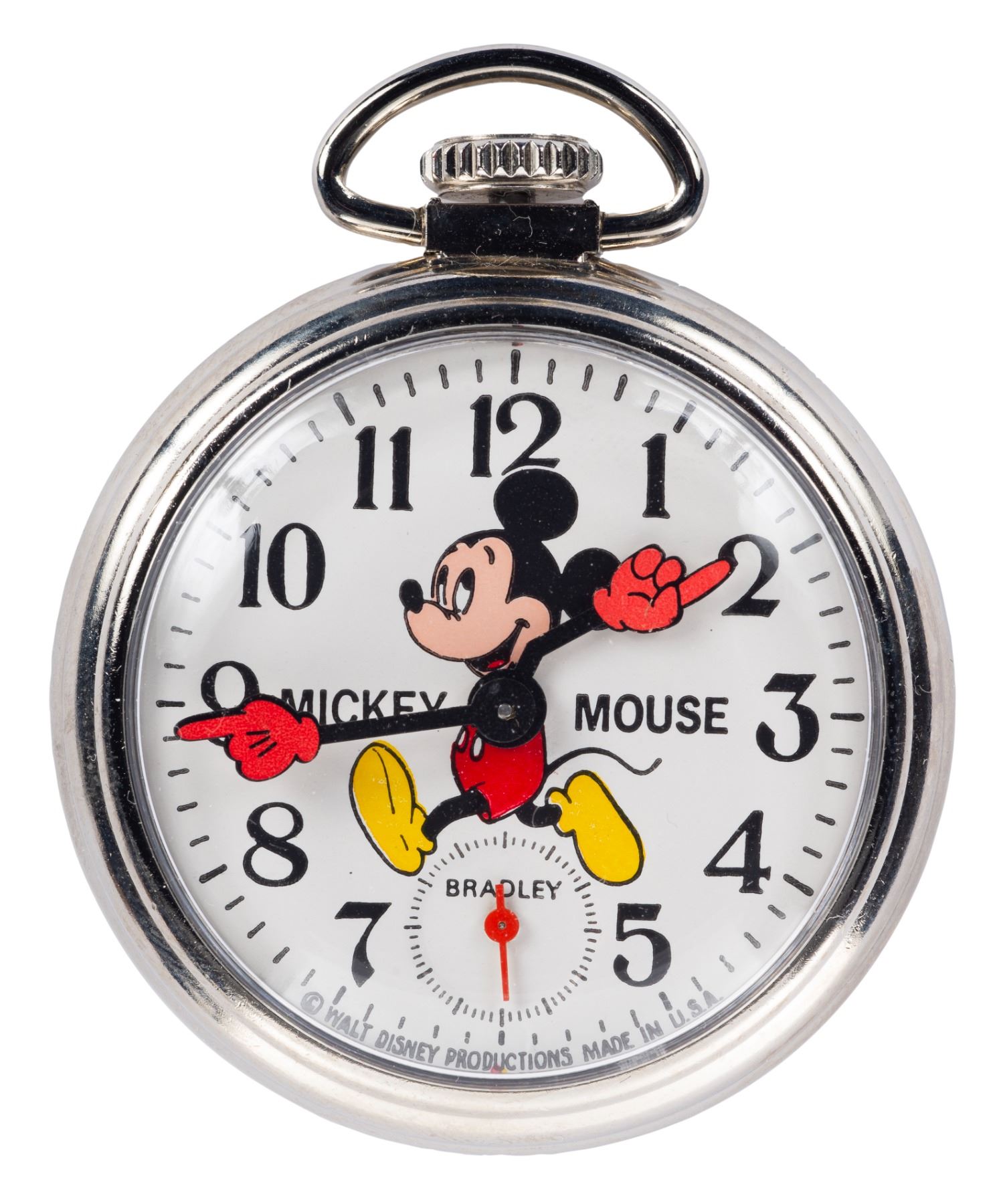 (Bradley, 1960s) A Mickey Mouse Pocket Watch by Bradley. The Swiss-made watch features a red-gloved Mickey Mouse on the face. Measuring 2.5" in diameter, the timepiece is in fine condition in its original box.