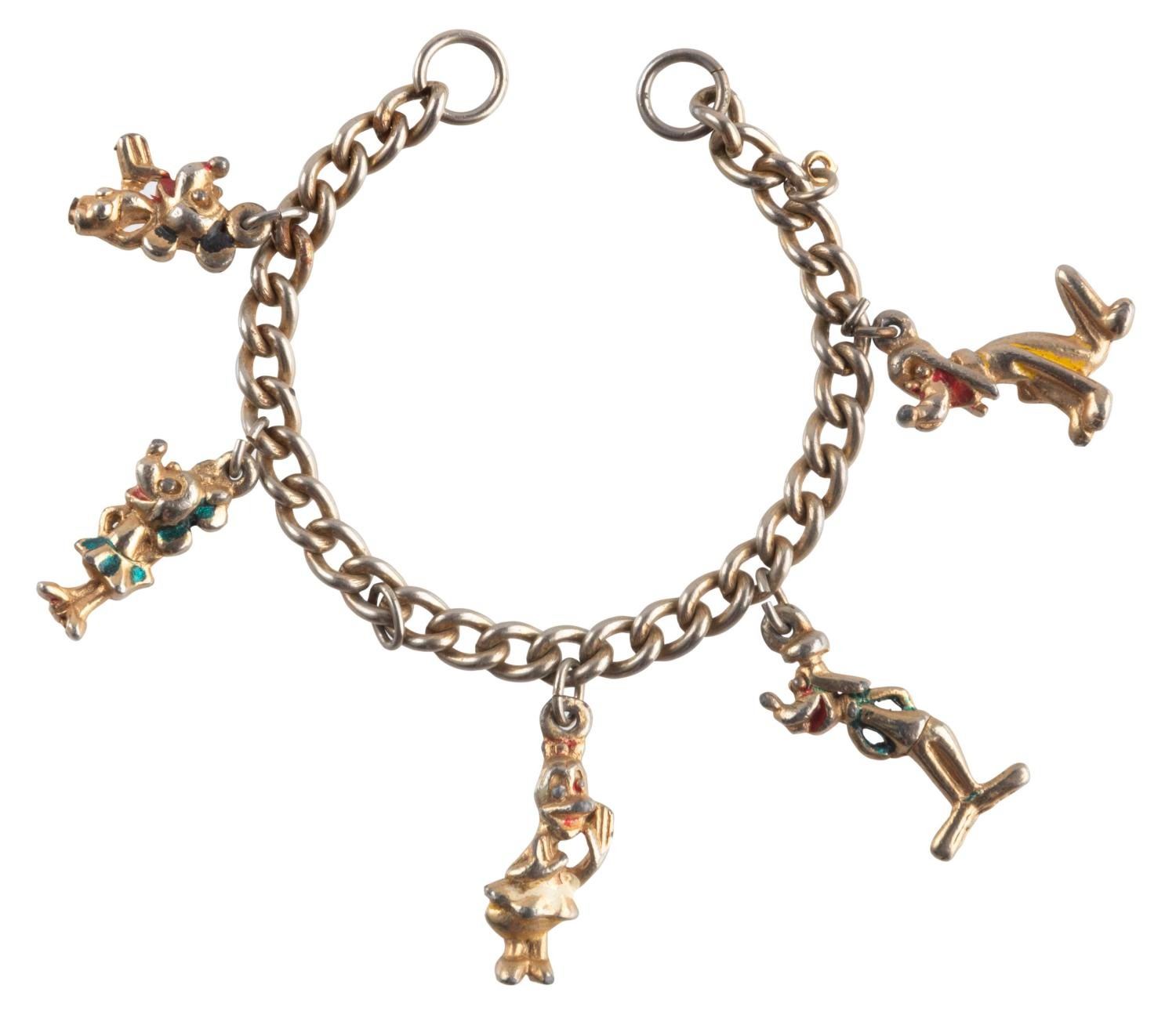 (Disneyland, 1960s) A souvenir charm bracelet featuring Mickey, Minnie, Donald, Goofy, and Pluto. Measuring 5.5” long, the bracelet is in fair condition, with much wear to the gold finish and color elements, and the Mickey charm missing the legs.