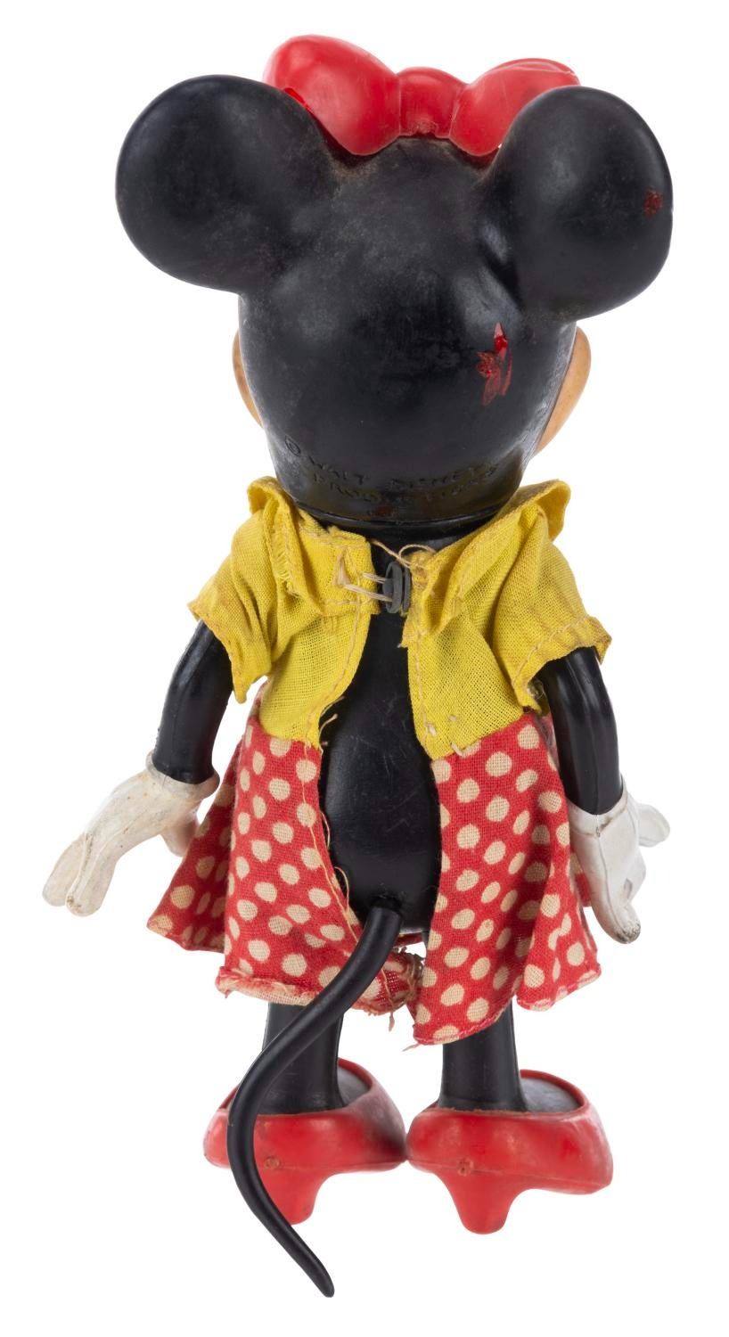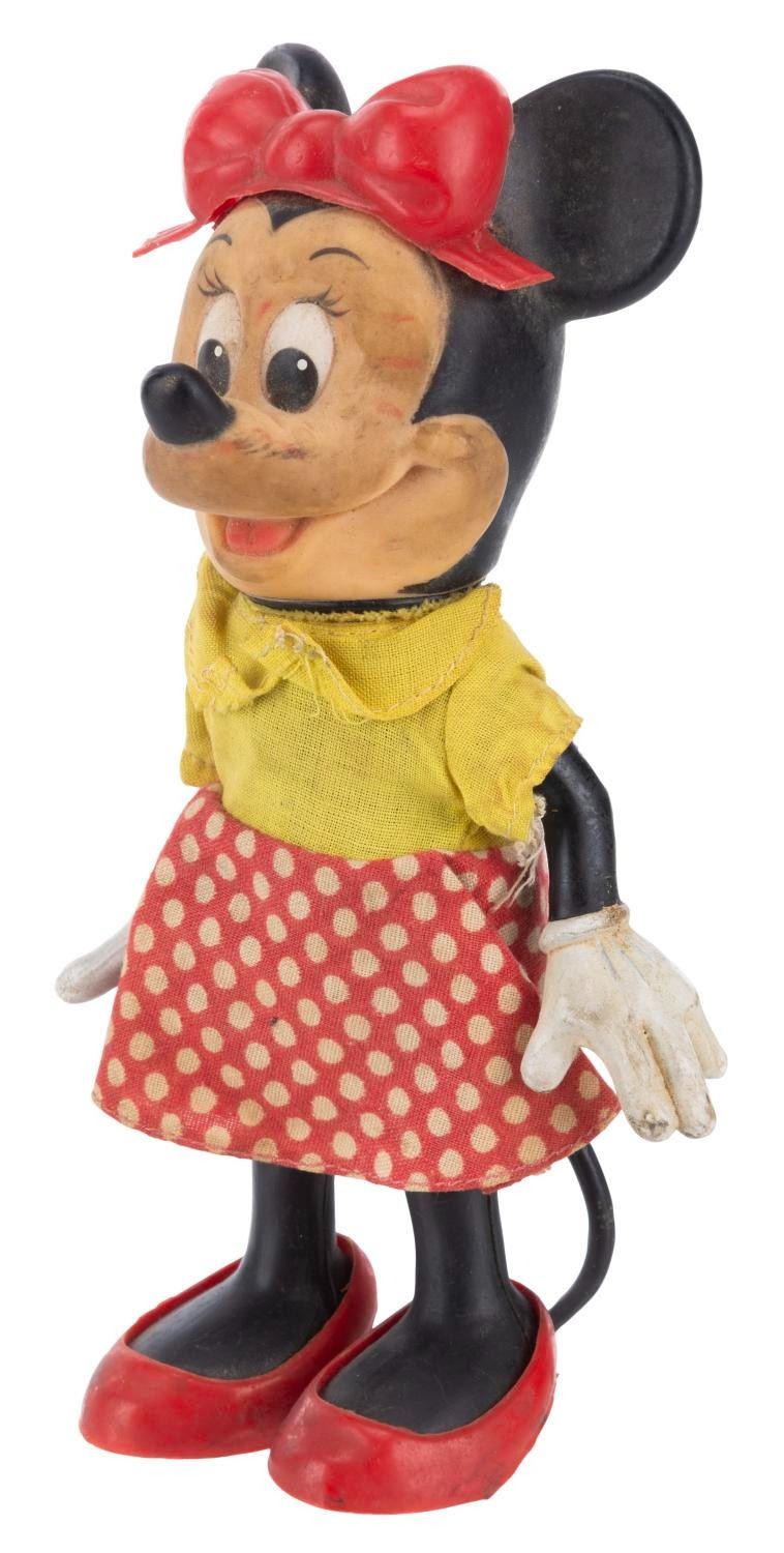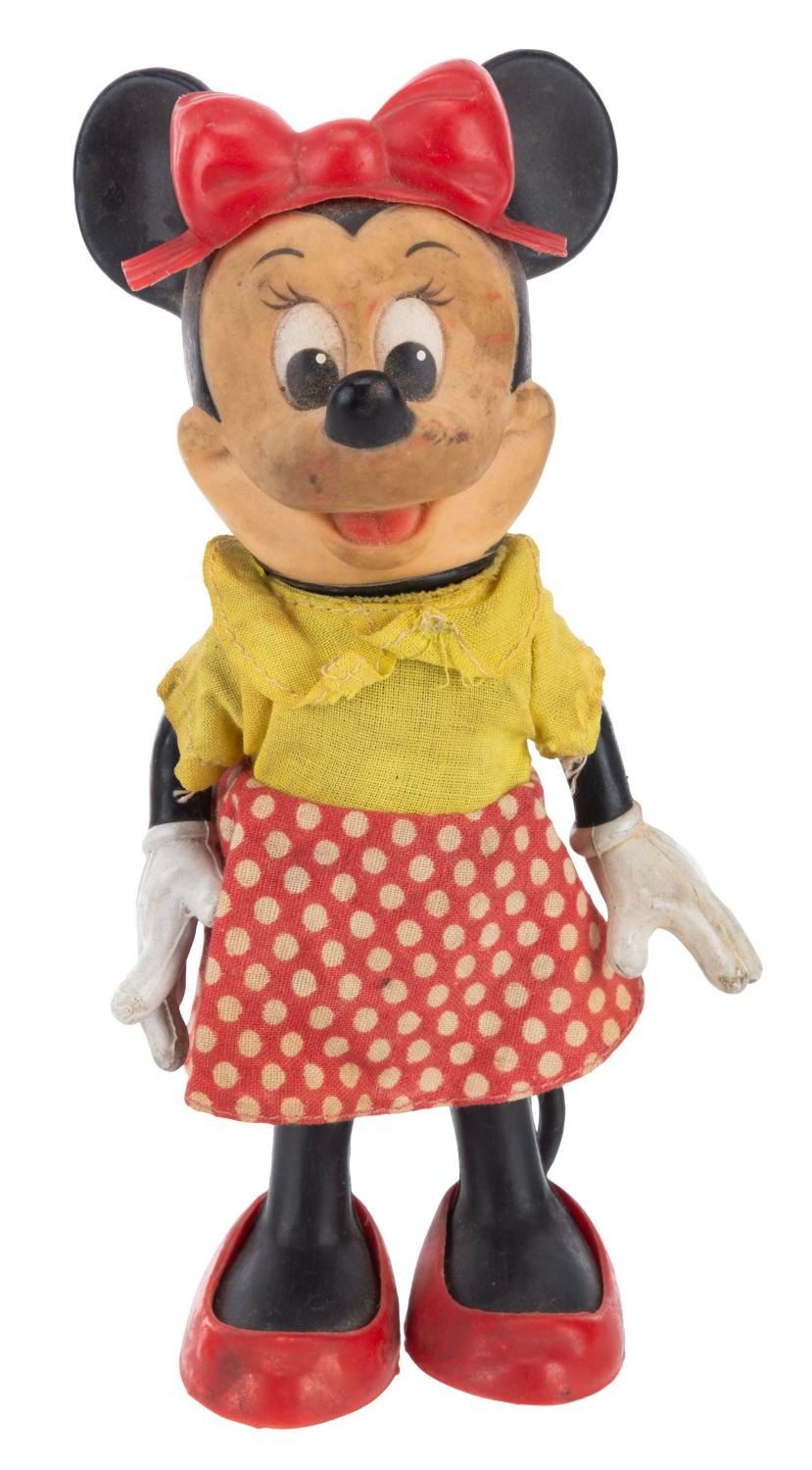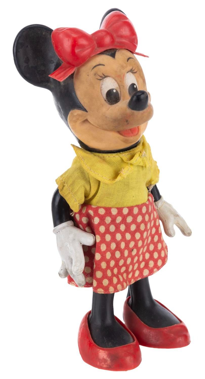 (R. Dakin & Co., 1960s) A Minnie Mouse Rubber doll manufactured by R. Dakin & Co with fabric clothing. Measuring 7.5" tall, the doll is in fair condition with soiling, scuffs, and wear to the fabric.