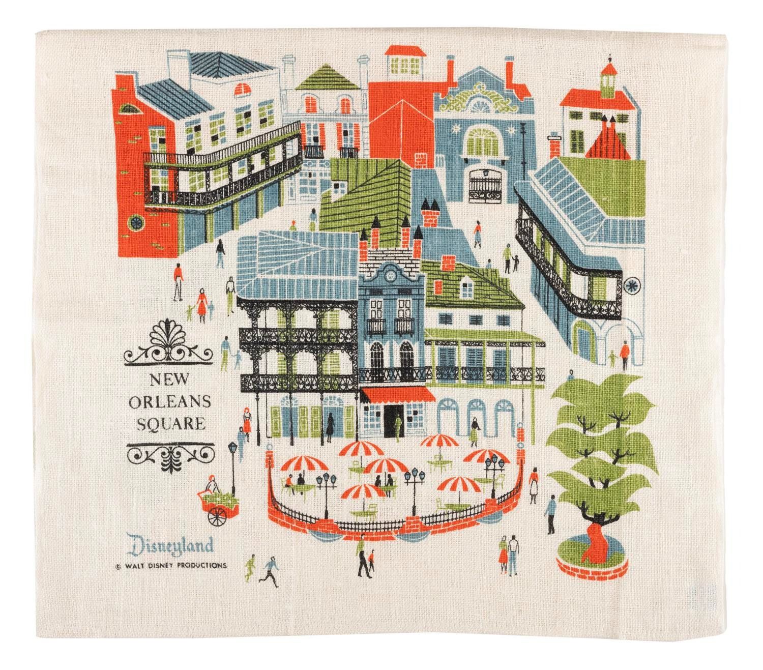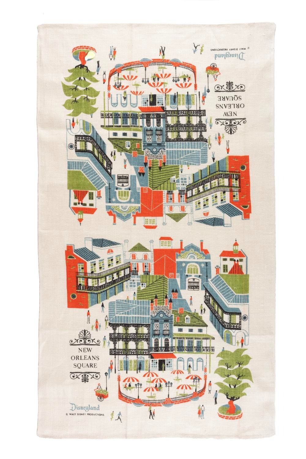 (Disneyland, 1960s) A souvenir decorative towel of New Orleans Square. Measuring 30" x 17", the towel is in fine condition, with creases and original folds.