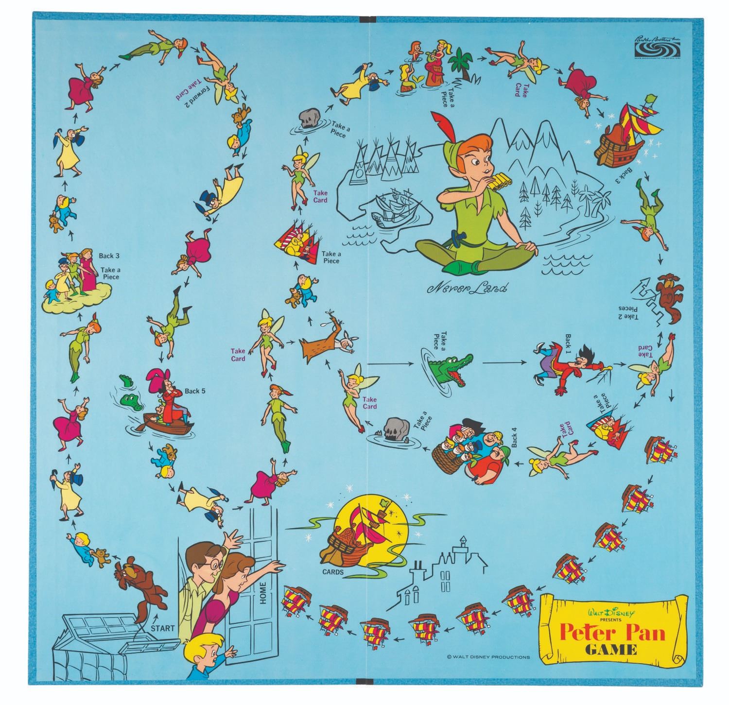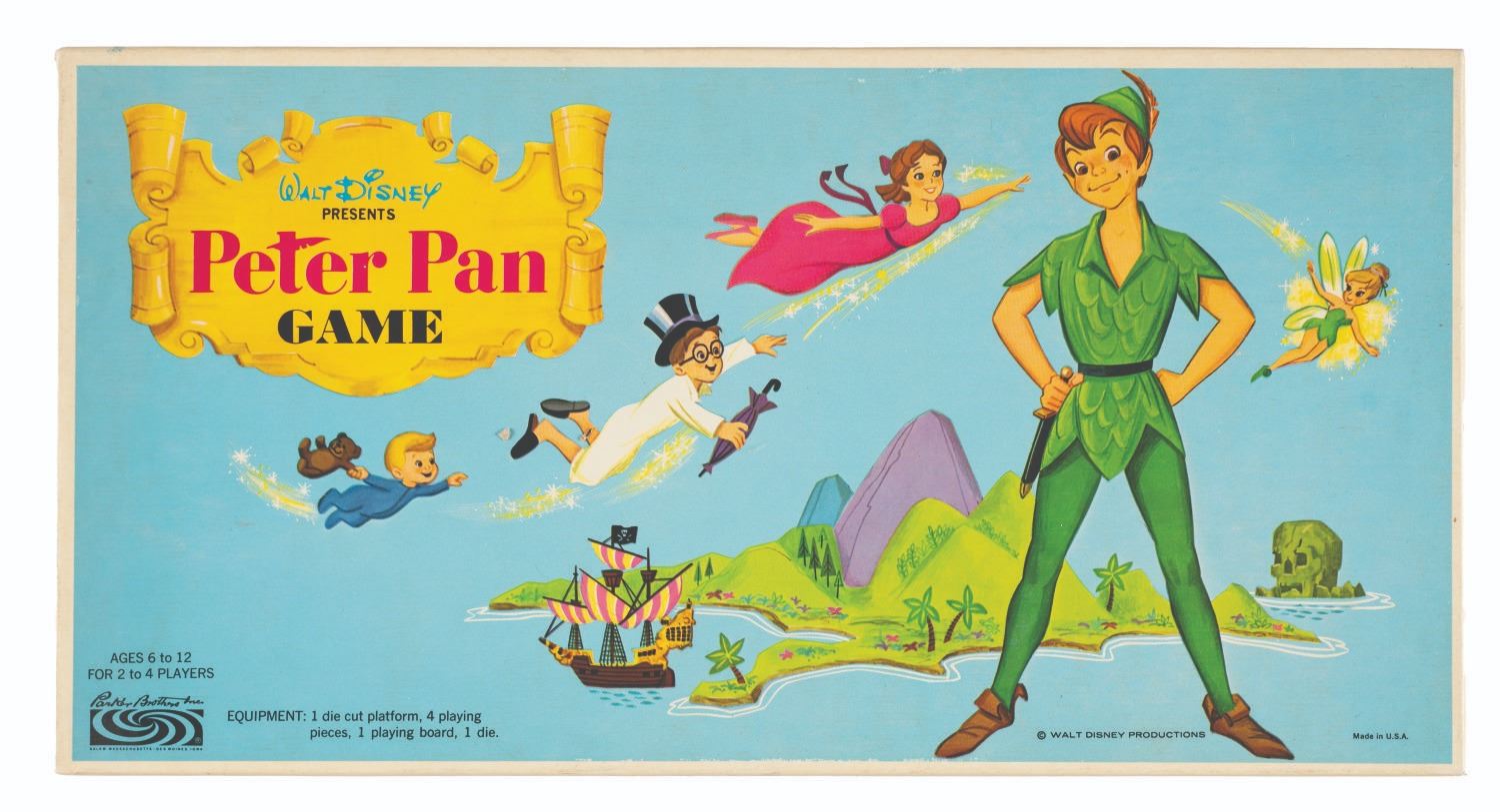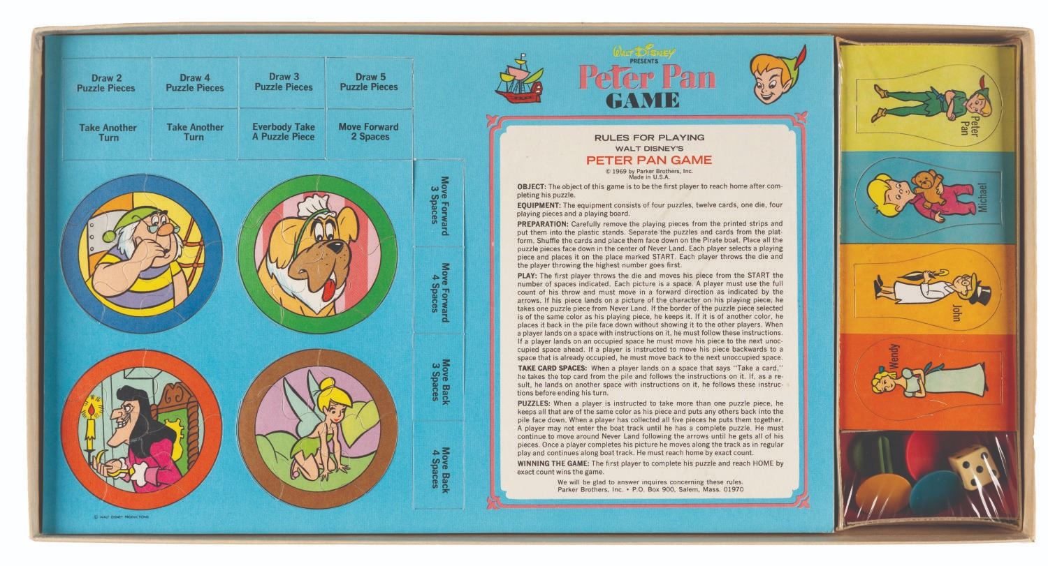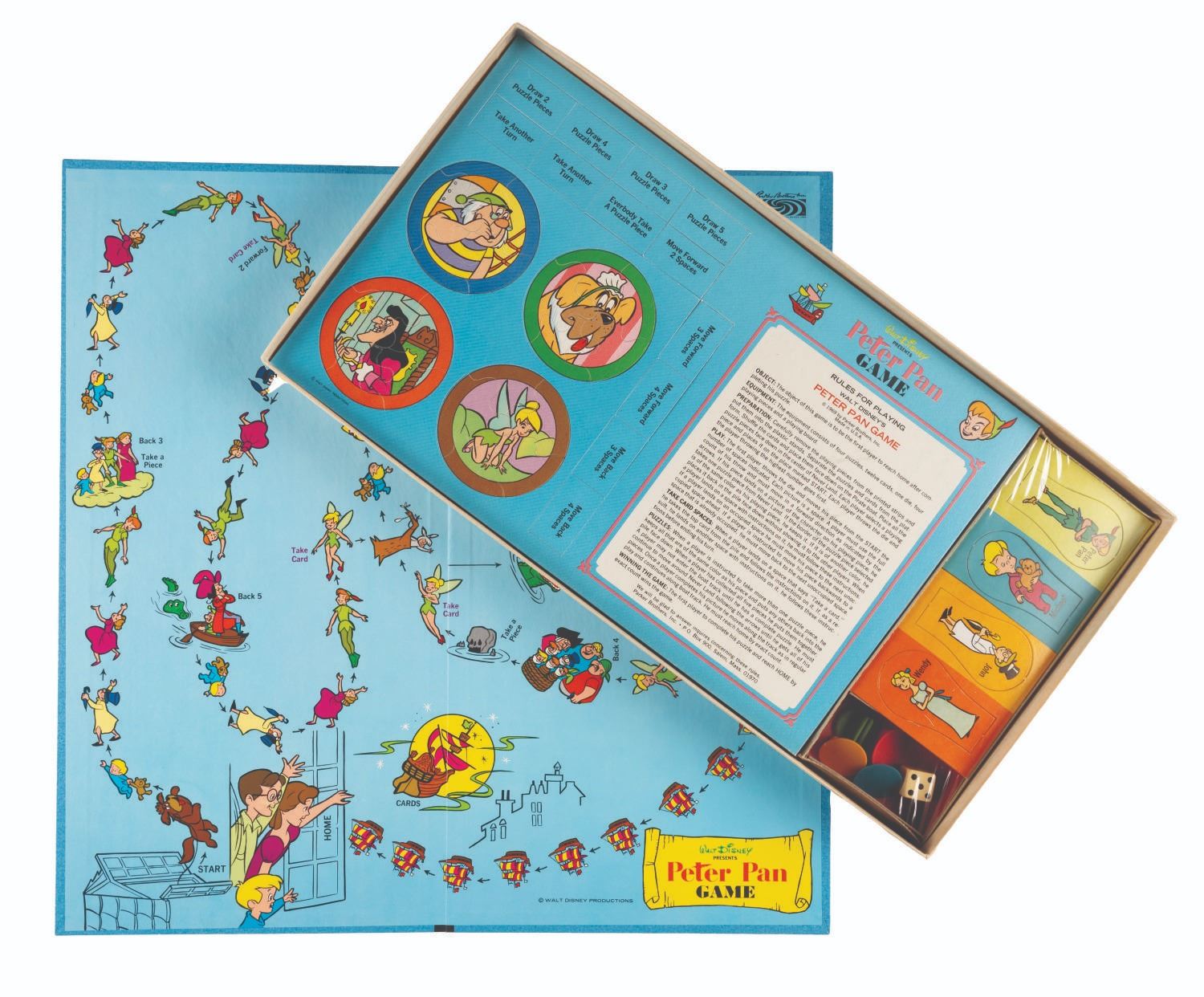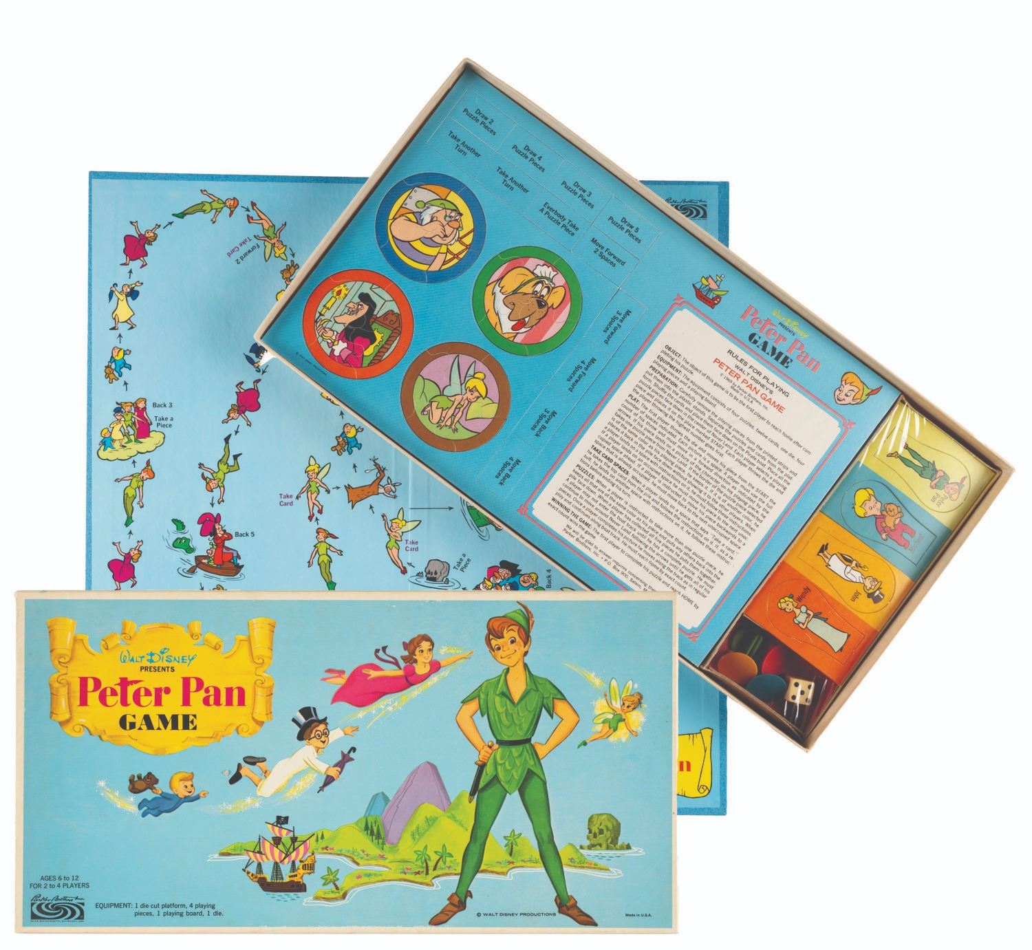 (Parker Brothers, 1969) A Walt Disney Presents Peter Pan game, complete with interior cellophane unopened and tokens unpunched. The game and board are in fine condition, with the box in very good condition with light handling wear.