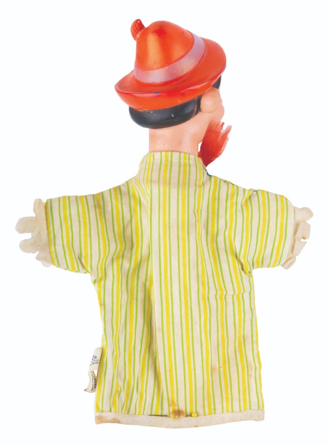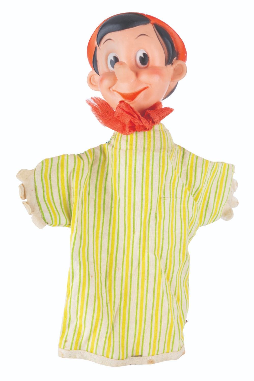 (Gund, 1960s) A Pinocchio hand puppet by Gund Manufacturing. Measuring 10.5” long, the puppet displays in very good condition with its original tag attached, a small sewn fabric repair, scuffs to the rubber head, stains, and wear.