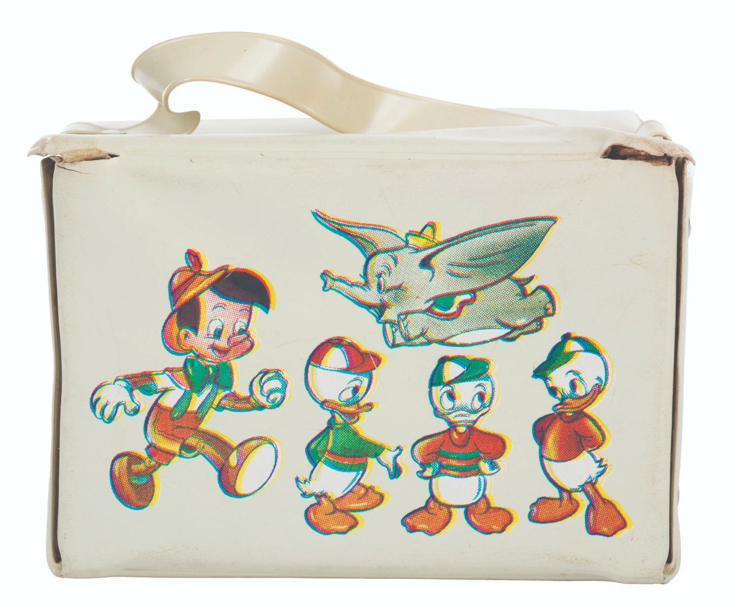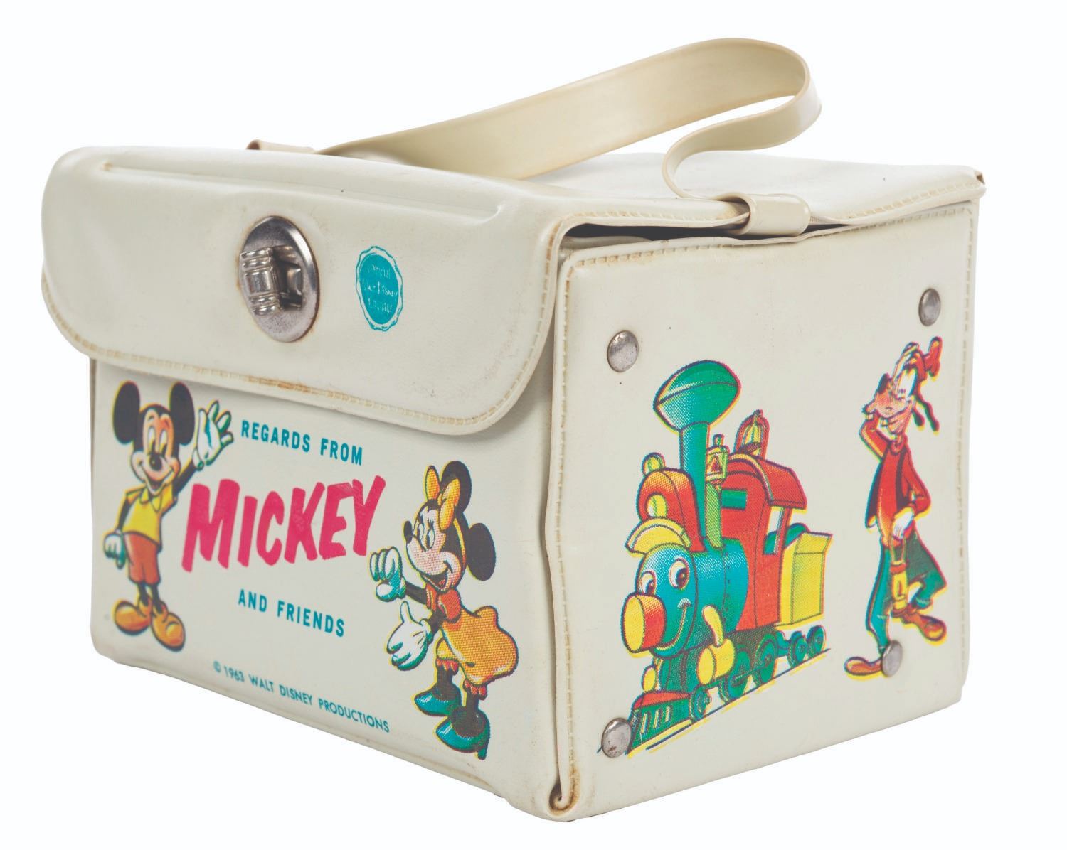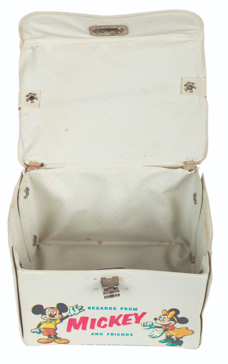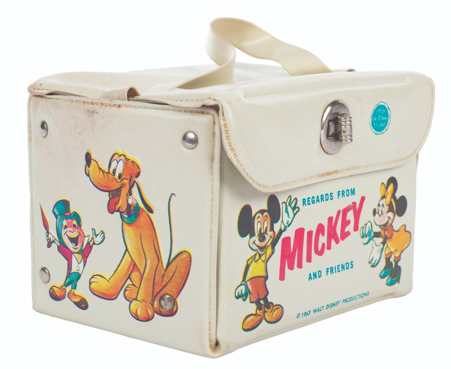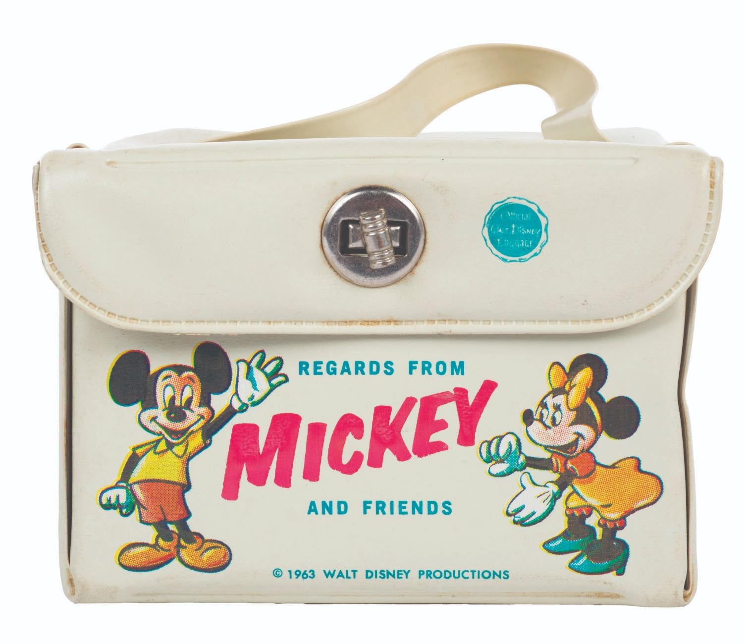 (Disney, 1963) A small "Regards from Mickey and Friends" bag, originally part of a larger Kaboodle Kit collection. The 3.5" x 4.75" and 3.75" wide vinyl bag is in very good condition, with minor fading and slight wear to edges and corners.