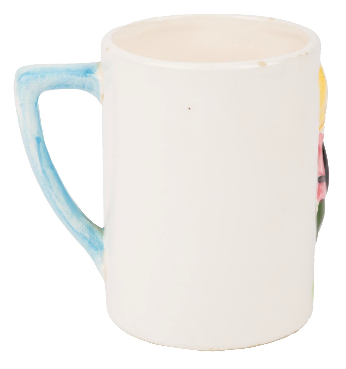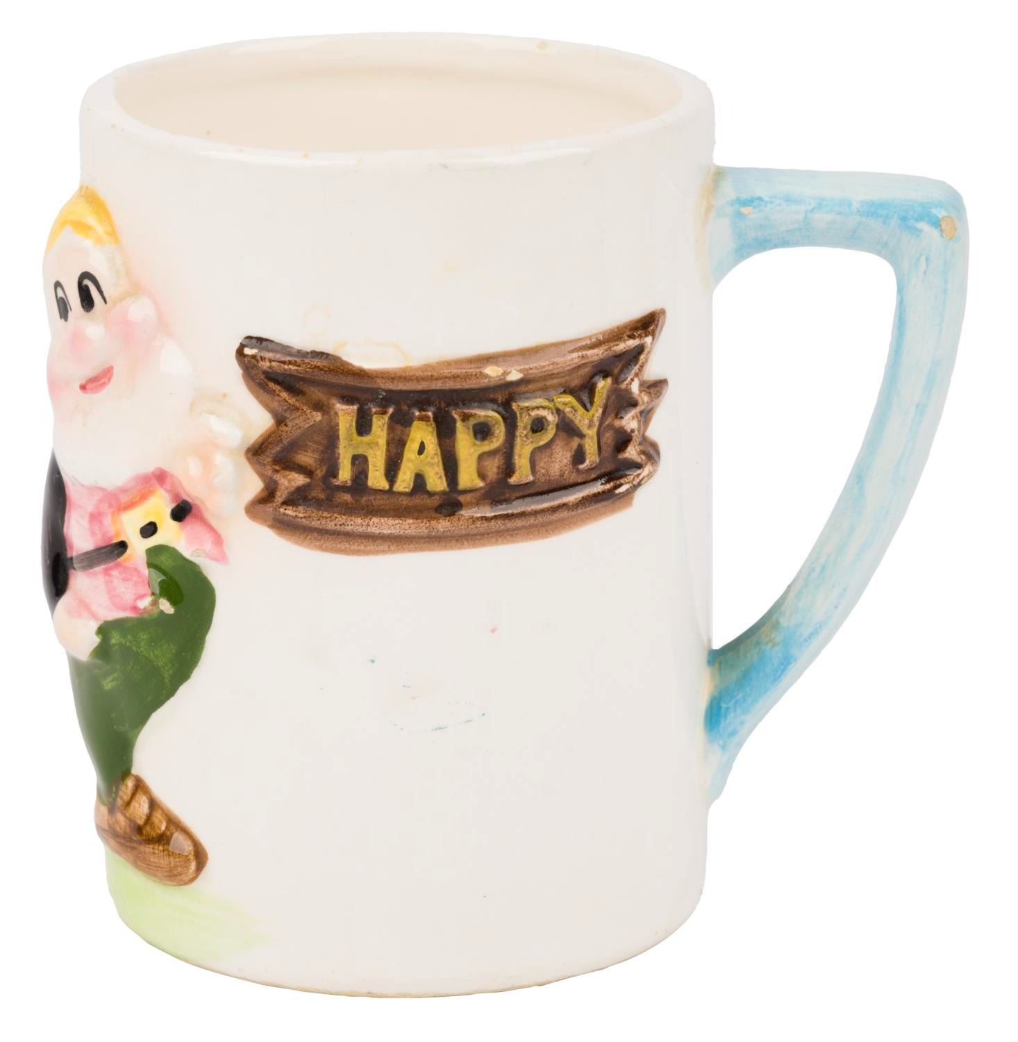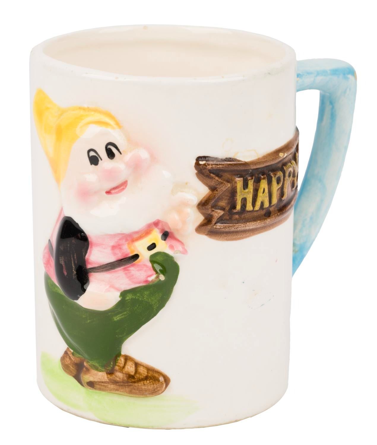(Enesco, 1960s) A ceramic mug featuring a 3D relief of Happy from Walt Disney’s “Snow White and the Seven Dwarfs.” Measuring 3.75” tall and 3.75” at its widest diameter, the mug is in good condition with small chips and minor wear.