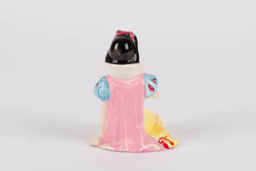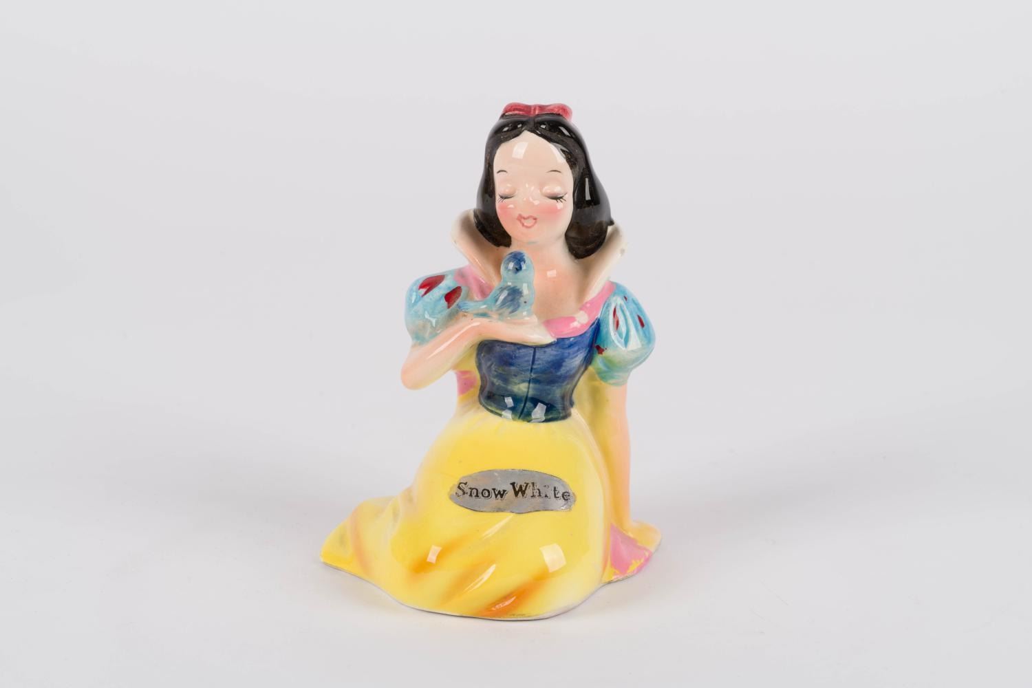 (Enesco, 1960s) A ceramic figurine of Snow White, the first Disney Princess, sitting and singing with a bluebird. Measuring 3.5" x 3.25" x 4.45" tall, the figurine is in very good condition with some crazing and light wear.