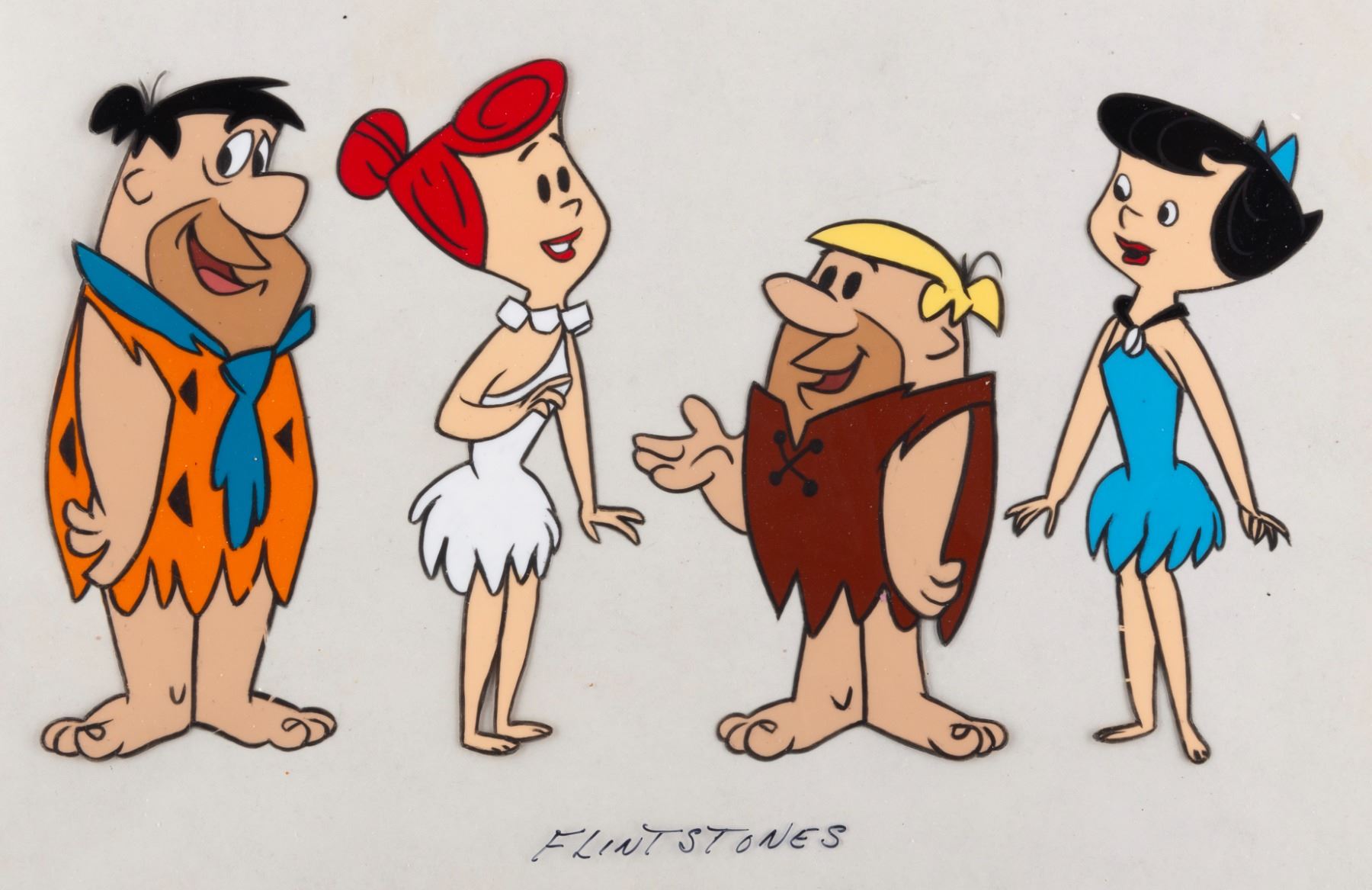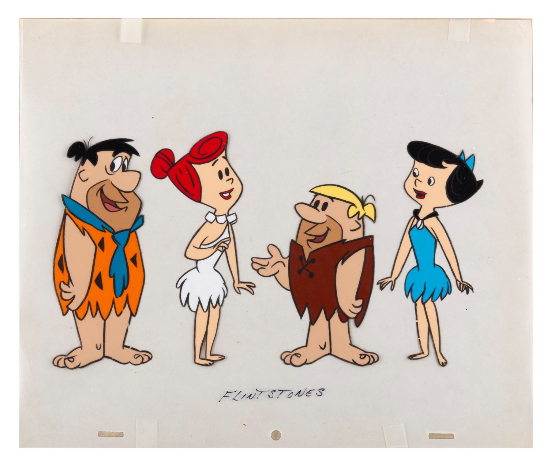 (Hanna-Barbera, 1960-1966) A model cel of main characters Fred, Wilma, Barney, and Betty from “The Flintstones.” With character image sizes ranging from 3.5” x 4.25” to 2.75” x 5.75” on a 10.5” x 12.5” cel, the art displays in very good condition with light scratches, paint loss, and wear.