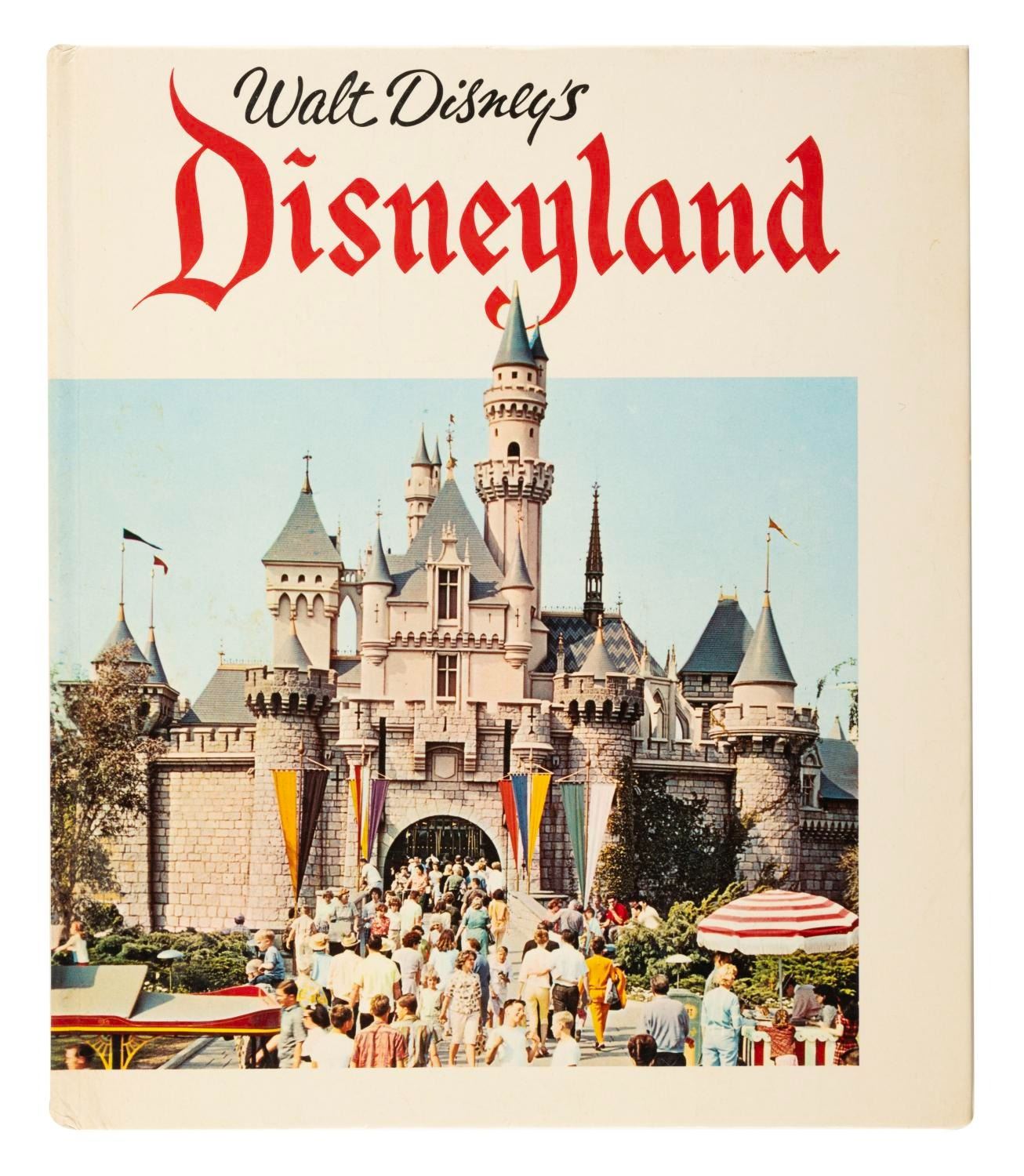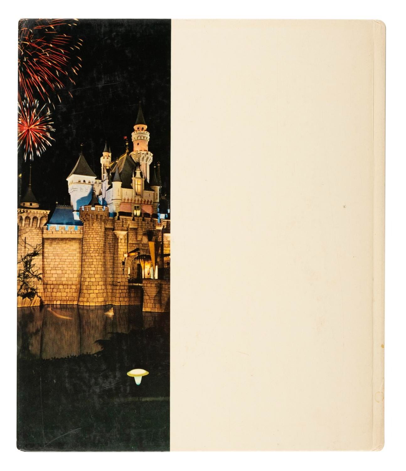 (Disneyland, 1965) A Walt Disney's Disneyland book by Marty Sklar. This 64-page book tells the behind-the-scenes story of the "magic kingdom and the man who made it possible," with colorful images. This book was published while Disneyland was still expanding, briefly referencing the Haunted Mansion, Pirates of the Caribbean, and the new Tomorrowland. Measuring 9.5" x 11", the book is in good condition with discoloration and overall wear, light creasing, smudges, and stains to the cover and pages, and an inscription from a previous owner on the inside cover page.