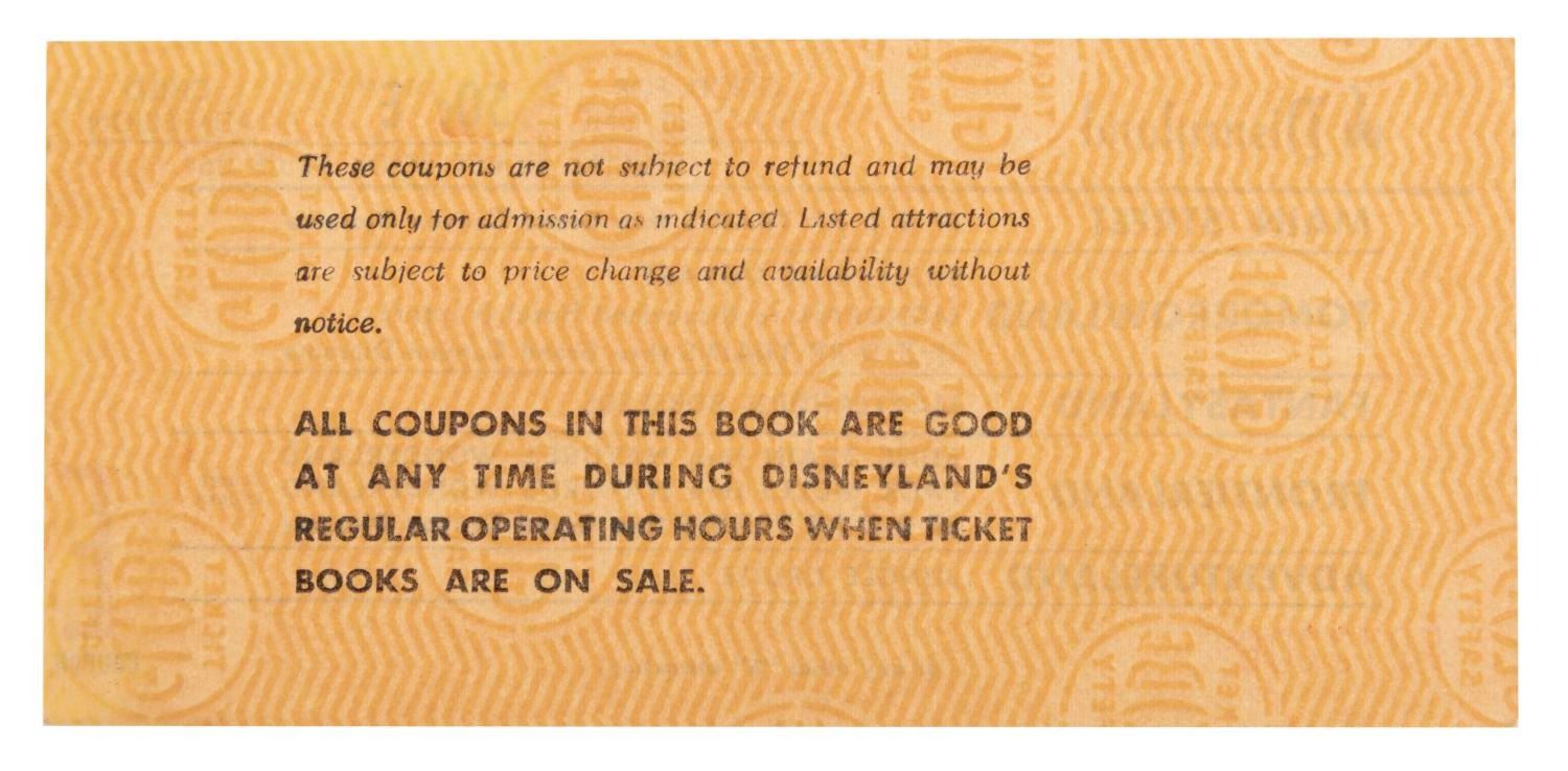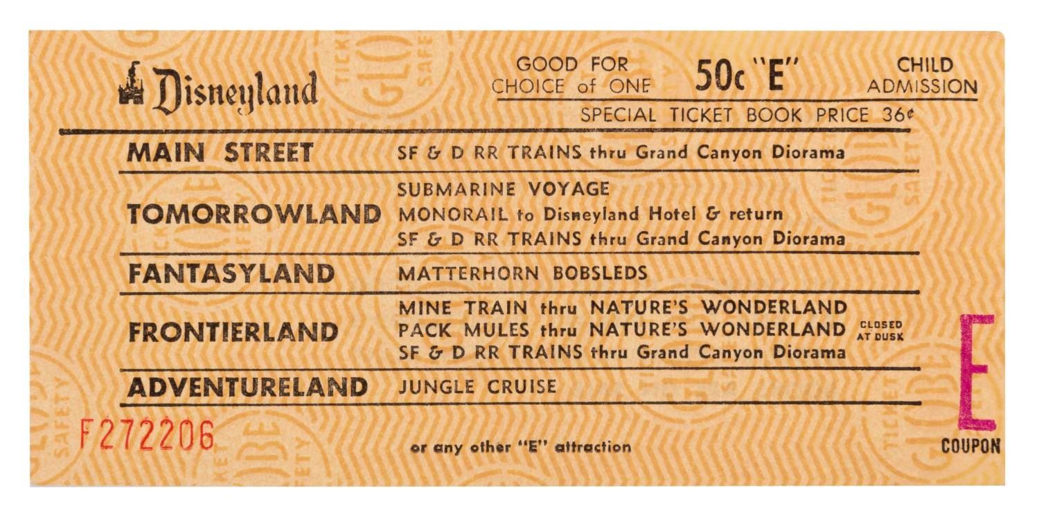 (Disneyland, 1961) A Child admission "E" ticket featuring The Mine Train and Pack Mules thru Nature's Wonderland as the newest attractions to choose from, with a 50-cent value. Measuring 2.5" x 5.5", the ticket is in very good condition with light edge wear.