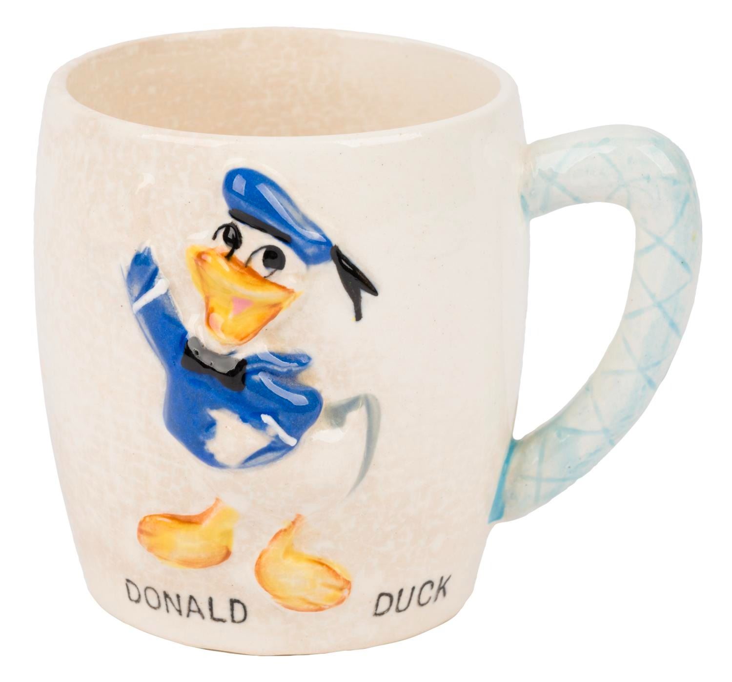 (Disney, 1961) A ceramic 3D relief Donald Duck mug released during the debut season of Walt Disney’s “Wonderful World of Color.” Measuring 3.5” tall and 4.5” in diameter, the mug is in good condition with minor wear and crazing to the glaze throughout.
