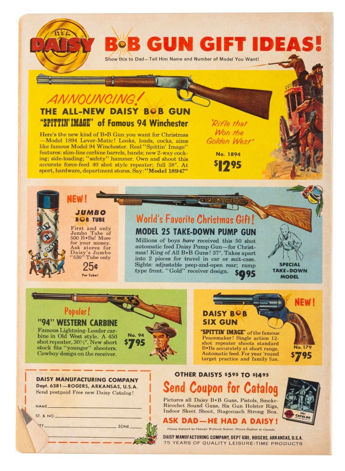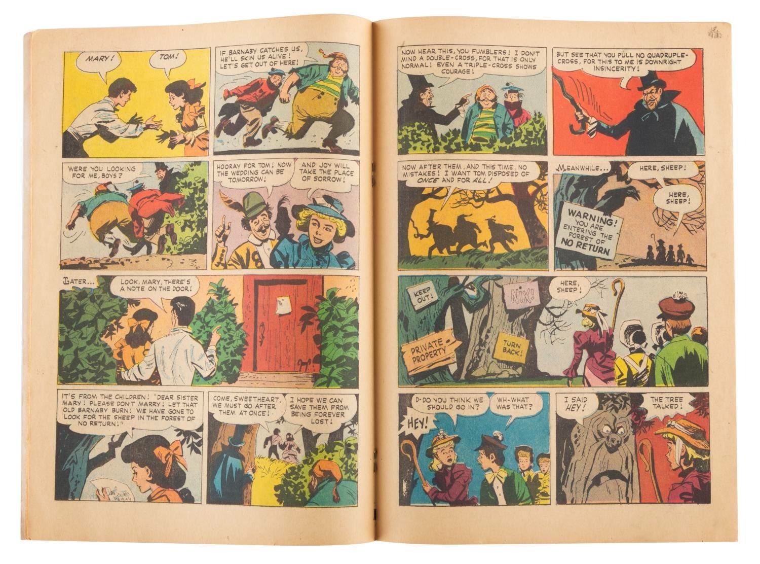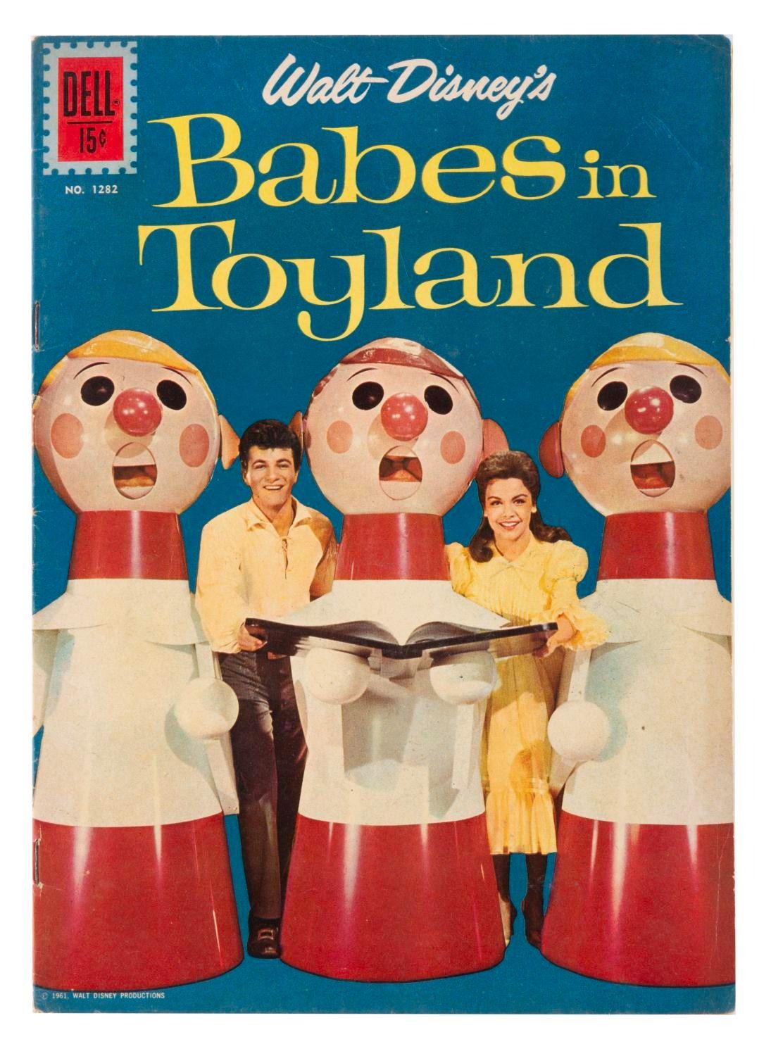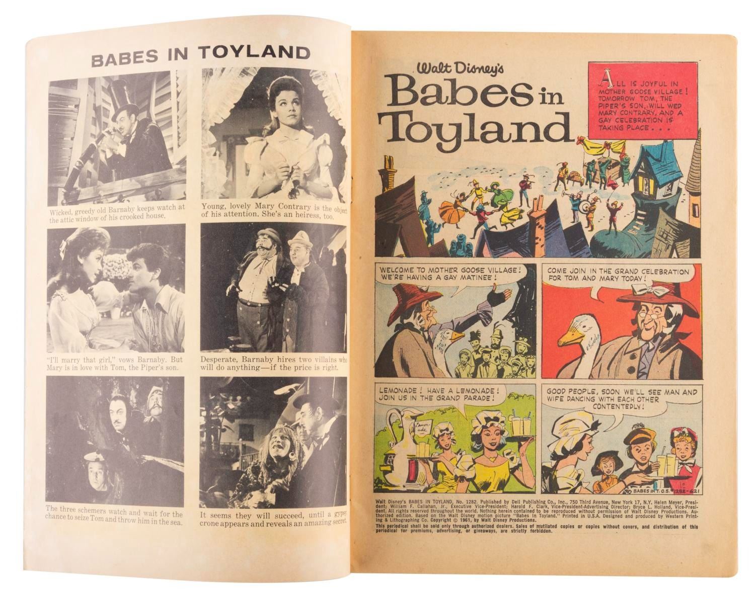 (Dell, 1961) A comic book adaptation of Walt Disney’s “Babes in Toyland.” Measuring 7.25” x 10”, the comic is in good condition, with pages off-white from age as is typical, and light wear to the cover from handling, including small scuffs and soiling, and a 0.75” fold to a back cover corner.