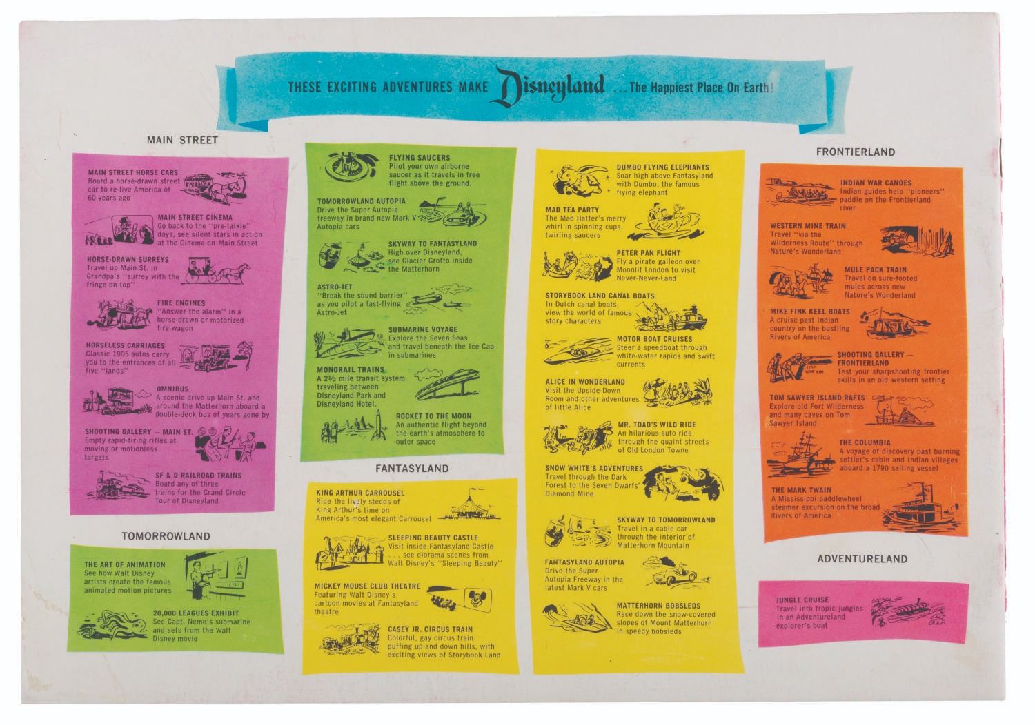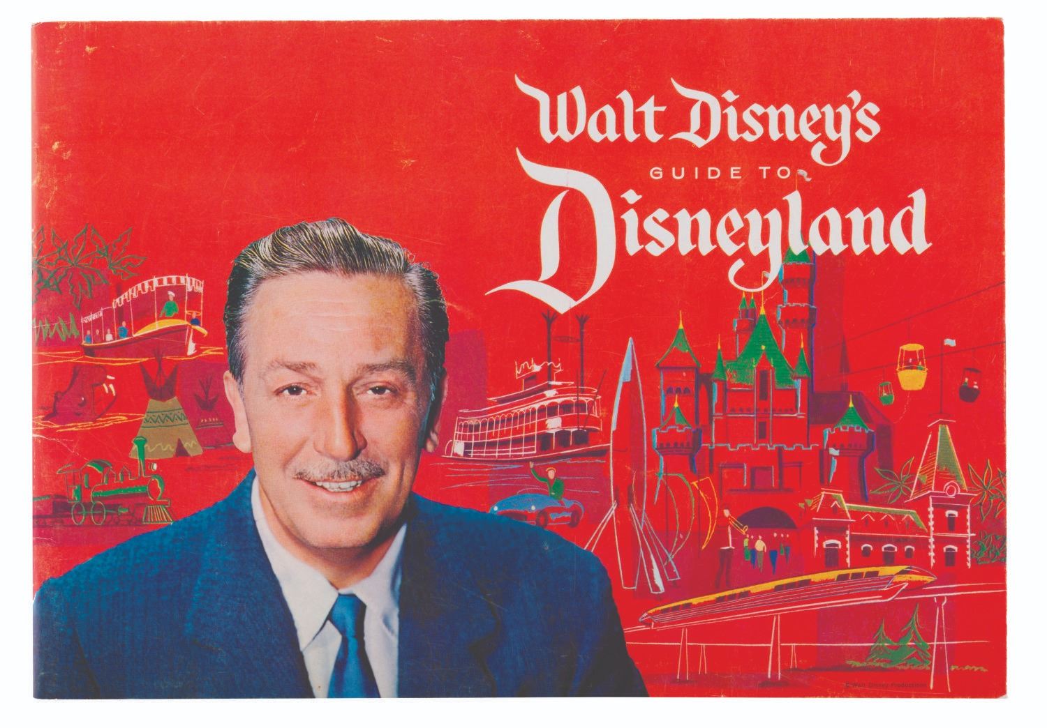 (Disneyland, 1961) An early Walt Disney's Guide to Disneyland. This softcover booklet features colorful images of each land and its attractions, including the Indian Village, Monsanto's House of the Future, America the Beautiful at CirCARama theater, and more. This edition includes a special page about upcoming attractions "The Tree House," "Old New Orleans," "Rogues Gallery," and "The Haunted House." Measuring 8” x 11.5”, the guidebook is in very good condition with handling wear to the edges of the cover.