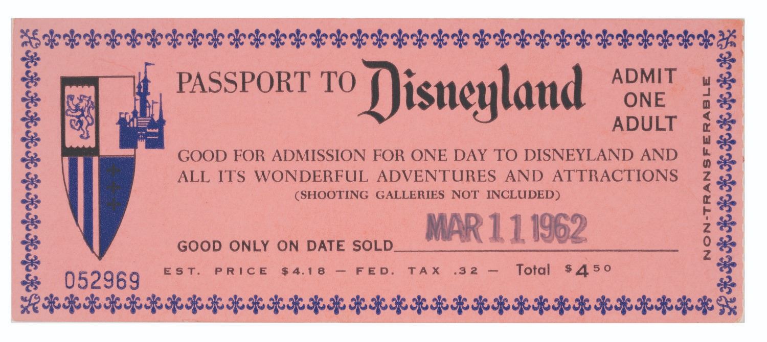 (Disneyland, 1962) An admission Passport to Disneyland. This early adult admission pass carries the admission price ($4.50), is numbered "052969," and is stamped with the date of "Mar. 11, 1962." The pass measures 6"x2.5" and is in very good condition with minimal wear and hand-annotation on its reverse.