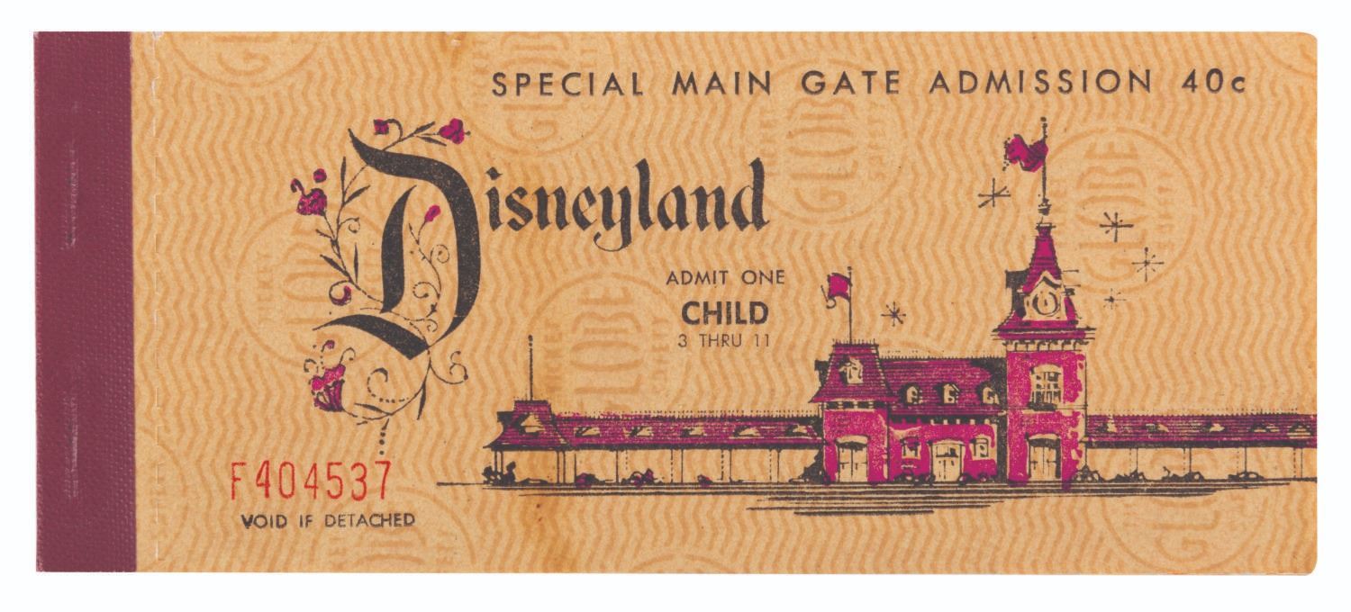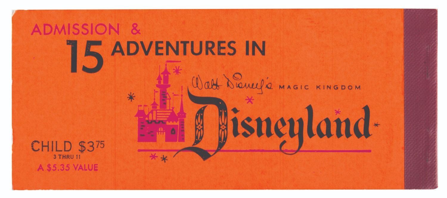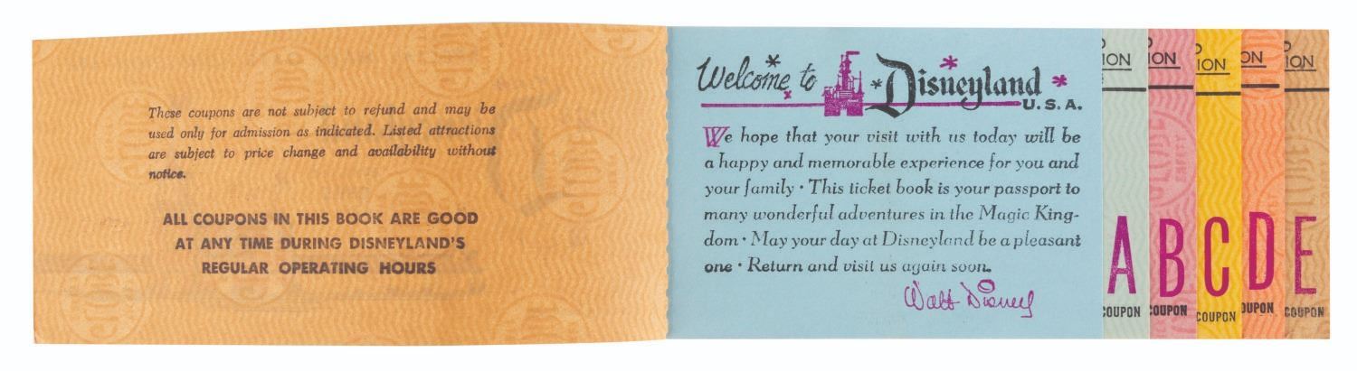 (Disneyland, 1962) A complete Child admission and 15 ticket book from June of 1962. The book includes the front Main Gate Ticket, Welcome to Disneyland tab, 2 “A” tickets, 2 “B” tickets, 3 “C” tickets, 4 “D” tickets, and 4 “E” tickets. Numbered “F404537,” the 2.5” x 6” ticket book is in fine condition with light edge wear to the back cover.