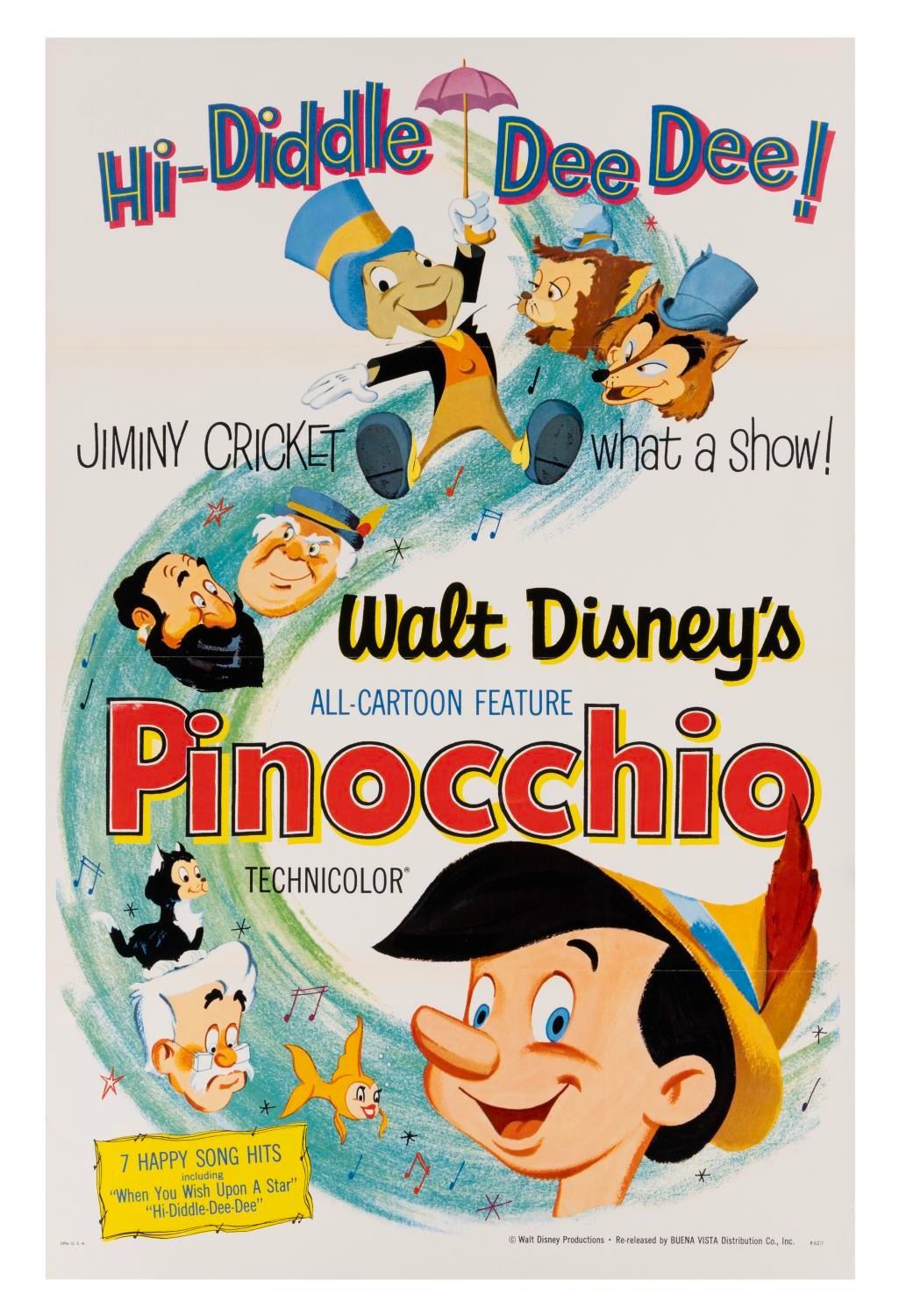 (Disney, 1962) A colorful one-sheet poster for the 1962 re-release of the Disney animated classic, "Pinocchio," originally released in 1940. Measuring 41" x 27", the piece is in good condition with creases from its original folds, handling wear, light discoloration, edge wear, and tears including one to the bottom left and a 0.5" x 0.5" tear to the top right.