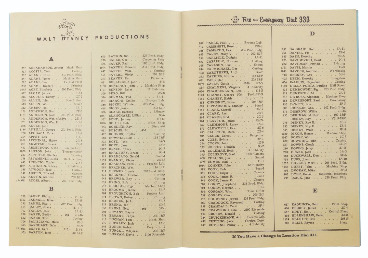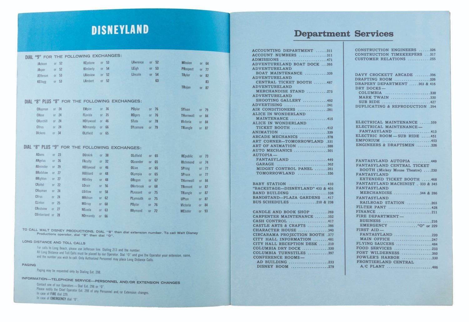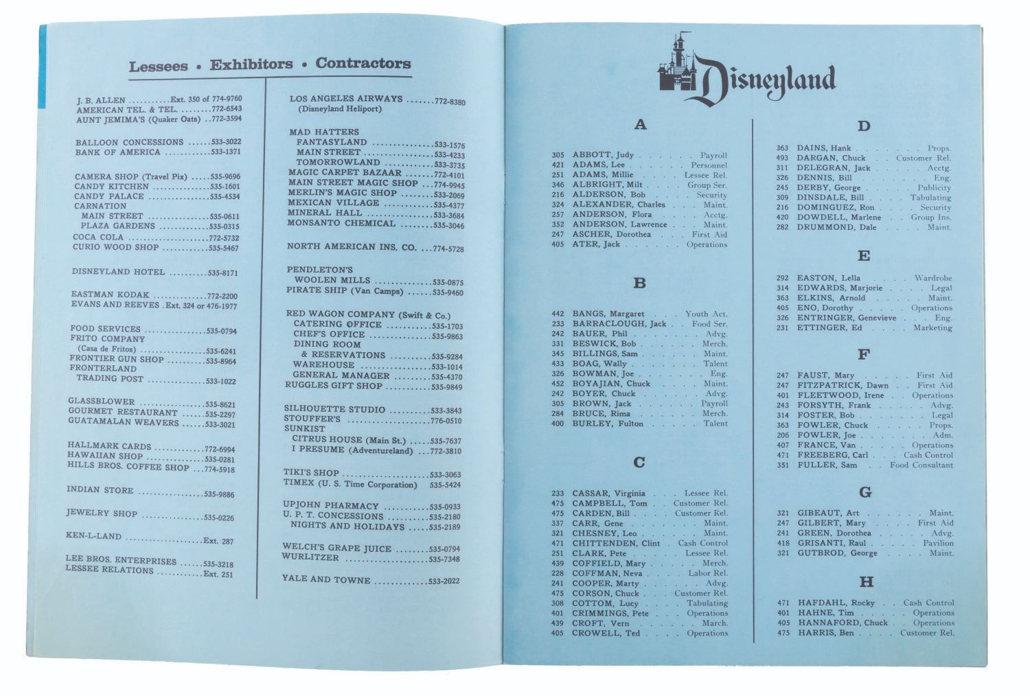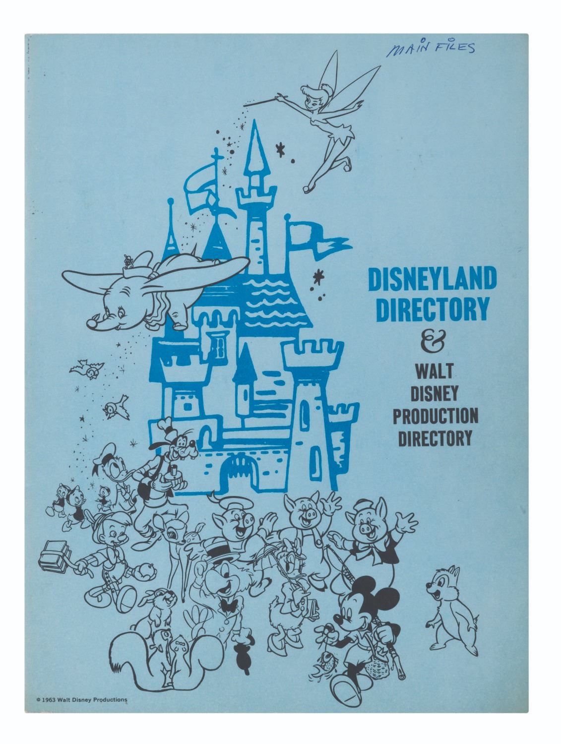 (Disney, 1963) A 1963 Disneyland & Walt Disney Productions Directory of department and Cast Member phone numbers, including Walt Disney himself. Measuring 8.25" x 11", the directory is in good condition with edge wear, discoloration from age, and ink inscriptions on the front cover.