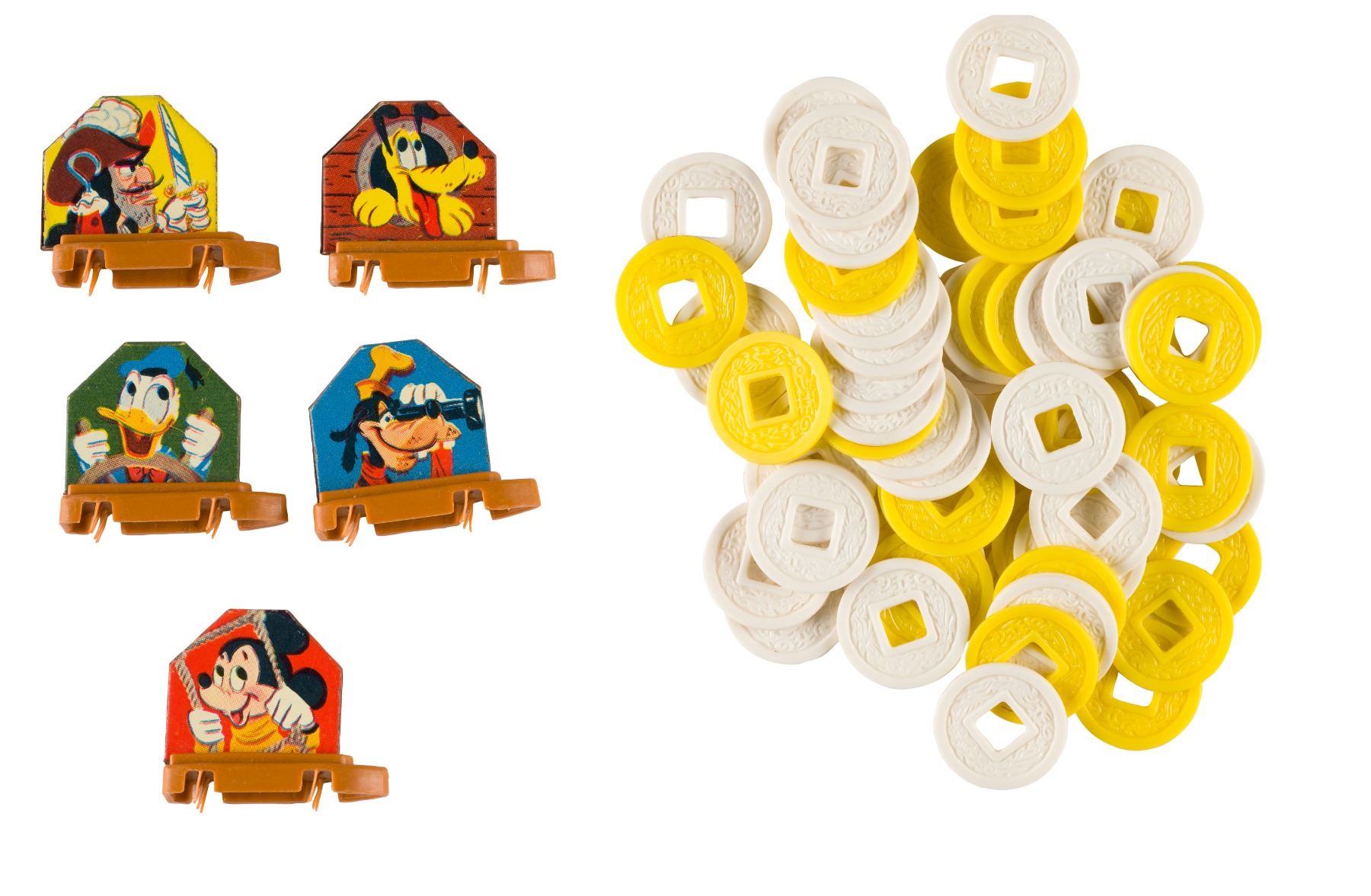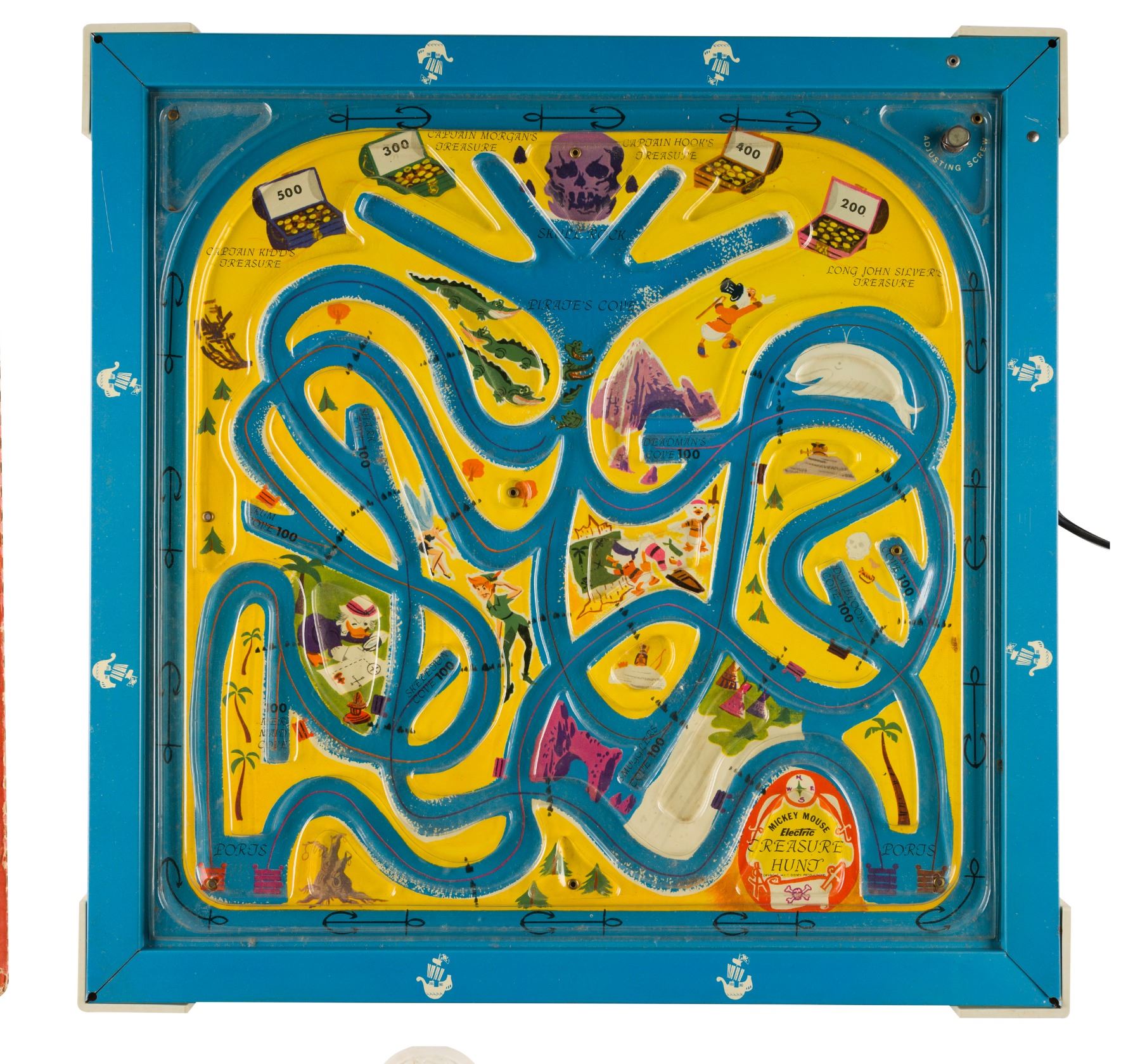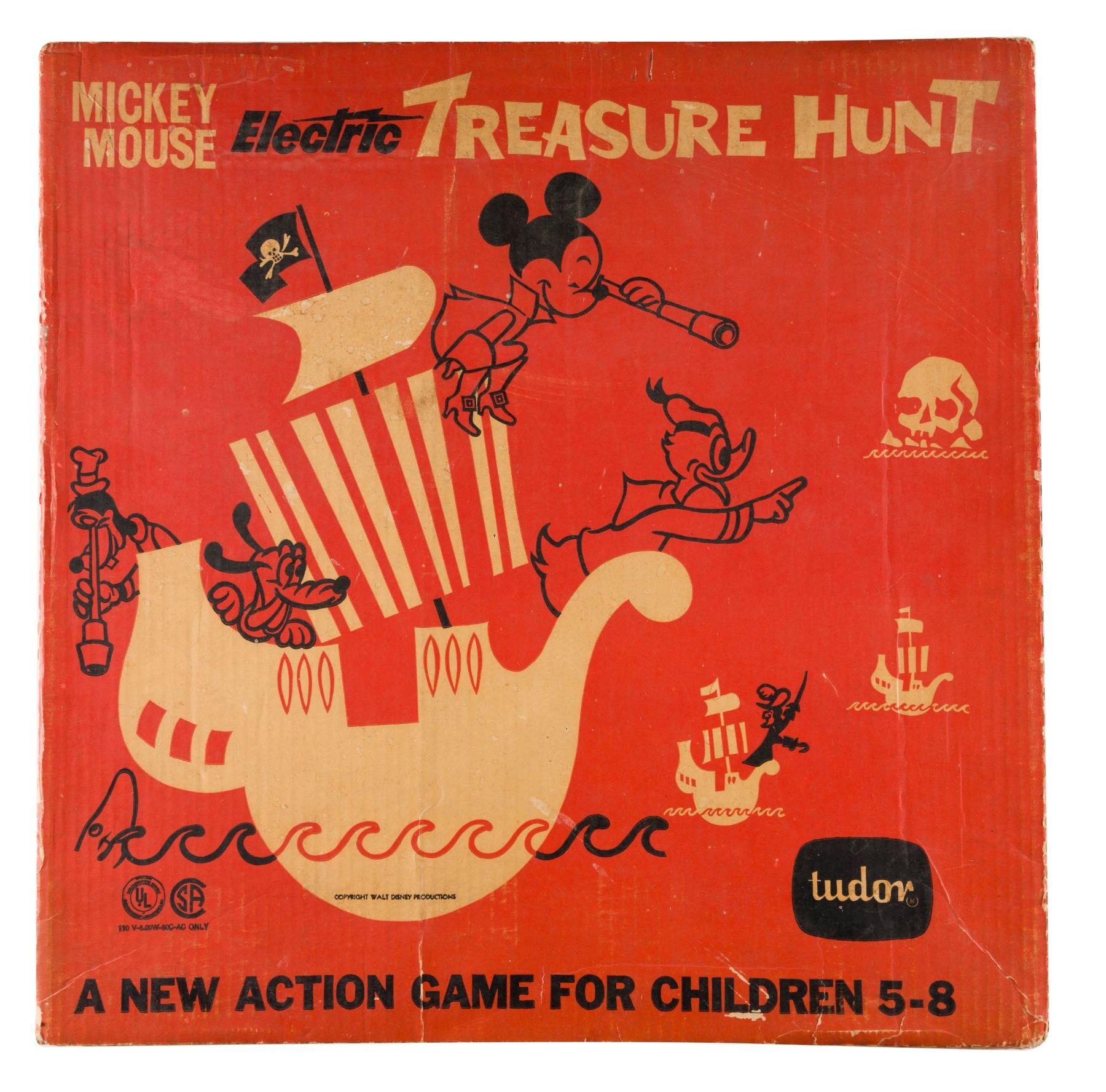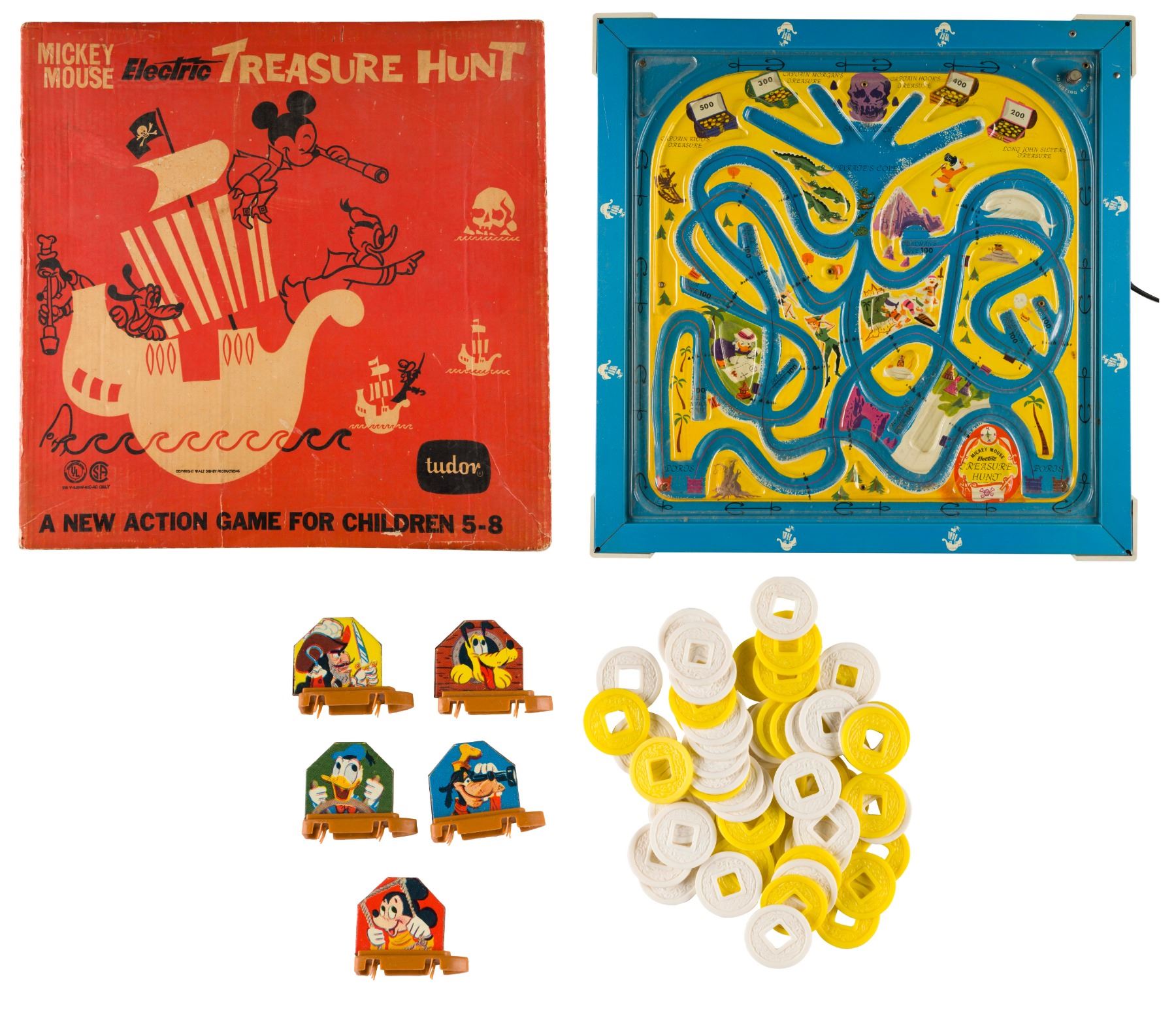 (Tudor, 1963) a Mickey Mouse Electric Treasure Hunt Game with the original box. Boats glide around the board to collect treasure as Captain Hook's ship prowls. The game operates through plug-in electric vibrations and has been tested as functioning properly. Measuring 19.5" x 19.5" x 1.75" the tin-litho and plastic game comes complete with five boats and multiple plastic coins and is in very good condition with one scratch and slight marks from use, and light oxidation along the lower outer edge. The 20" x 20" x 2" cardboard box is in good condition with expected wear, and marker drawn on the inside lid.