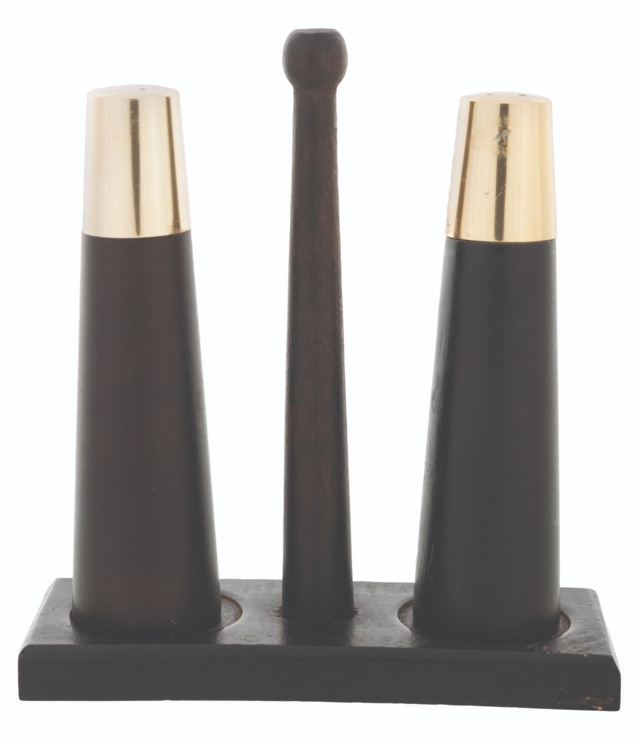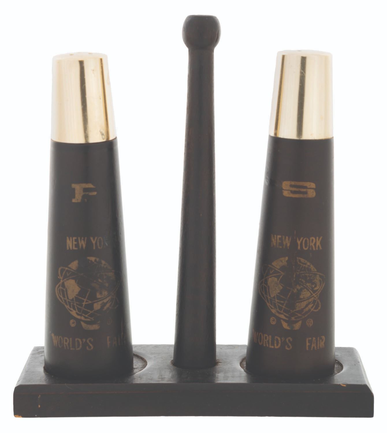 (World's Fair, 1964-64) A pair of salt and pepper shakers from the 1964-65 New York World's Fair. The wood and metal shakers measure 4" tall and 1" in diameter, and the base is 5"x4.25"x1.75". Each piece displays in good condition, exhibiting scuffs, scratches, and wear, retaining their original plugs.
