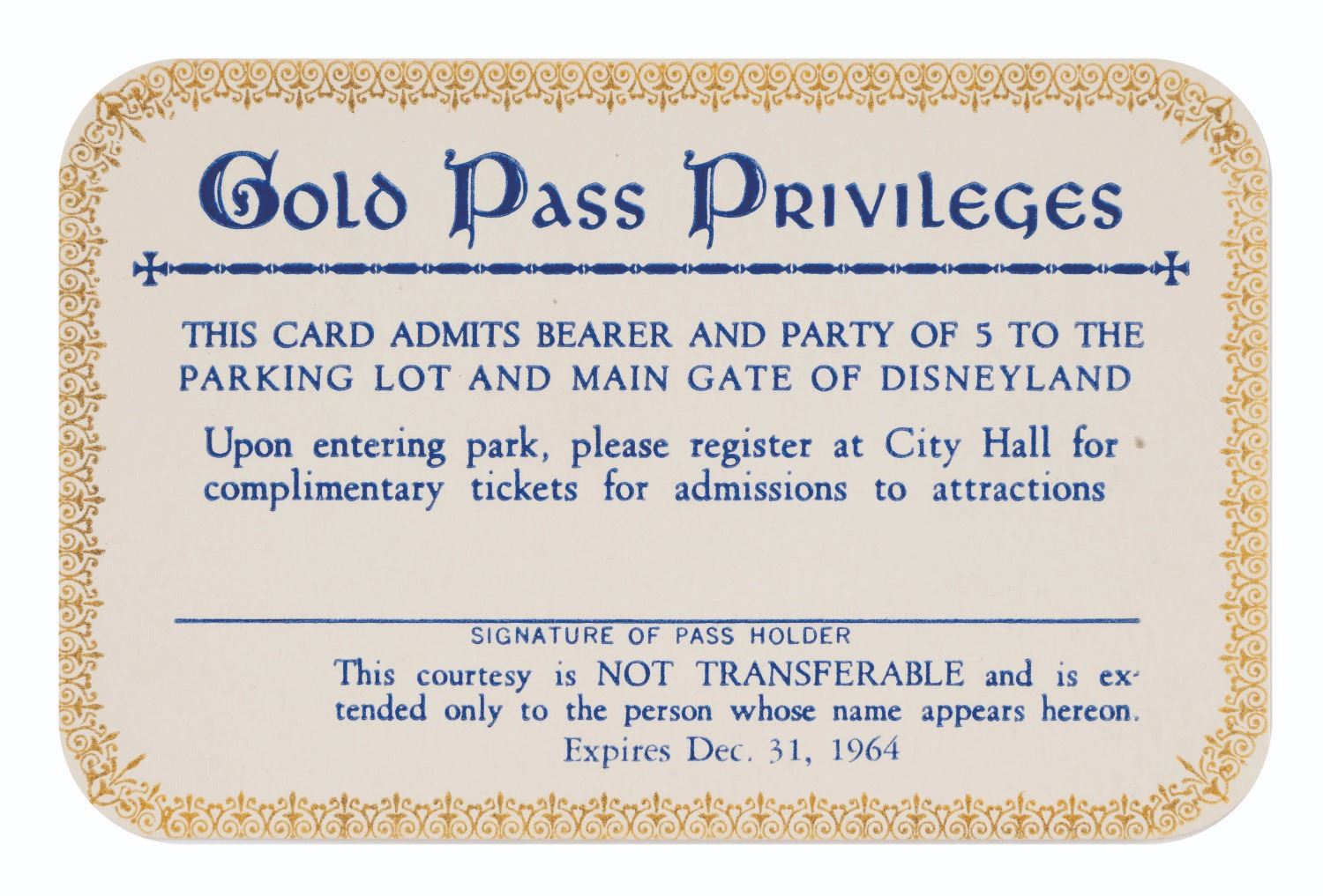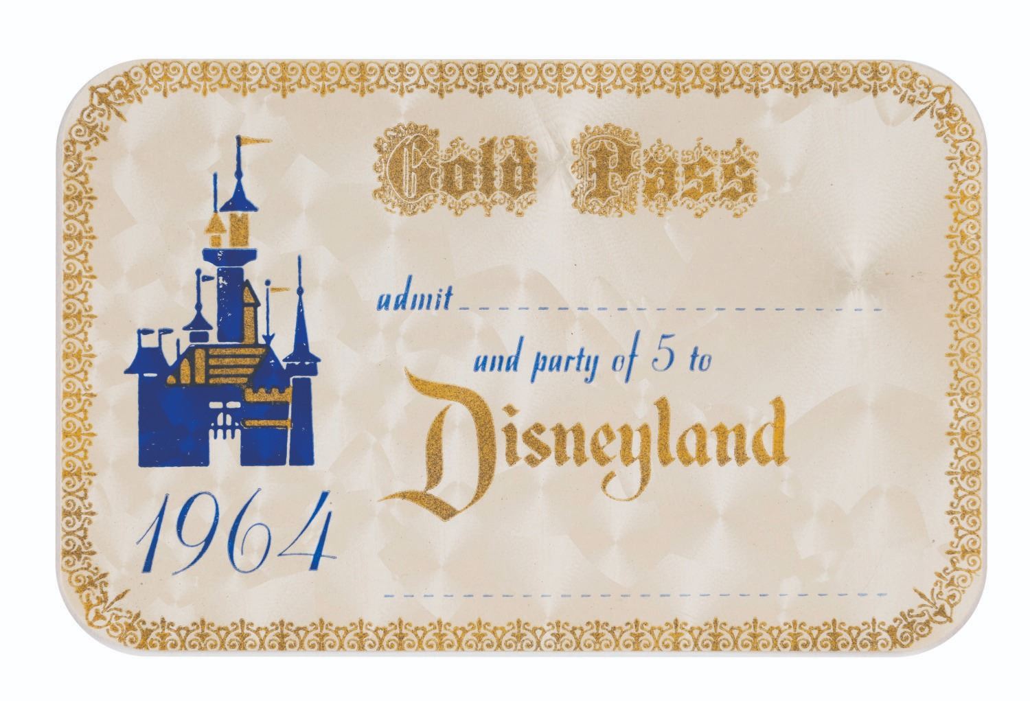 (Disneyland, 1964) An original Disneyland Gold Main Gate Admission Pass from 1964. This Pass was valid for an entire year, was issued to Walt Disney Productions Employees and Special Guests, and admitted the bearer and up to five guests into the park. Measuring 4"x2.5", this pass is in fine condition.