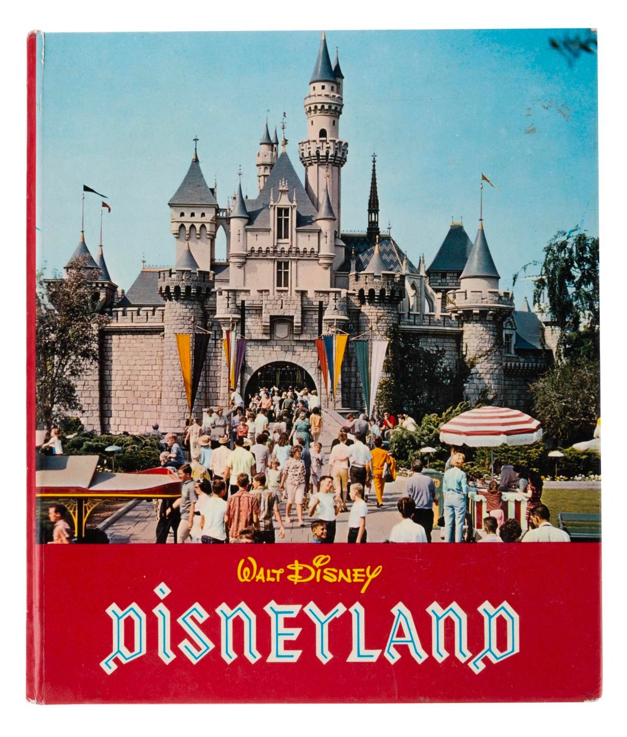 (Disneyland, 1964) A "Walt Disney Disneyland" book written by Marty Skylar. This popular hardcover book features more than 50 photos and illustrations, as well as anecdotes and stories about the Imagineering and development of the Park. Measuring 9.25" x 11", the book is in good condition with wear to corners, scuffs to the cover, pen marks on one page, and a name written in the front.