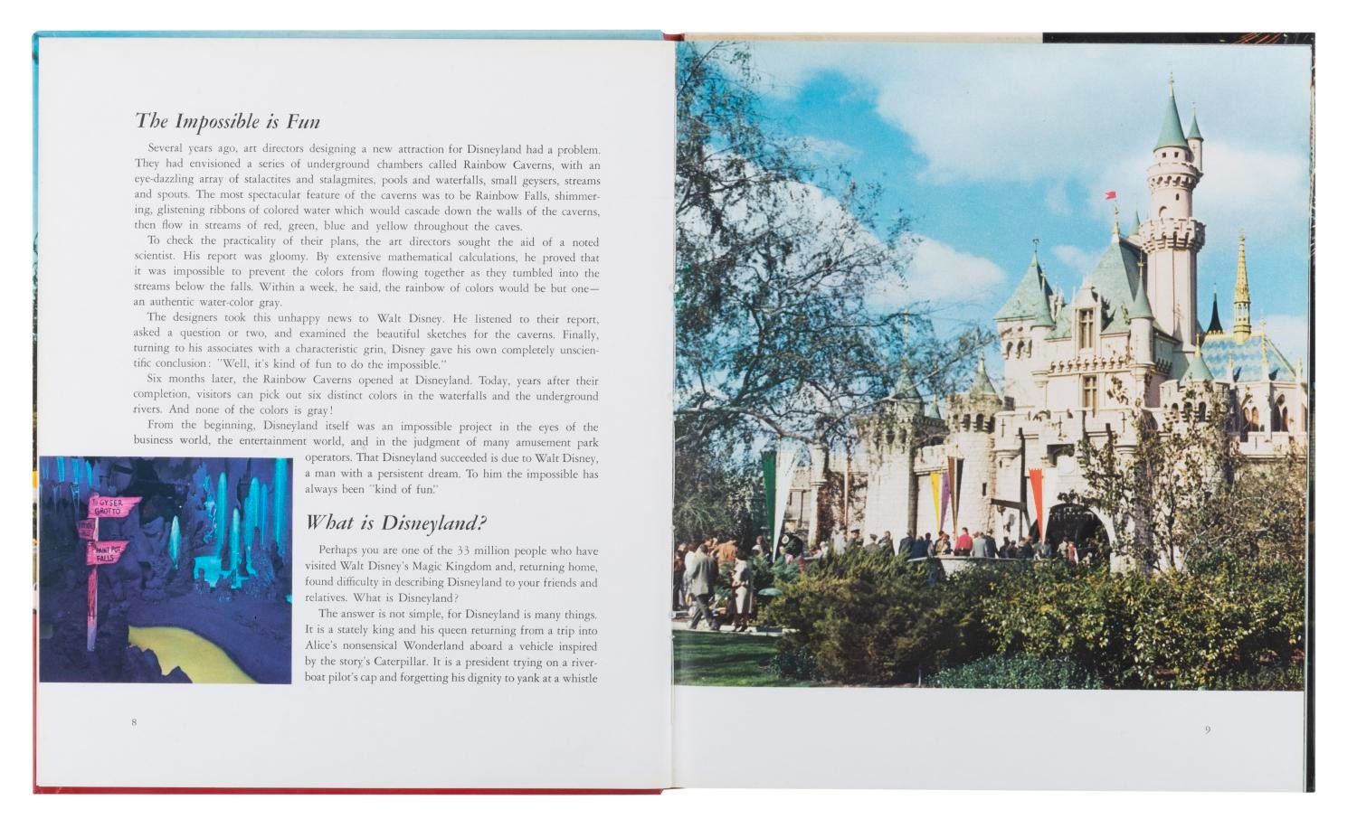 (Disneyland, 1964) A Walt Disney Disneyland book written by Marty Skylar. This popular hardcover book features more than 50 photos and illustrations, along with anecdotes and stories about the Imagineering and development of the Park. Measuring 9.25” x 11”, the 60-page hardcover book displays in very good condition with light wear to the corners.