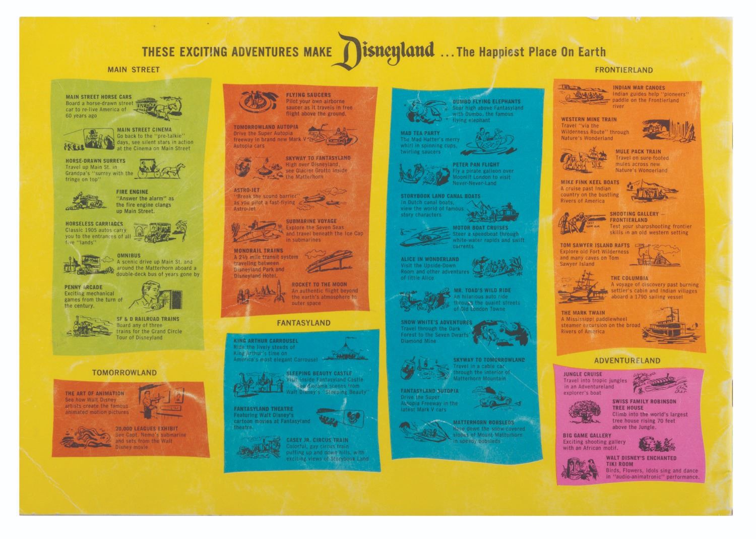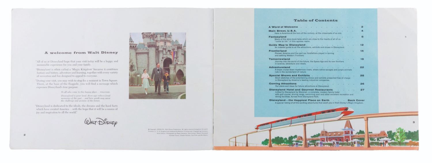 (Disneyland, 1964) An early guidebook from Disneyland titled, "Walt Disney's Disneyland - A Pictorial Souvenir." This softcover booklet features sections with colorful images of each land and its attractions, including Snow White Grotto presented by International Variety Clubs, Flying Saucers, America the Beautiful at CirCARama theater, and more. This edition includes a special page about the fabulous Disneyland Hotel and another page about the coming attractions "Old New Orleans Square," "The Haunted Mansion," and "Pirates of the Caribbean." This 27-page guidebook measures 8.75"x11.75" and is in good condition exhibiting fading, creases, and wear.